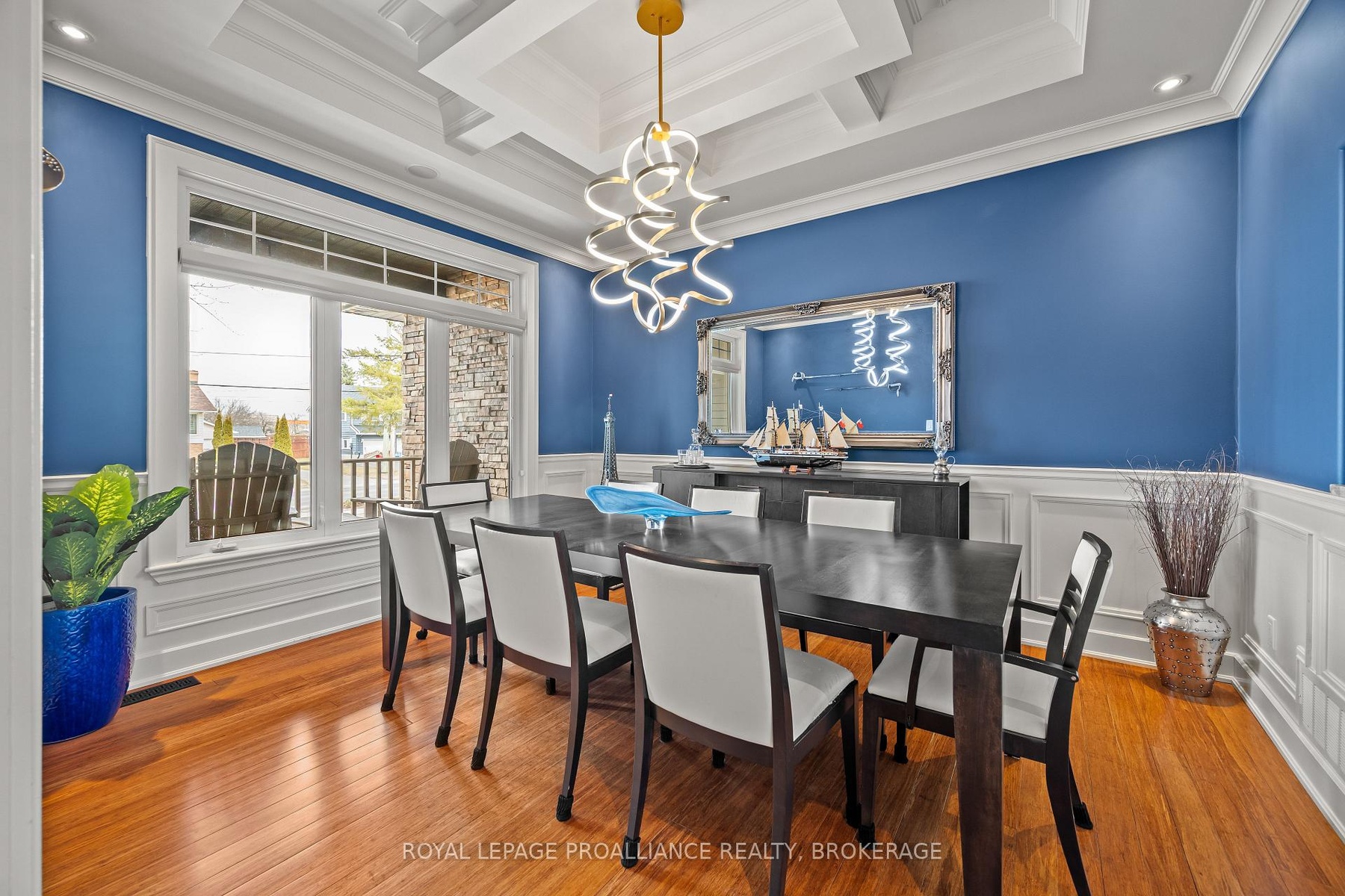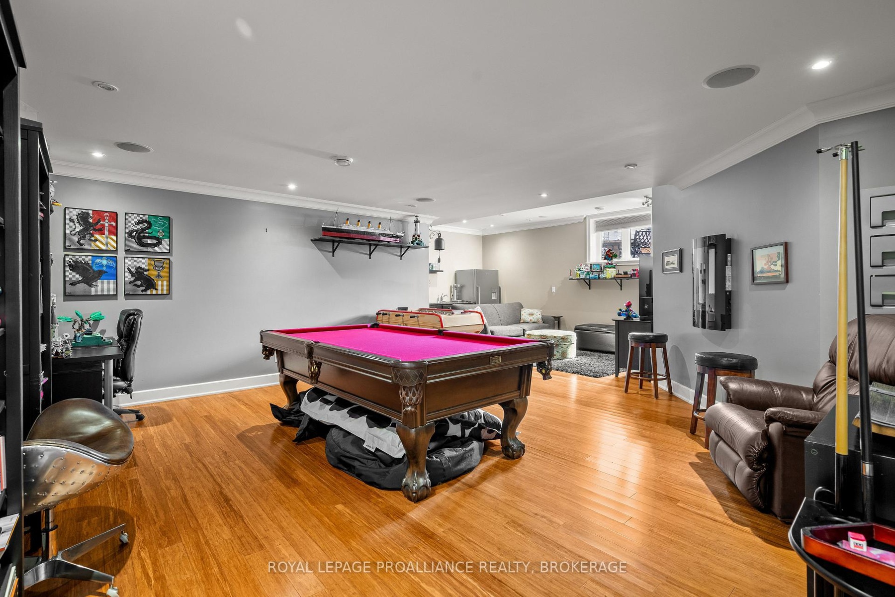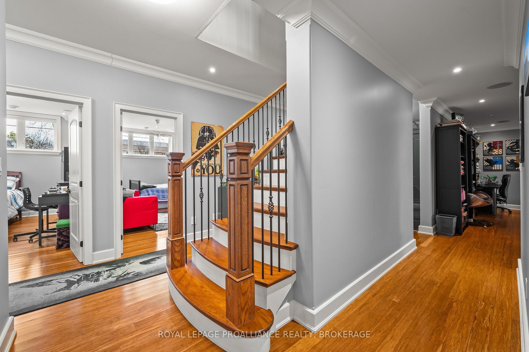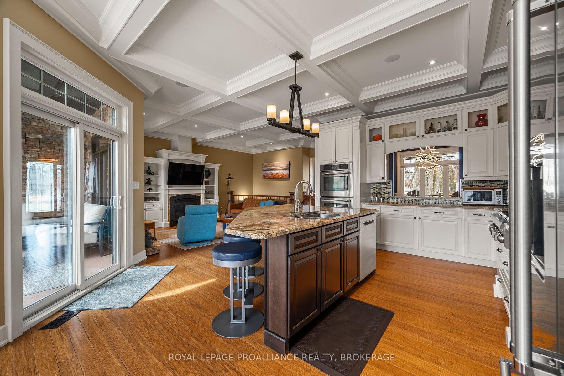 Executive custom-built elevated bungalow in the highly sought-after Westwoods neighbourhood, known for its excellent school district & established surroundings. This meticulously maintained home showcases jaw-dropping finishes throughout, including coffered ceilings, wainscotting, crown moulding, soaring ceilings, custom built-in detailed trimwork, & upgraded light fixtures throughout. The heart of the home is a stunning chef's kitchen featuring a massive granite island with breakfast bar, premium appliances (Thermador gas stove, Jennair built-in oven) & eat-in area, seamlessly flowing into a spacious & elegant living area with a gas fireplace. A stunning Lanai with skylights & multiple access points offers the perfect place to unwind, while built-in ceiling speakers on both levels of the home elevate everyday living & entertaining. The primary suite is a retreat of its own host to a massive walk-in closet with built-ins, & spa-like ensuite. The main floor is finished off with 2 additional generously sized bedrooms, a full bathroom, a main floor laundry room & a 2pc powder room. The fully finished basement adds incredible versatility with 3 additional bedrooms, a full bathroom, a dry sauna, custom gym, & a wet bar within the spacious recreation area. The backyard is a private oasis, complete with an inground heated saltwater pool & hot tub (2021), while the front yard benefits from an inground irrigation system. Car enthusiasts & hobbyists will appreciate the monstrous custom attached garage that accommodates 3 cars (2 in tandem & 1 on the side), featuring a commercial-grade door, epoxy flooring, metal-clad walls & ceiling, storage loft, & a rear roll-up door providing direct backyard access, truly a rare & impressive space that must be seen to be appreciated. A standout offering combining craftsmanship, functionality, & lifestyle in one of Kingston's most desirable communities.