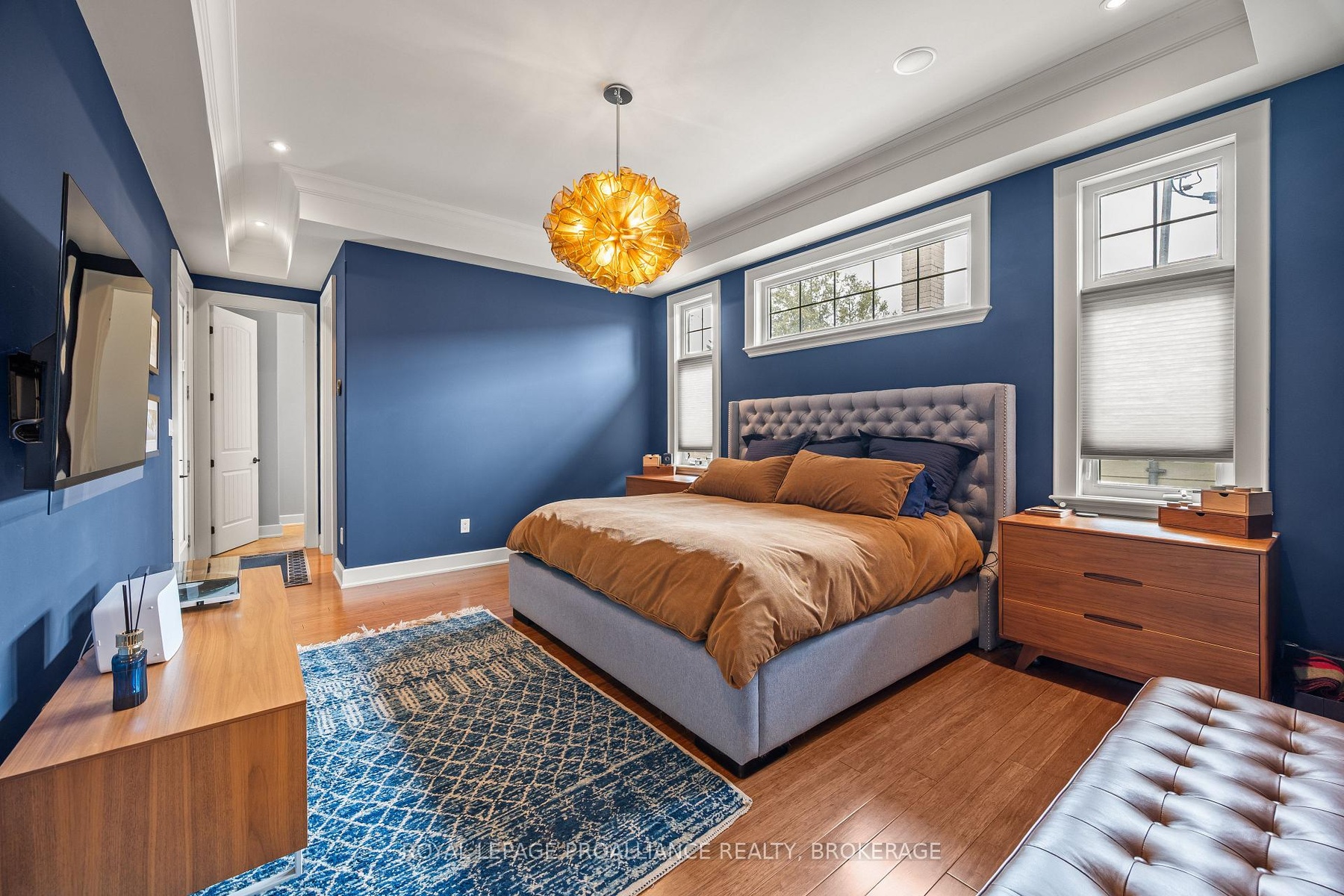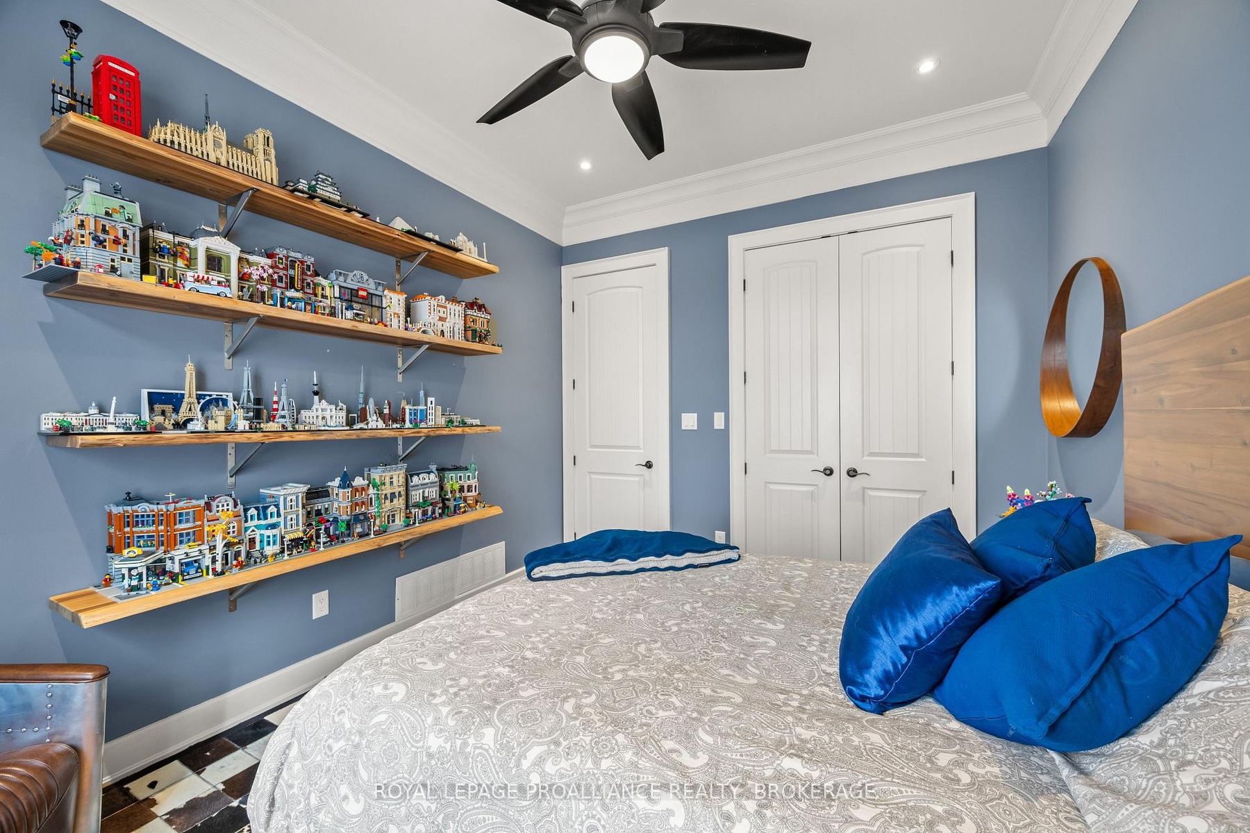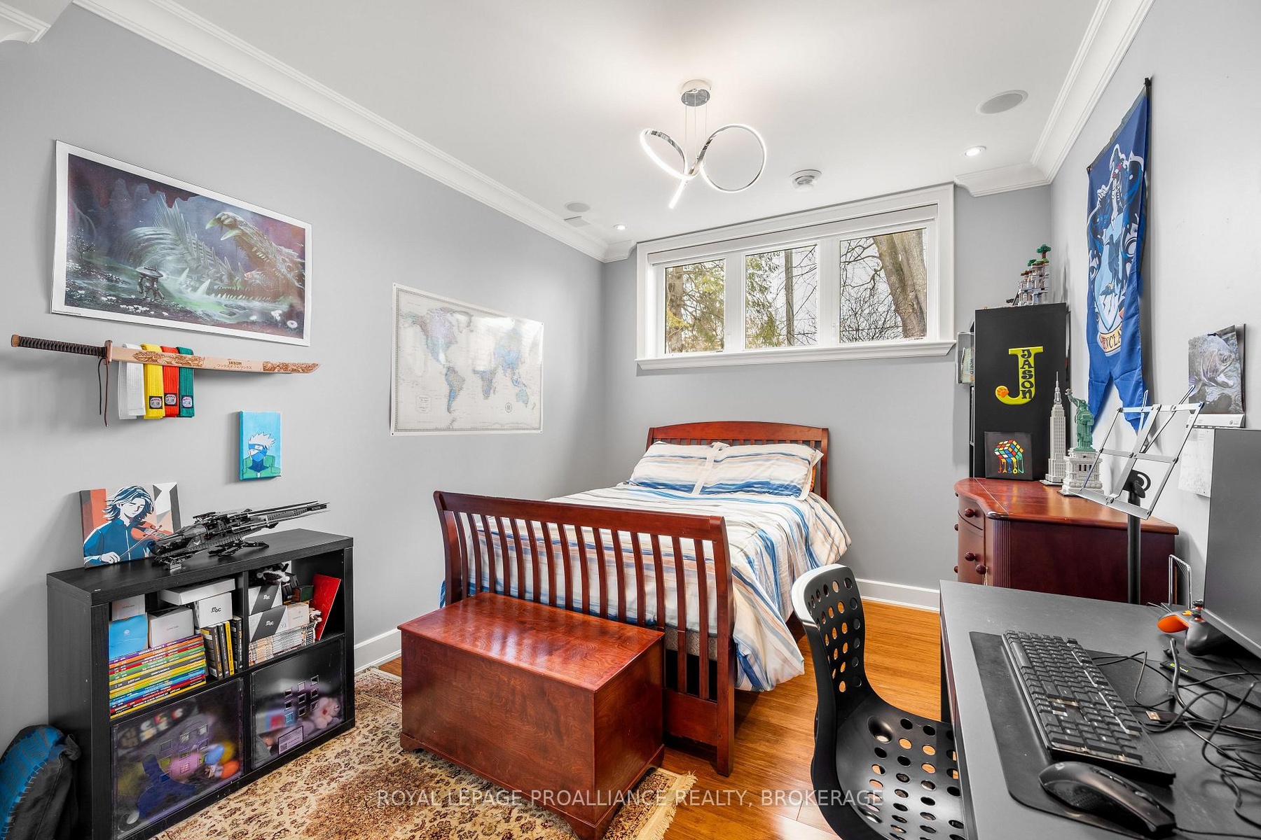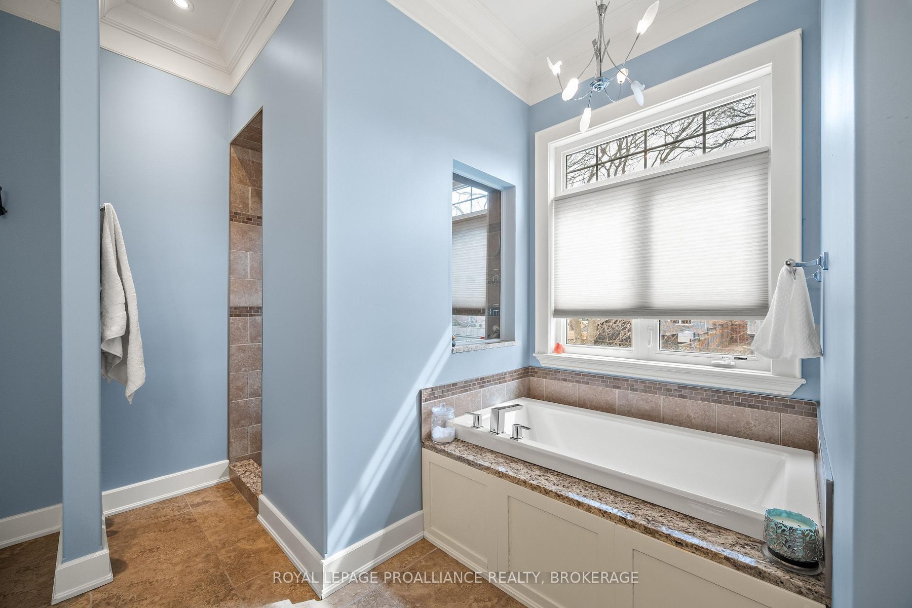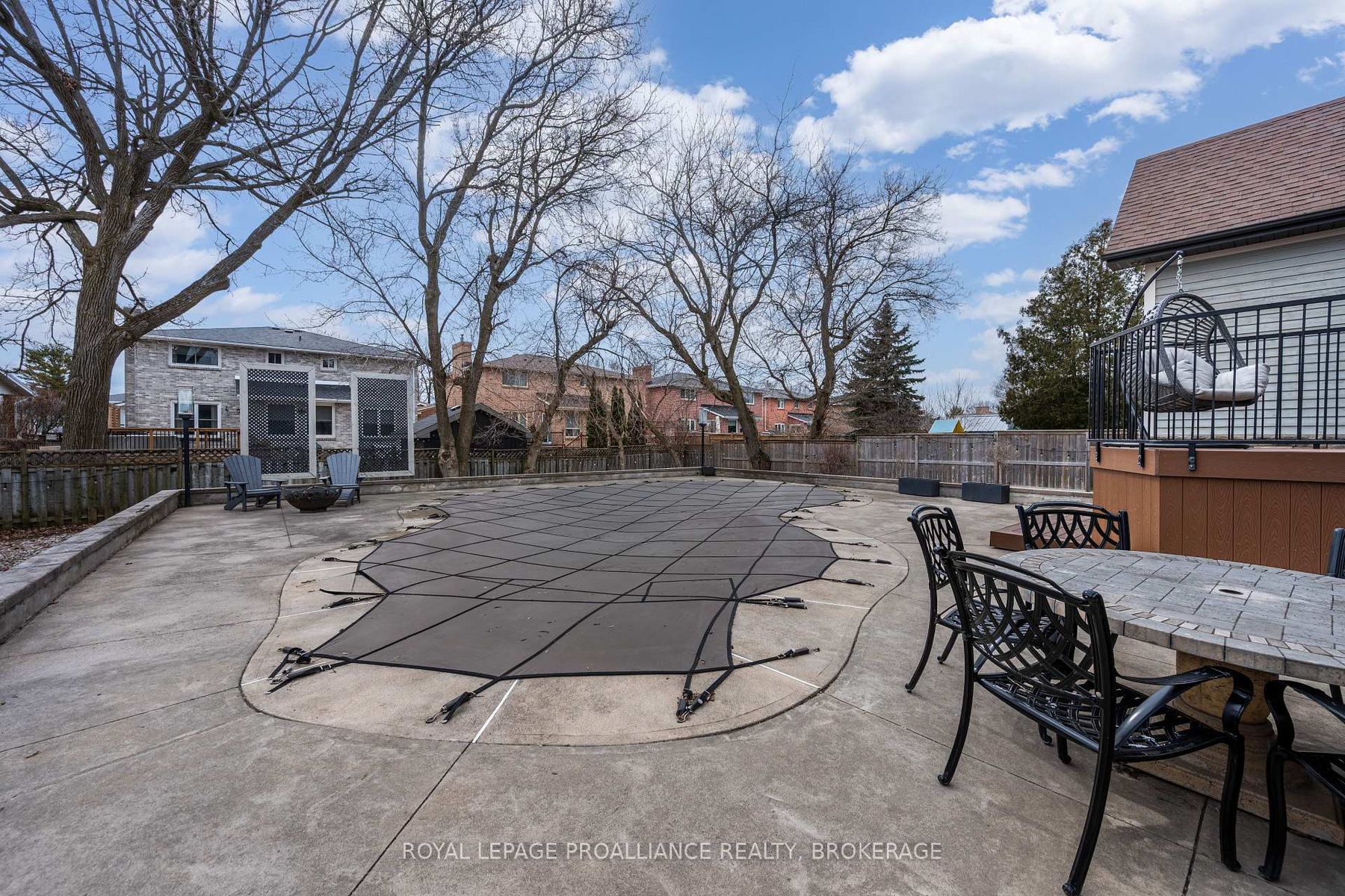 Executive custom-built elevated bungalow in the highly sought-after Westwoods neighbourhood, known for its excellent school district & established surroundings. This meticulously maintained home showcases jaw-dropping finishes throughout, including coffered ceilings, wainscotting, crown moulding, soaring ceilings, custom built-in detailed trimwork, & upgraded light fixtures throughout. The heart of the home is a stunning chef's kitchen featuring a massive granite island with breakfast bar, premium appliances (Thermador gas stove, Jennair built-in oven) & eat-in area, seamlessly flowing into a spacious & elegant living area with a gas fireplace. A stunning Lanai with skylights & multiple access points offers the perfect place to unwind, while built-in ceiling speakers on both levels of the home elevate everyday living & entertaining. The primary suite is a retreat of its own host to a massive walk-in closet with built-ins, & spa-like ensuite. The main floor is finished off with 2 additional generously sized bedrooms, a full bathroom, a main floor laundry room & a 2pc powder room. The fully finished basement adds incredible versatility with 3 additional bedrooms, a full bathroom, a dry sauna, custom gym, & a wet bar within the spacious recreation area. The backyard is a private oasis, complete with an inground heated saltwater pool & hot tub (2021), while the front yard benefits from an inground irrigation system. Car enthusiasts & hobbyists will appreciate the monstrous custom attached garage that accommodates 3 cars (2 in tandem & 1 on the side), featuring a commercial-grade door, epoxy flooring, metal-clad walls & ceiling, storage loft, & a rear roll-up door providing direct backyard access, truly a rare & impressive space that must be seen to be appreciated. A standout offering combining craftsmanship, functionality, & lifestyle in one of Kingston's most desirable communities.