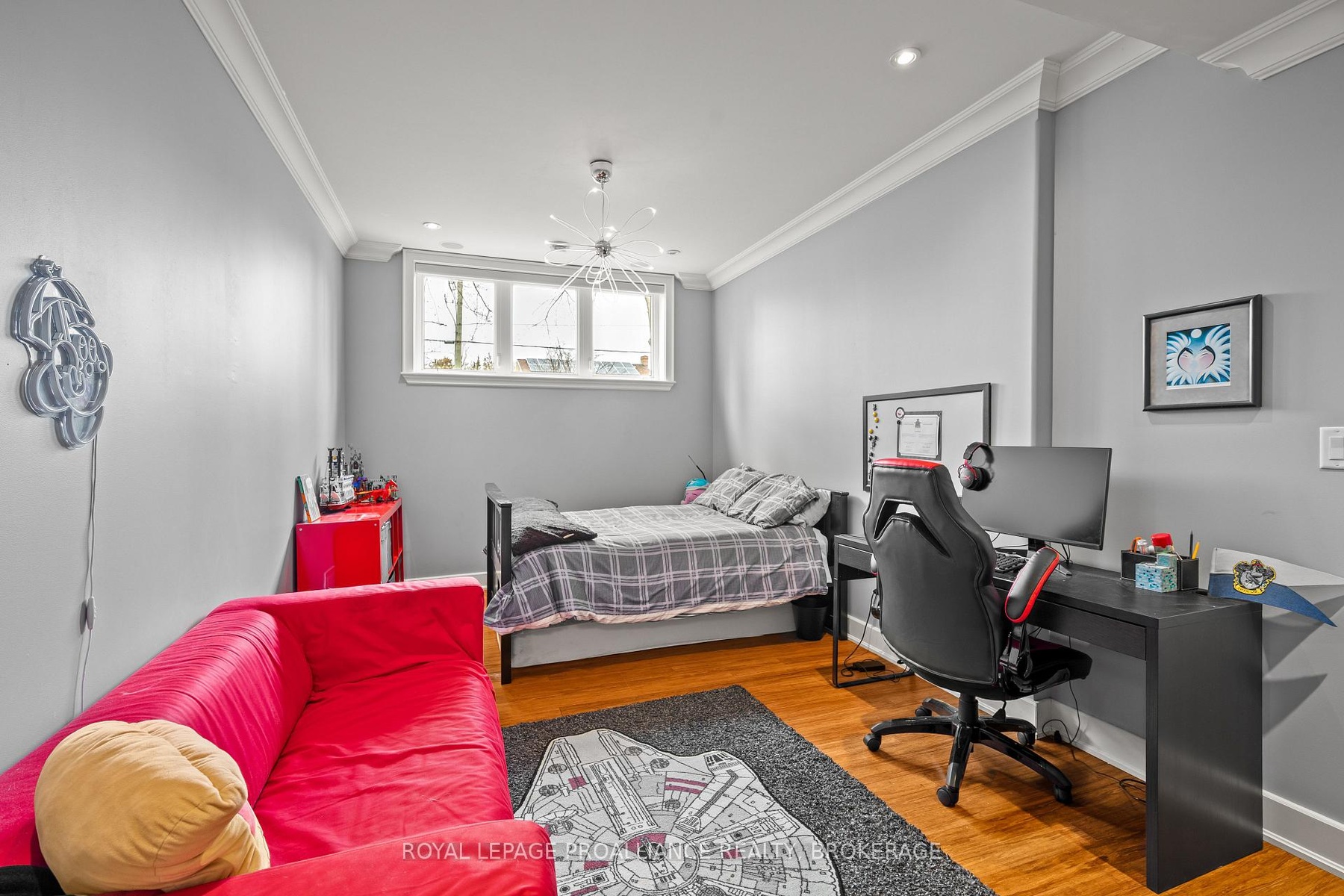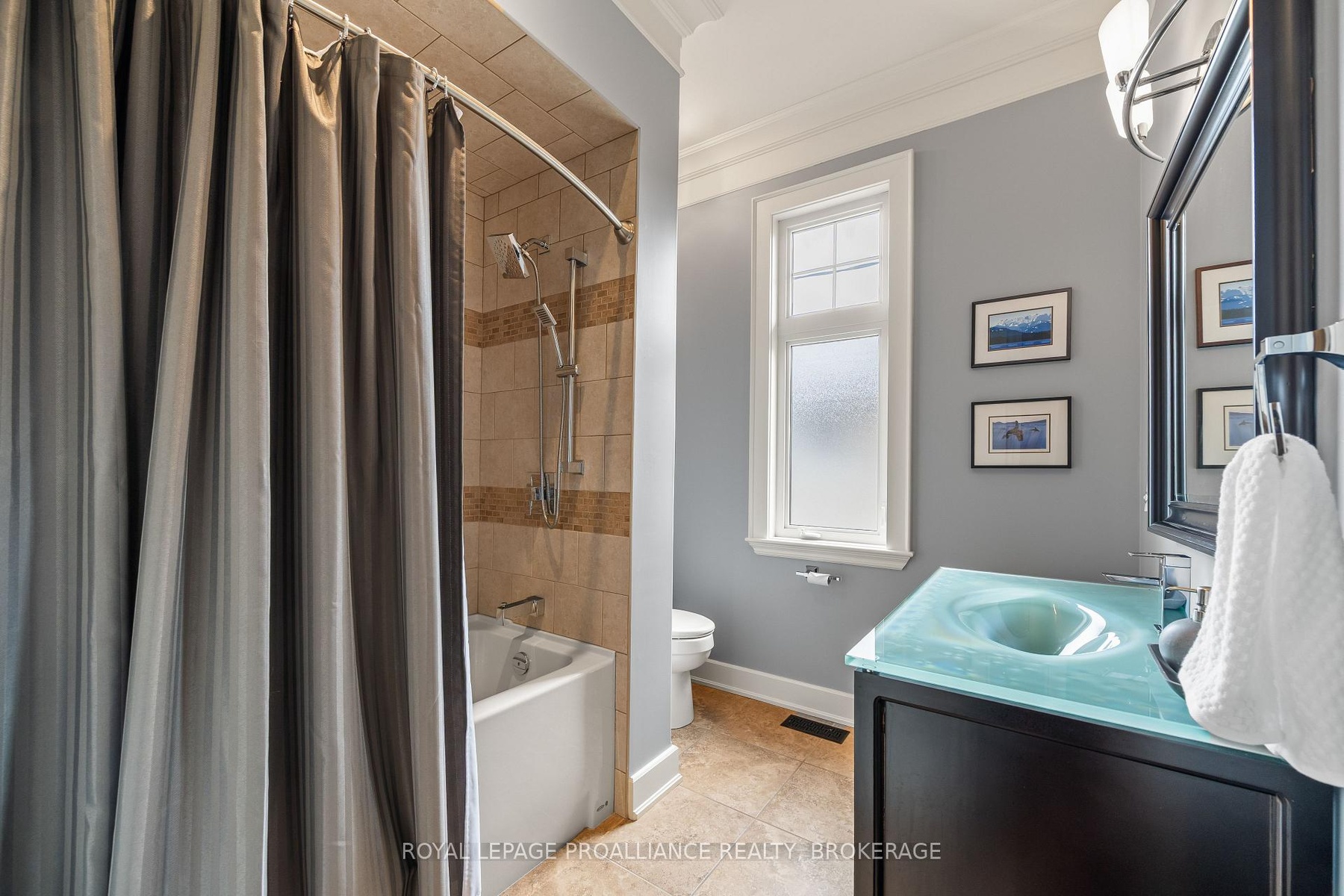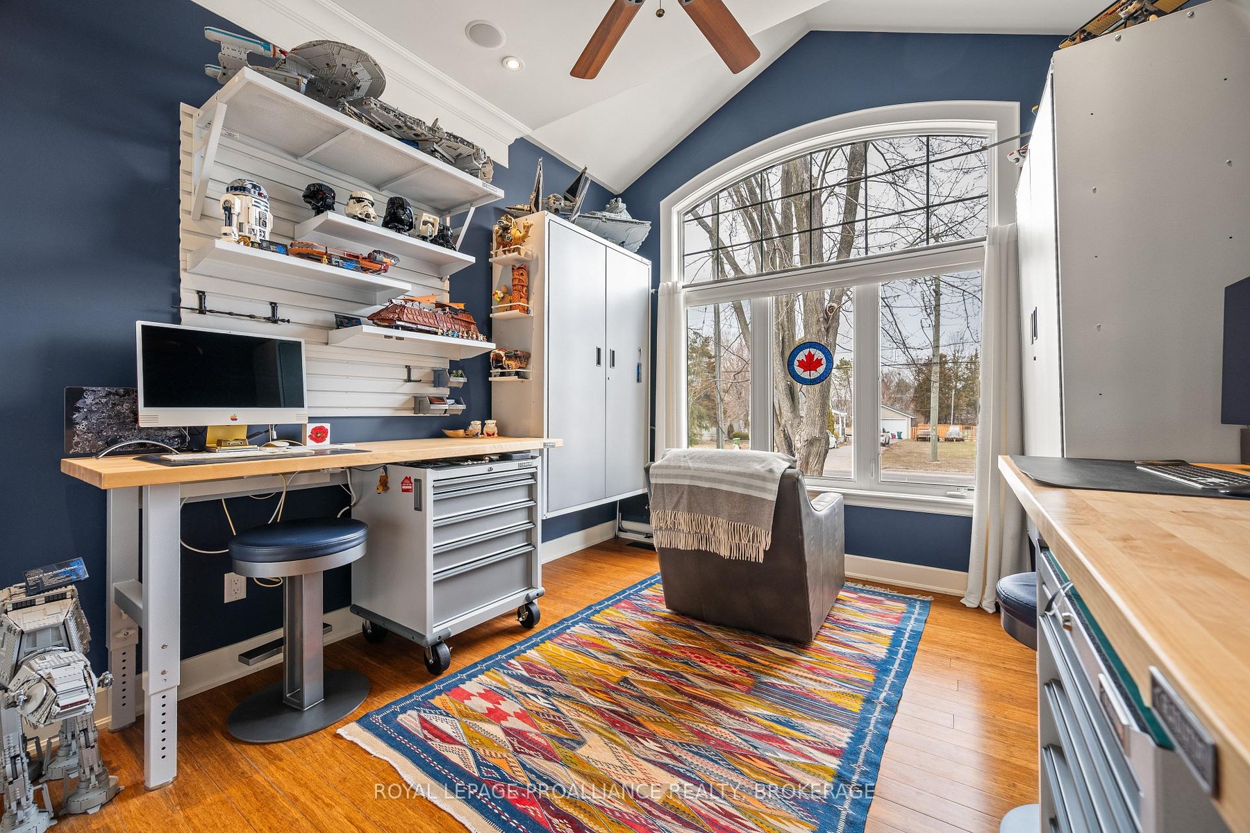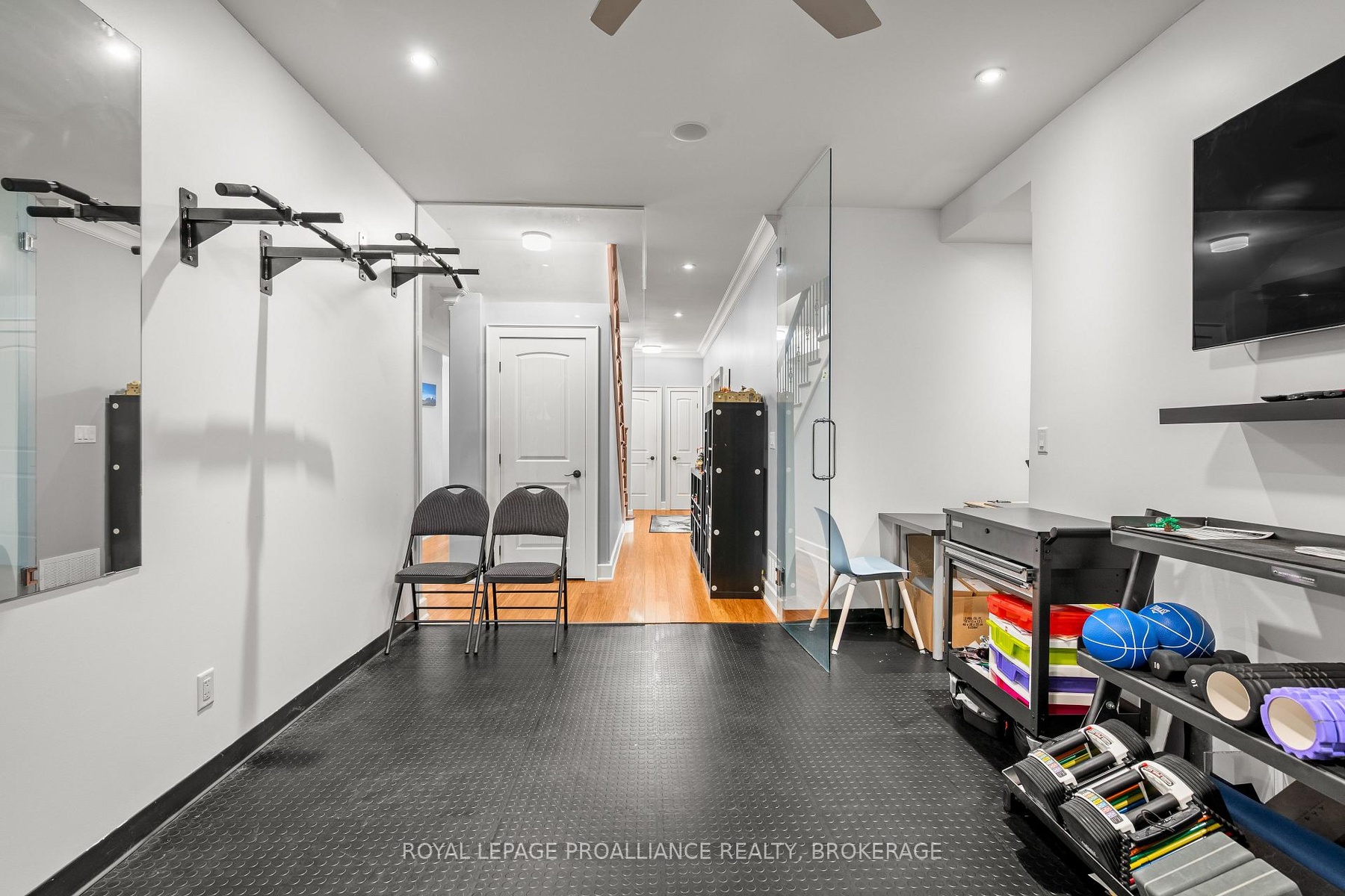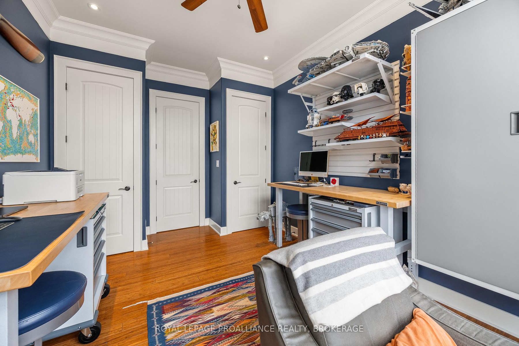Executive custom-built elevated bungalow in the highly sought-after Westwoods neighbourhood, known for its excellent school district & established surroundings. This meticulously maintained home showcases jaw-dropping finishes throughout, including coffered ceilings, wainscotting, crown moulding, soaring ceilings, custom built-in detailed trimwork, & upgraded light fixtures throughout. The heart of the home is a stunning chef's kitchen featuring a massive granite island with breakfast bar, premium appliances (Thermador gas stove, Jennair built-in oven) & eat-in area, seamlessly flowing into a spacious & elegant living area with a gas fireplace. A stunning Lanai with skylights & multiple access points offers the perfect place to unwind, while built-in ceiling speakers on both levels of the home elevate everyday living & entertaining. The primary suite is a retreat of its own host to a massive walk-in closet with built-ins, & spa-like ensuite. The main floor is finished off with 2 additional generously sized bedrooms, a full bathroom, a main floor laundry room & a 2pc powder room. The fully finished basement adds incredible versatility with 3 additional bedrooms, a full bathroom, a dry sauna, custom gym, & a wet bar within the spacious recreation area. The backyard is a private oasis, complete with an inground heated saltwater pool & hot tub (2021), while the front yard benefits from an inground irrigation system. Car enthusiasts & hobbyists will appreciate the monstrous custom attached garage that accommodates 3 cars (2 in tandem & 1 on the side), featuring a commercial-grade door, epoxy flooring, metal-clad walls & ceiling, storage loft, & a rear roll-up door providing direct backyard access, truly a rare & impressive space that must be seen to be appreciated. A standout offering combining craftsmanship, functionality, & lifestyle in one of Kingston's most desirable communities.