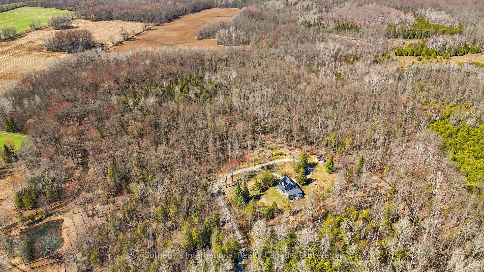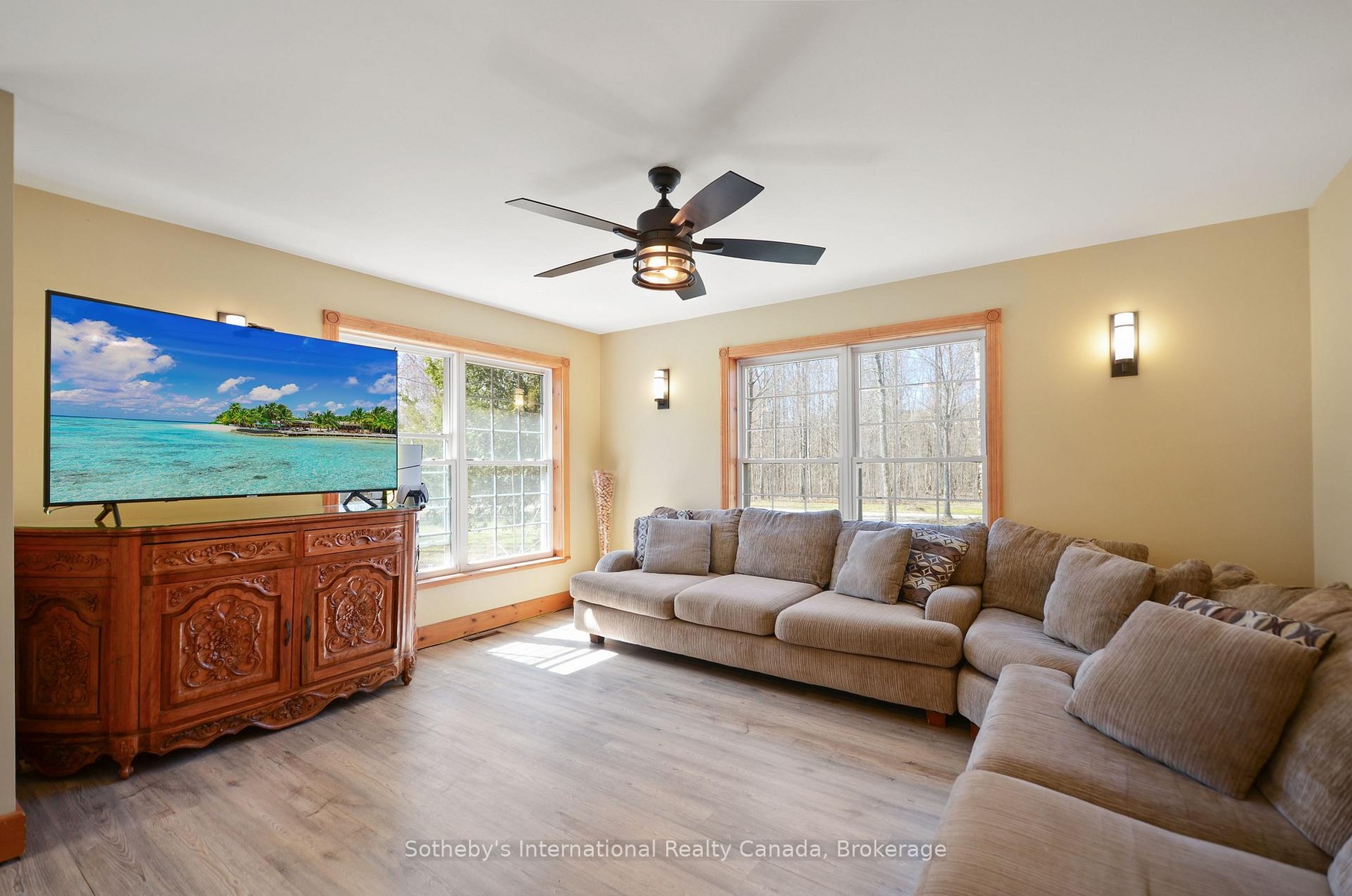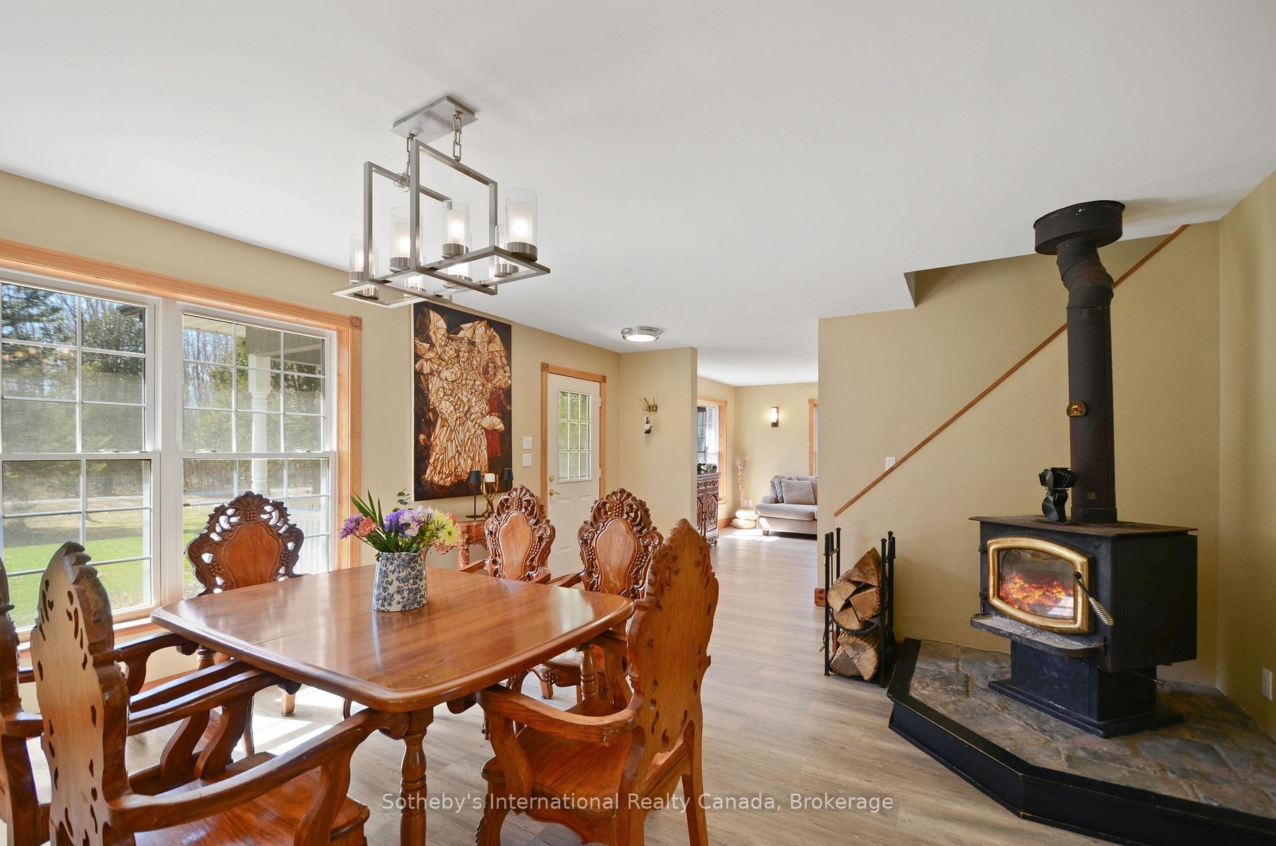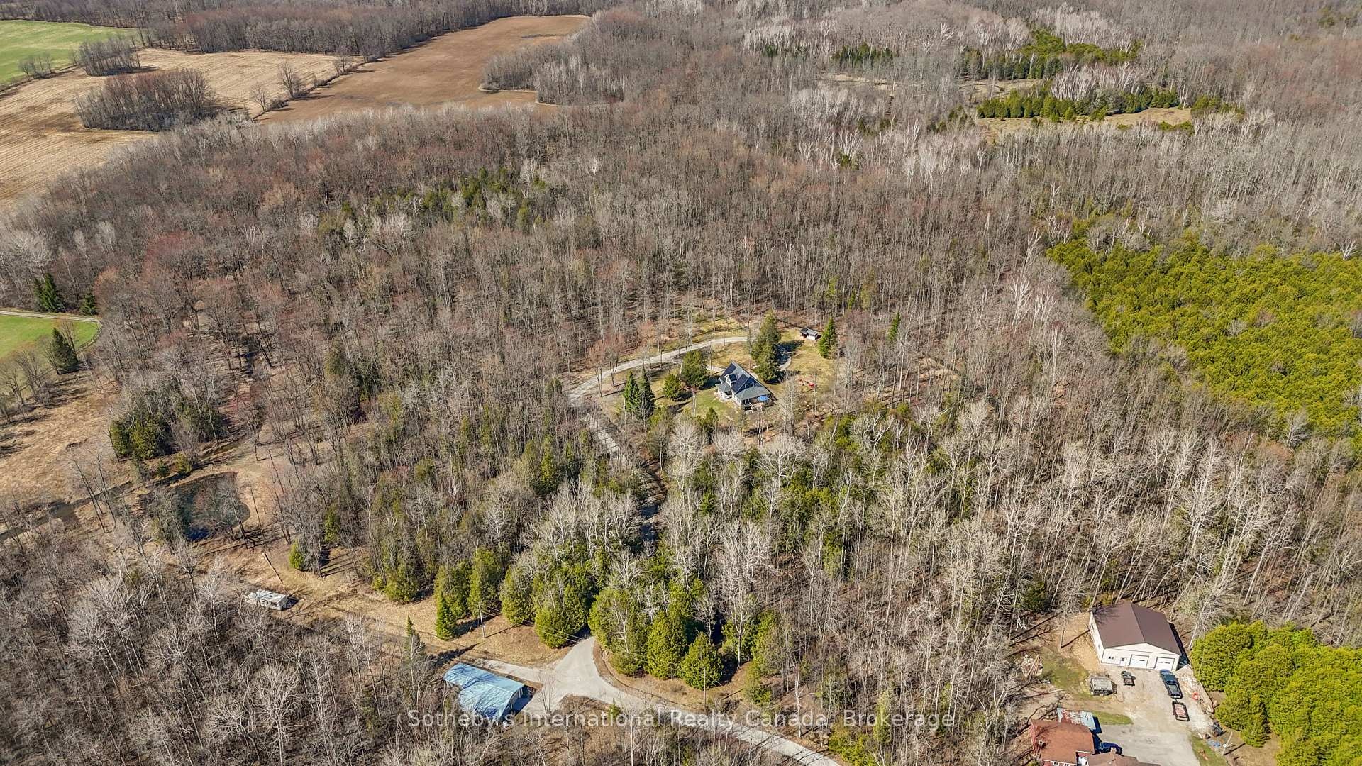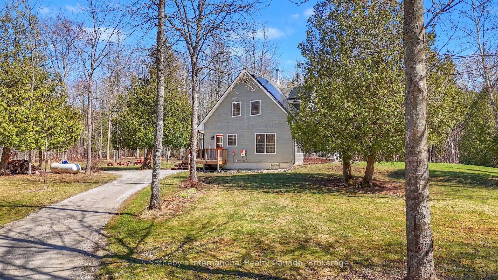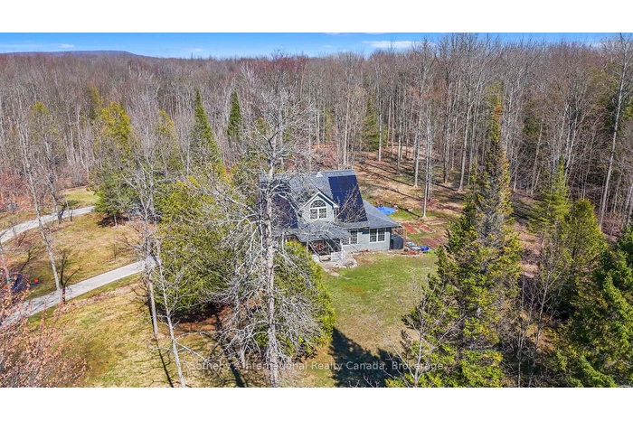 Encompassing 93 pristine acres of absolute privacy, this exceptional country estate offers a rare blend of refined living and natural splendor just minutes from the fairways of Cobble Beach and the conveniences of Owen Sound. A scenic, winding drive through a mature treed canopy leads to a meticulously renovated three-bedroom, two-bathroom residence where modern elegance meets rustic warmth. The heart of the home features a designer kitchen showcased by a stunning live-edge countertop, while the sun-soaked living areas are anchored by a cozy woodstove and offer seamless access to an expansive deck through convenient walk-outs. Additional versatility is found in the substantial heated outbuilding, a multi-purpose space ideal for a studio, workshop, or garage (with EV Tesla Charger), complete with a secondary room offering bunkie potential and its own walk-out. The diverse landscape is a sanctuary for the outdoor enthusiast, featuring an extensive trail network through ancient forests, approximately 18 workable acres for agricultural or equestrian pursuits, and a tranquil spring-fed pond alongside a creek that flows directly into nearby Lake. This is more than just a home; it is a sprawling nature lover's paradise designed for those seeking peace and prestige in one of the region's most sought-after locations. Recent upgrades include 22 solar panels , water heater, water softener, UV filter.