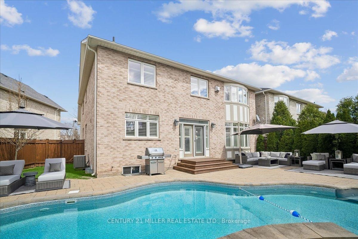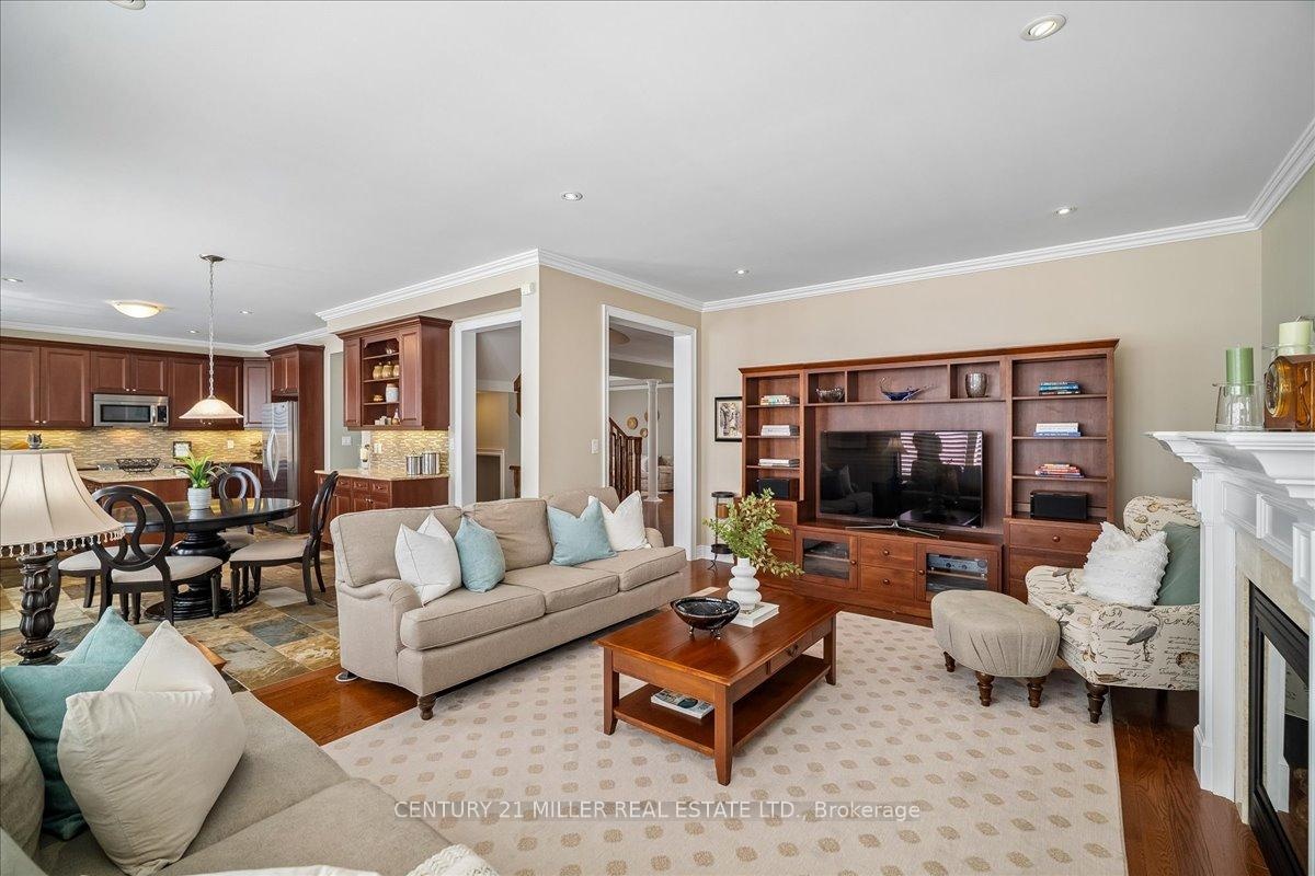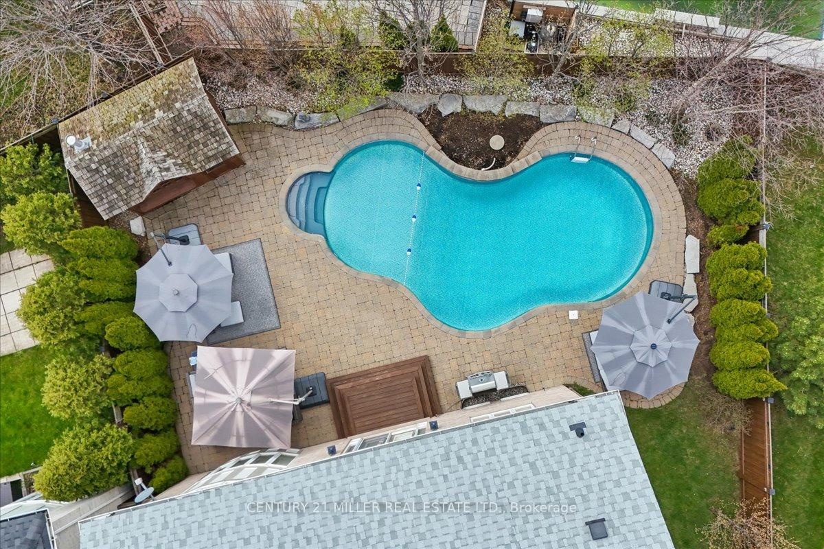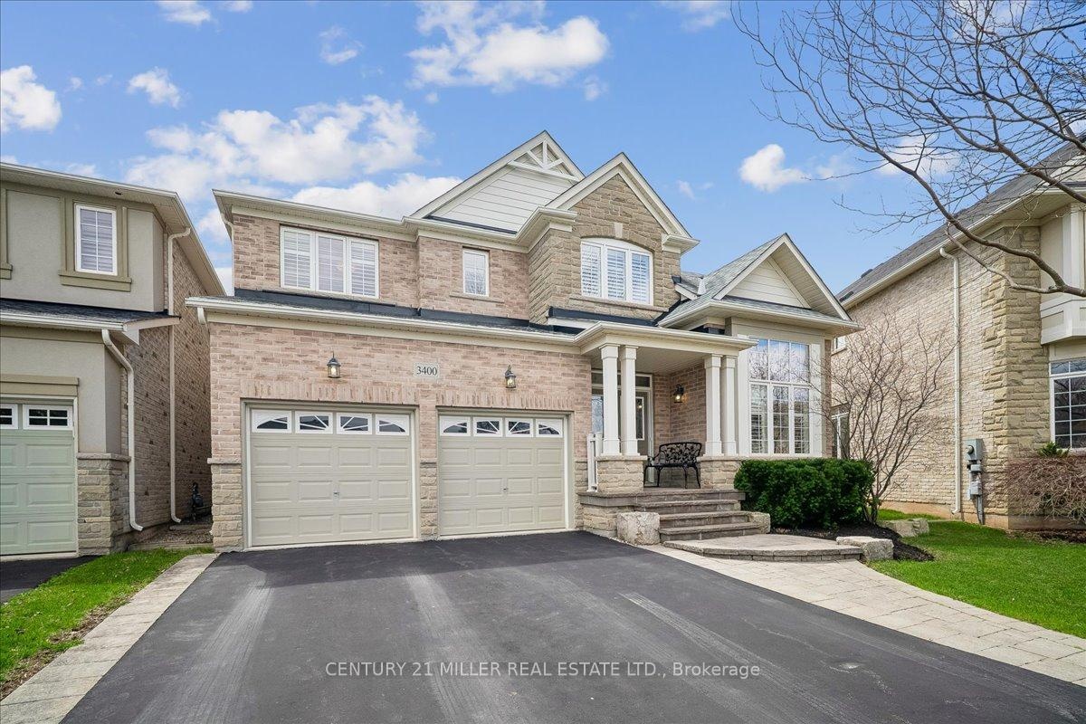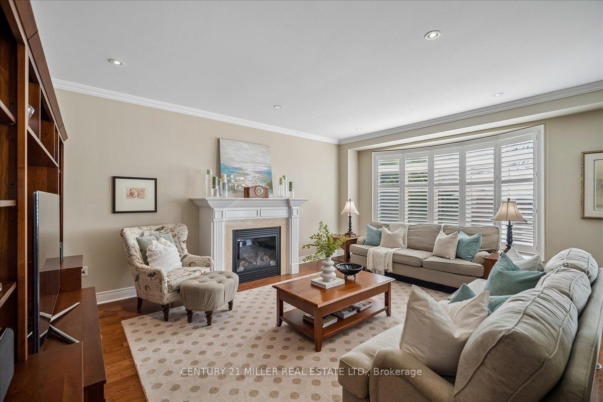 Welcome to this well-maintained home in Oakville's sought-after Bronte Creek community, set on a quiet, family-friendly street surrounded by parks and trails. Situated on a premium pie-shaped lot, approximately 70 ft across the rear, the property offers a private backyard setting with a saltwater pool, stone patio, and mature landscaping-ideal for relaxing or entertaining. The main level offers a functional layout with an open-to-above foyer, hardwood flooring throughout the main living areas, crown moulding, and upgraded light fixtures. The bright living and dining room showcases coffered ceilings, while the family room with gas fireplace and pot lights opens to the eat-in kitchen. The kitchen features stainless steel appliances, granite counters, centre island with breakfast bar, tile flooring, backsplash, extended cabinetry with crown and valance lighting, and a sun-filled breakfast area with walk-out to the backyard. A main floor office, laundry with garage access, and powder room complete the level Upstairs features four spacious bedrooms, including a primary retreat with walk-in closet, double-sided fireplace, crown moulding, and a 5-piece ensuite with double sinks, soaker tub, and glass shower. A second bedroom includes its own 4-piece ensuite, while the remaining two bedrooms are served by a 4-piece main bath. Additional highlights include a double car garage with inside entry and double driveway, central vacuum, closet organizers throughout, roof (2018), furnace (2023), and pool pump (2025). Conveniently located within walking distance to top-rated schools, parks, and everyday amenities, and just minutes to Bronte GO Station, Oakville Trafalgar Hospital, the QEW, and Hwy 407.