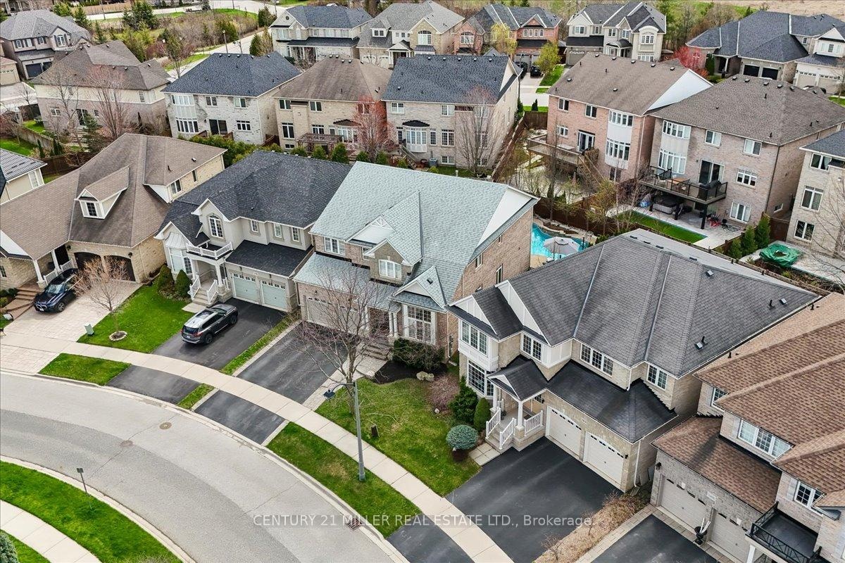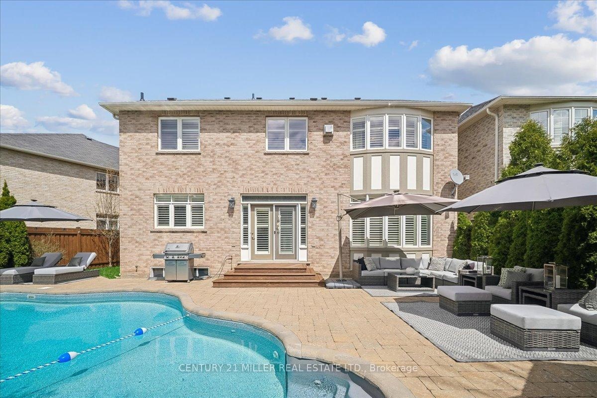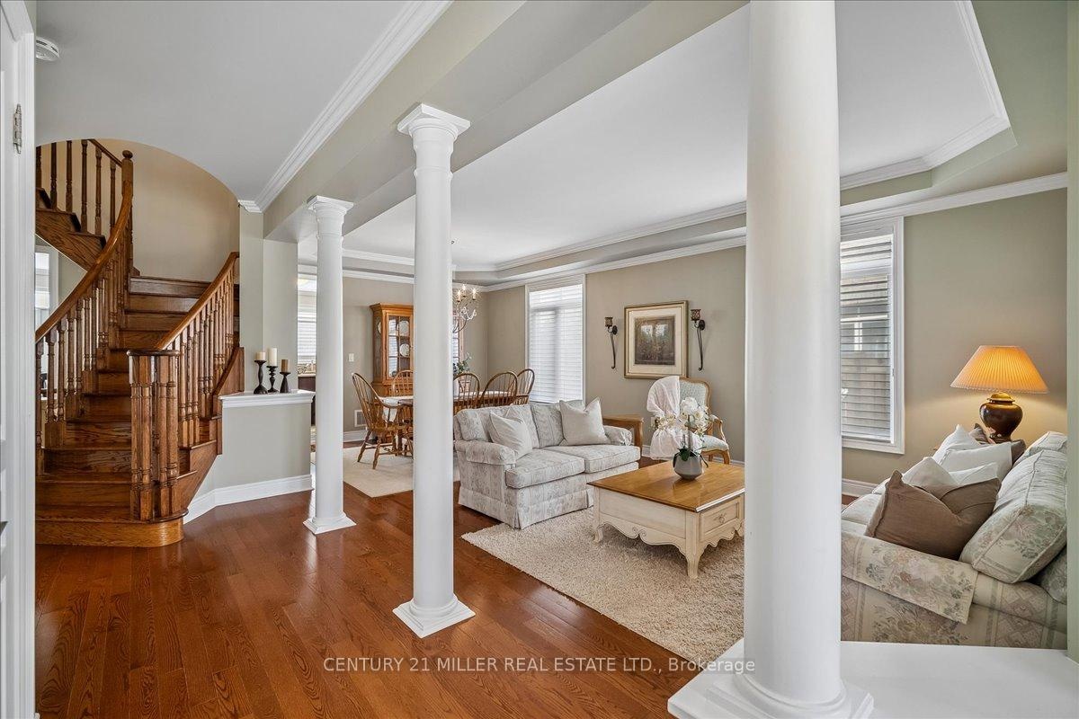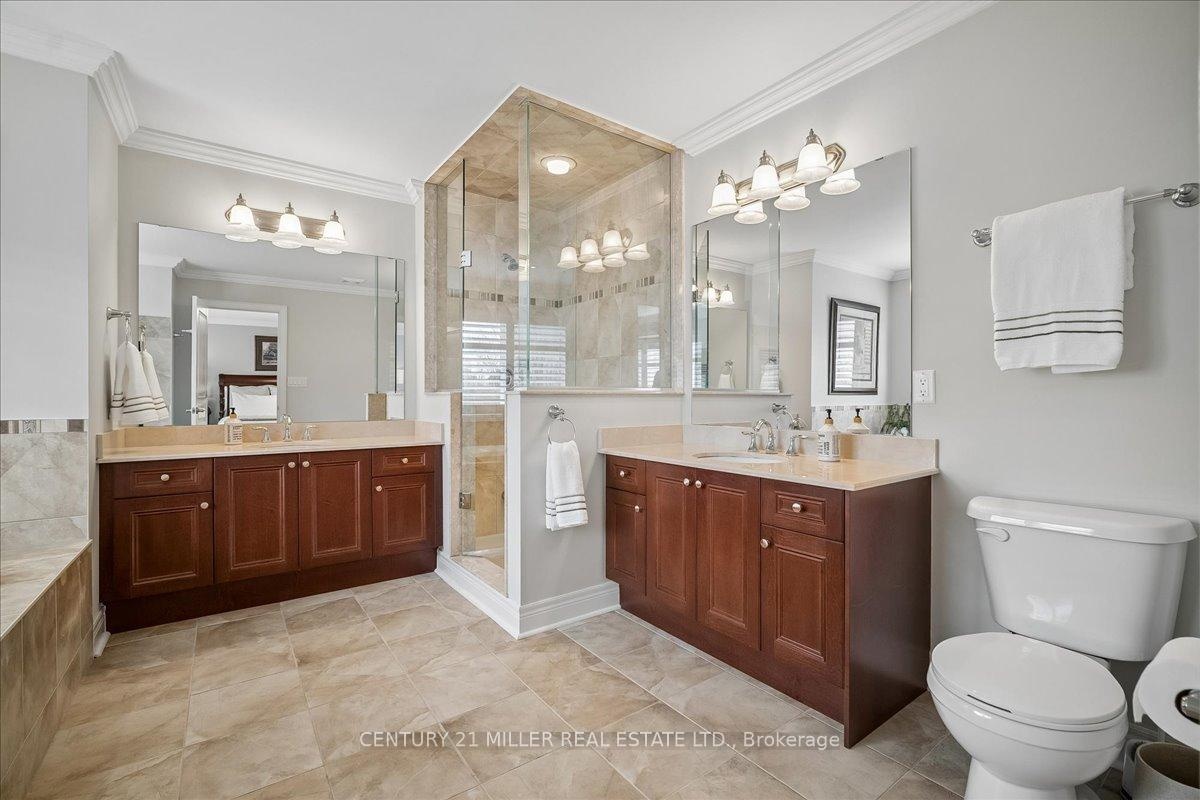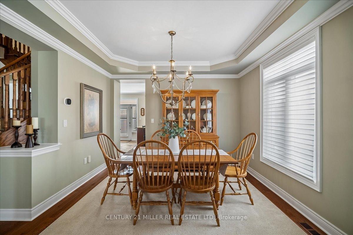 Welcome to this well-maintained home in Oakville's sought-after Bronte Creek community, set on a quiet, family-friendly street surrounded by parks and trails. Situated on a premium pie-shaped lot, approximately 70 ft across the rear, the property offers a private backyard setting with a saltwater pool, stone patio, and mature landscaping-ideal for relaxing or entertaining. The main level offers a functional layout with an open-to-above foyer, hardwood flooring throughout the main living areas, crown moulding, and upgraded light fixtures. The bright living and dining room showcases coffered ceilings, while the family room with gas fireplace and pot lights opens to the eat-in kitchen. The kitchen features stainless steel appliances, granite counters, centre island with breakfast bar, tile flooring, backsplash, extended cabinetry with crown and valance lighting, and a sun-filled breakfast area with walk-out to the backyard. A main floor office, laundry with garage access, and powder room complete the level Upstairs features four spacious bedrooms, including a primary retreat with walk-in closet, double-sided fireplace, crown moulding, and a 5-piece ensuite with double sinks, soaker tub, and glass shower. A second bedroom includes its own 4-piece ensuite, while the remaining two bedrooms are served by a 4-piece main bath. Additional highlights include a double car garage with inside entry and double driveway, central vacuum, closet organizers throughout, roof (2018), furnace (2023), and pool pump (2025). Conveniently located within walking distance to top-rated schools, parks, and everyday amenities, and just minutes to Bronte GO Station, Oakville Trafalgar Hospital, the QEW, and Hwy 407.