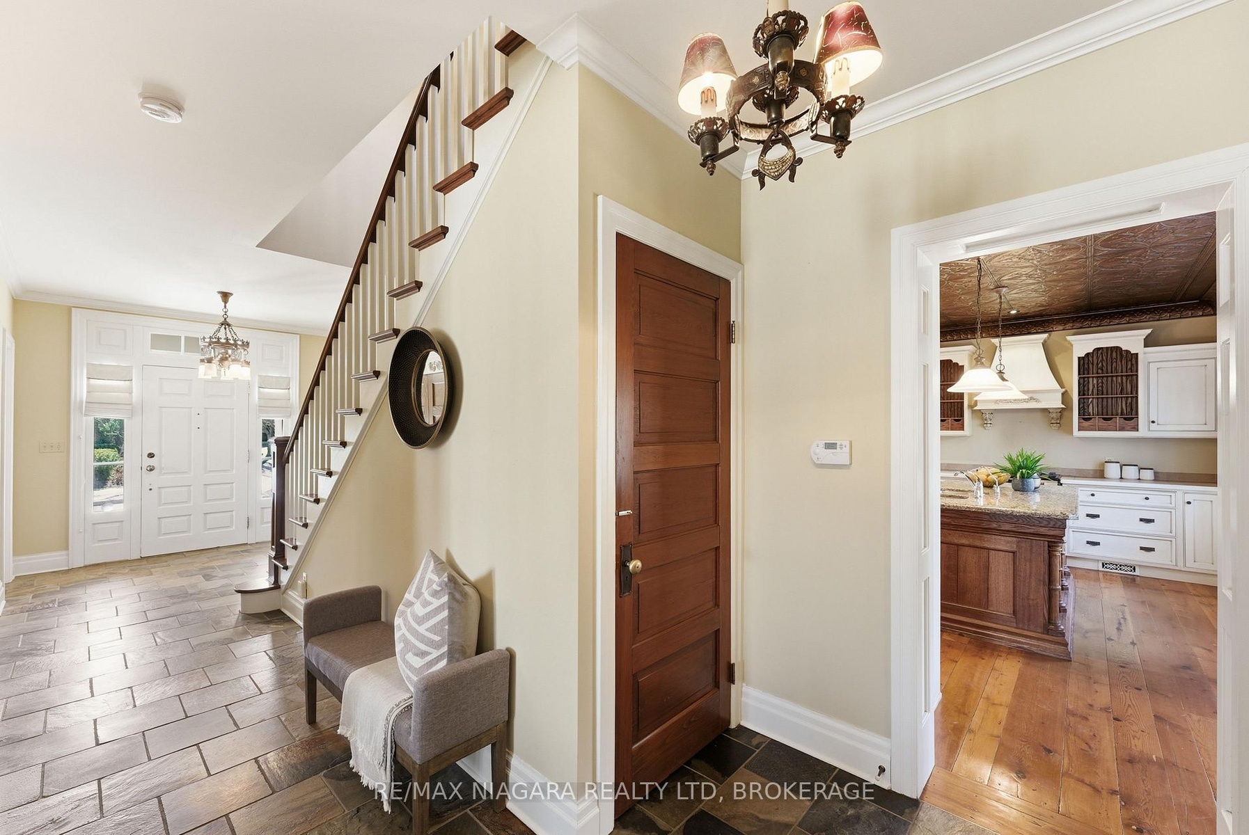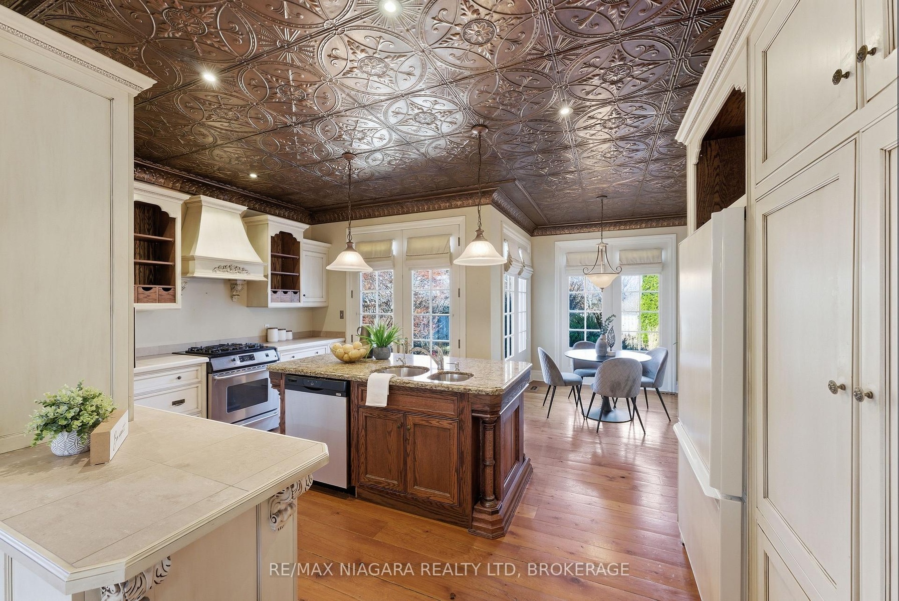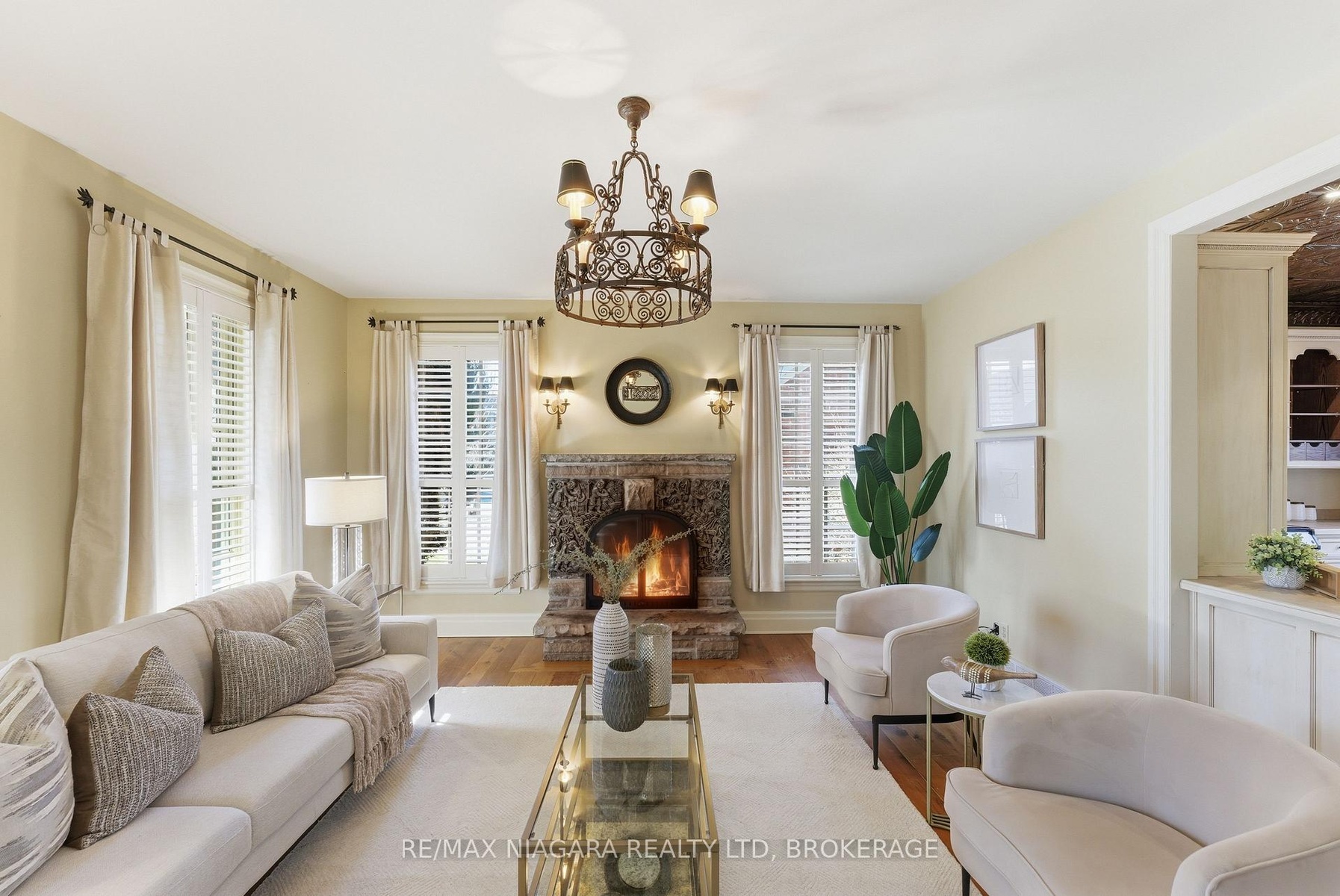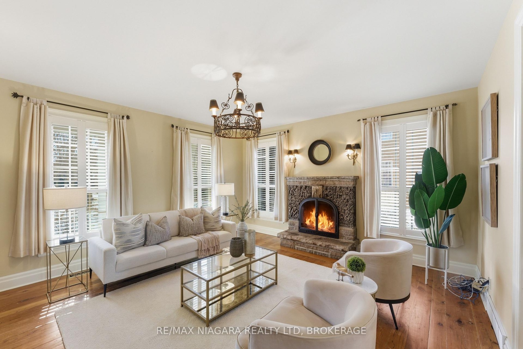 Nestled on a quiet street in the heart of Niagara-on-the-Lake, this stunning 4-bedroom, 3-bath residence offers approximately 2,925 sq. ft. of thoughtfully designed living space, blending timeless character with luxurious finishes. A gorgeous stone wraparound porch welcomes you home.Step inside to a grand foyer featuring an extra-wide staircase and elegant wall sconces. The main floor showcases wide-plank hemlock wood flooring, creating warmth and character. The living room is highlighted by a stone wood-burning fireplace and walkout access to the wraparound porch. The large eat-in dining room offers plenty of room for family gatherings and dinner parties, with additional doors leading directly to the porch. At the heart of the home lies the kitchen. A copper ceiling in the kitchen and breakfast nook creates a dramatic focal point. The breakfast area opens directly onto a stone patio and backyard. Completing the main floor is a convenient 2-piece bath and a versatile bonus room-ideal as a home office, craft room, or potential 5th bedroom. Upstairs, you'll find four generously sized bedrooms, offering large windows and ample closet space. The primary suite serves as a private retreat, featuring a spa-inspired 4-piece ensuite complete with a built-in vanity, soaker tub, and stand-up shower. An additional 4-piece bath provides convenience for family and guests.The finished basement expands the living space with a large recreation room anchored by a second stone fireplace. There is also plenty of additional storage space.Outside, the spacious backyard offers endless possibilities for entertaining, play, or relaxation, with abundant garden space for gardening enthusiasts. A double-wide attached garage and ample driveway. Located in an exceptional Niagara-on-the-Lake location, this home combines luxury, character, and tranquility, all while being close to the town's renowned wineries, dining, and charming amenities.