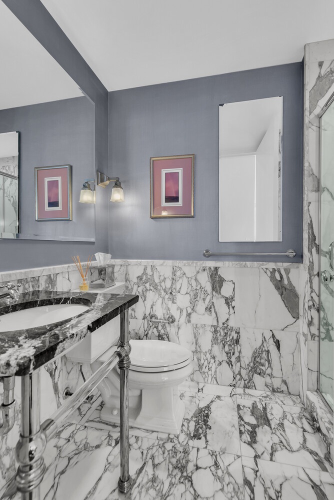 The remaining bathroom includes bold marble tilework, a modern console sink, and a step-in shower. A dedicated laundry closet with an in-unit washer and dryer completes this special residence .