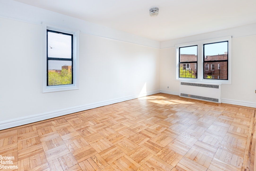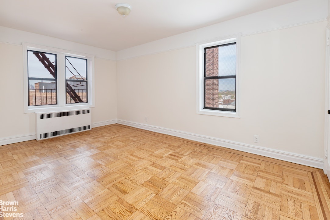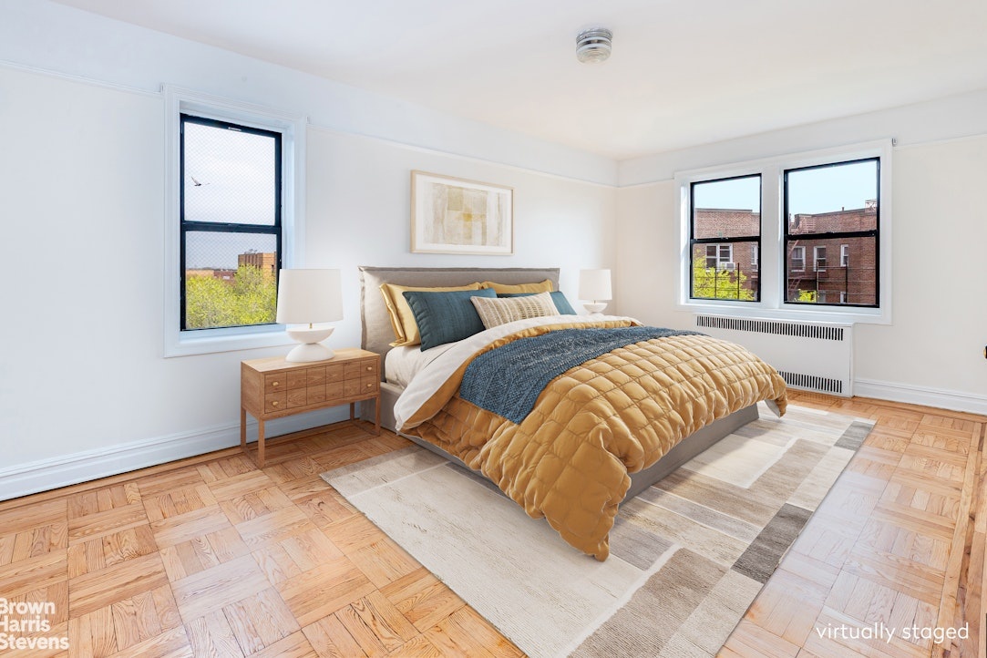 Buyers and investors, come see this TOP FLOOR, PRE-WAR, 2BR/2BA CORNER UNIT. There is over 1,100 SQUARE FEET, abundant LIGHT, CITY VIEWS, and VALUE for your money! This apartment is a sponsor unit with NO BOARD APPROVAL! It can be used strictly as either an investment or a personal residence. The attractive price sets this unit apart from other 2 BR/2 BAs in the neighborhood which have sold for as high as $910,000. Charming, pre-war details include: an inviting gallery; huge living room, freshly sanded parquet floors with inlaid mahogany, dramatic 9-foot ceilings, and detailed archways. The large, eat-in kitchen offers oak floors, original cabinetry, new subway tile backsplash, and new stainless steel appliances. Each of the spacious bedrooms has two light exposures and two closets. The main bedroom has an en-suite bathroom and the 2nd bedroom is conveniently adjacent to the hallway bathroom. As for the building, The Mayfair is a 1937 elevator building with a lovely, ornate lobby; private garden; laundry room; bike room; and live-in super. Restaurants, supermarkets, and local businesses are steps away on 37th Avenue. Also nearby are Travers Park and 34th Avenue, a landscaped pedestrian walkway where you'll find the year-round Farmer's Market. There is a large selection of schools (District 30), as well as a large selection of train lines (7/E/F/M/R) for a 3-STOP COMMUTE to Manhattan! Jackson Heights is a famously multicultural neighborhood offering historic apartments at a fraction of the price of other boroughs. Cat friendly! No flip tax! Subletting upon request.