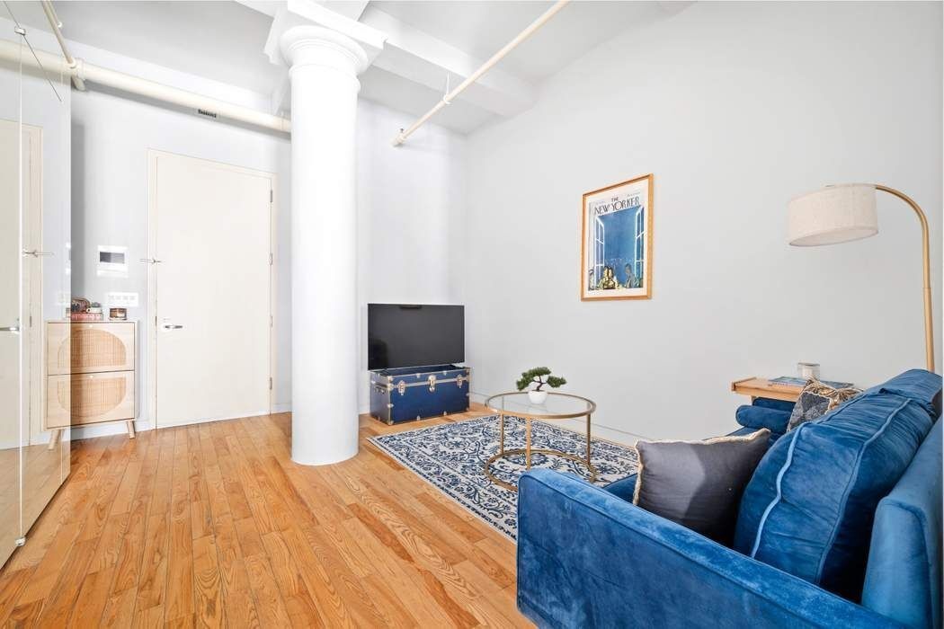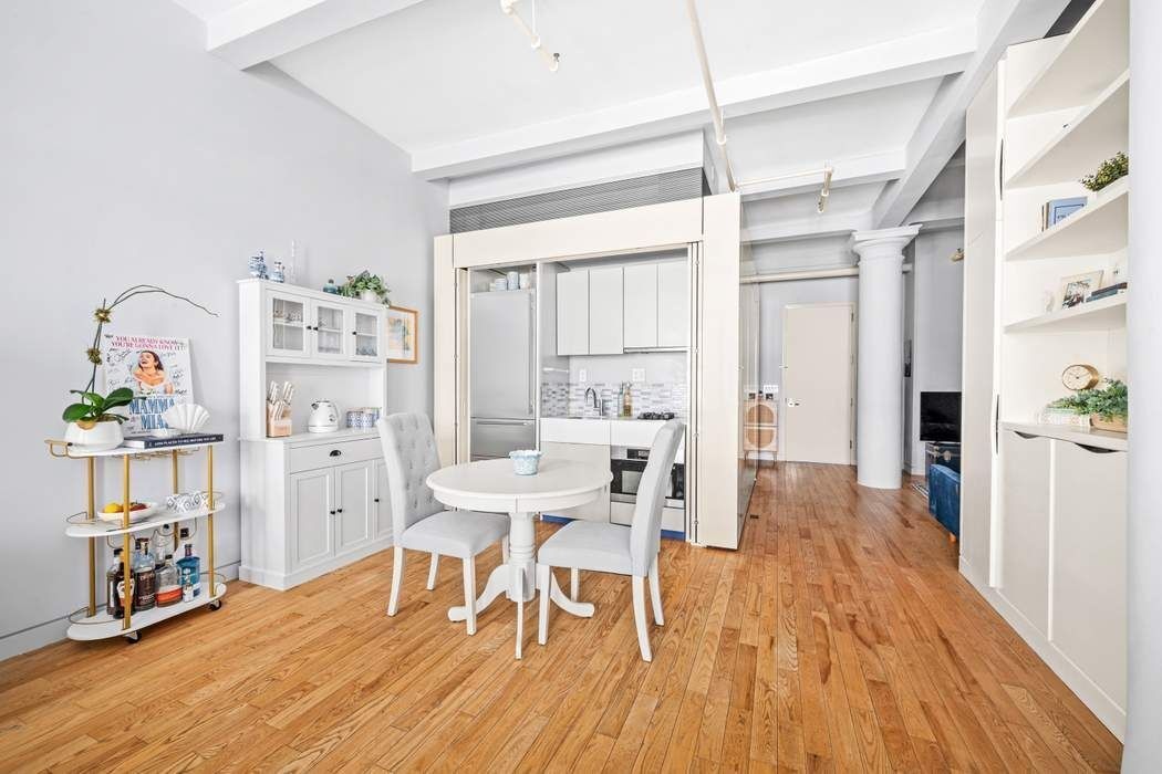 With approximately 650+/- square feet, ceilings of nearly 11 ft high, and central air, the space feels larger than its footprint, offering that classic downtown loft volume with a more refined, modern sensibility. The main living area is expansive and flexible, easily accommodating a generous seating area, dining table, and workspace without ever feeling crowded. Whether you’re hosting friends or enjoying a quiet night in, the layout just works.