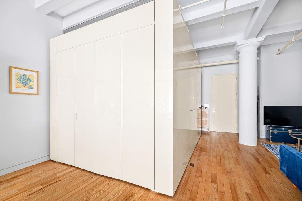 The kitchen is sleek and efficient, outfitted with high-end appliances including Miele and Sub-Zero, while the bath offers a calm, spa-like feel with clean finishes and excellent storage. A stacked washer and dryer is seamlessly integrated into the lacquer cabinetry, and storage throughout the apartment is surprisingly generous—something you immediately appreciate once you move in.