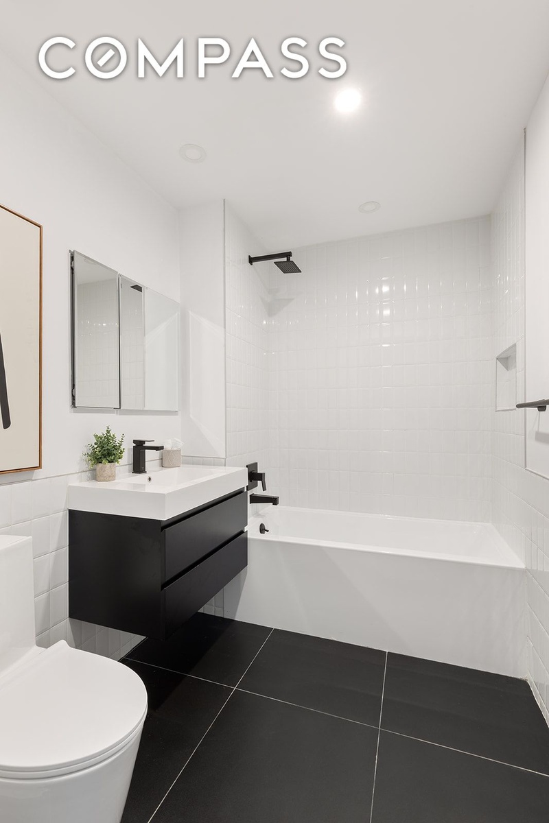 The bathroom features a black-and-white palette, floating vanities, and matte black Danze fixtures for a polished, modern look.