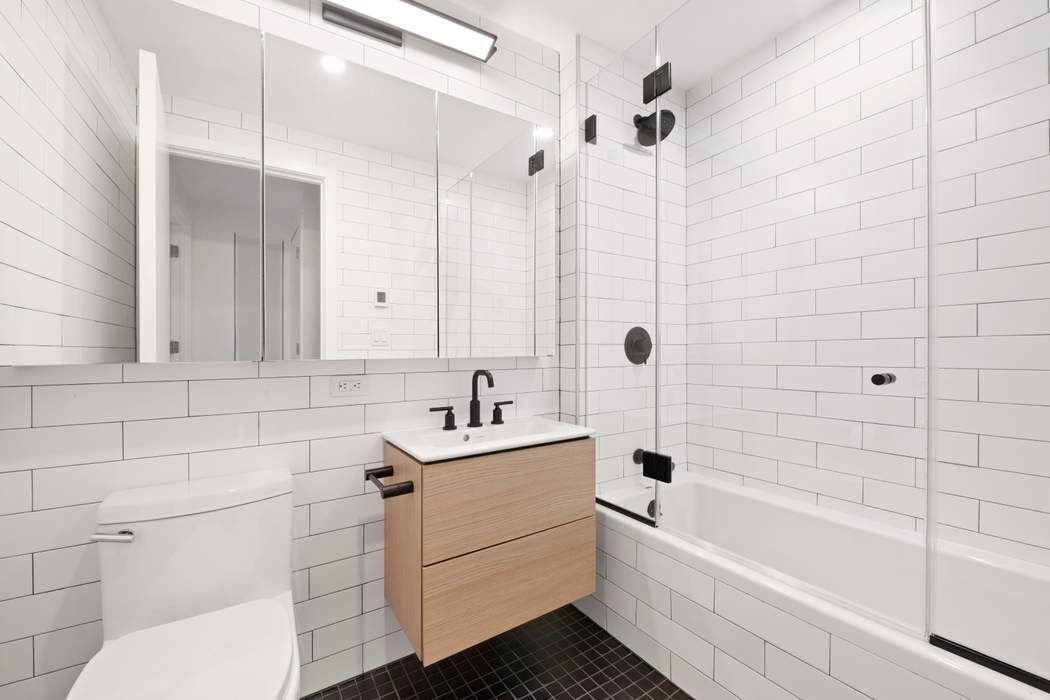 The bathroom offers European oak vanities, Starck by Duravit basins, and a striking contrast of black floor tiles, oversized white subway tiles, and dark bronze fixtures. An in-unit washer and dryer adds everyday convenience.