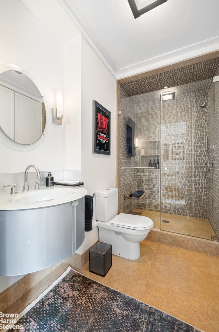 The bathrooms are equally refined, showcasing an oversized glass-enclosed shower, Artelinea glass sink, and high-end fixtures, delivering a spa-like experience.