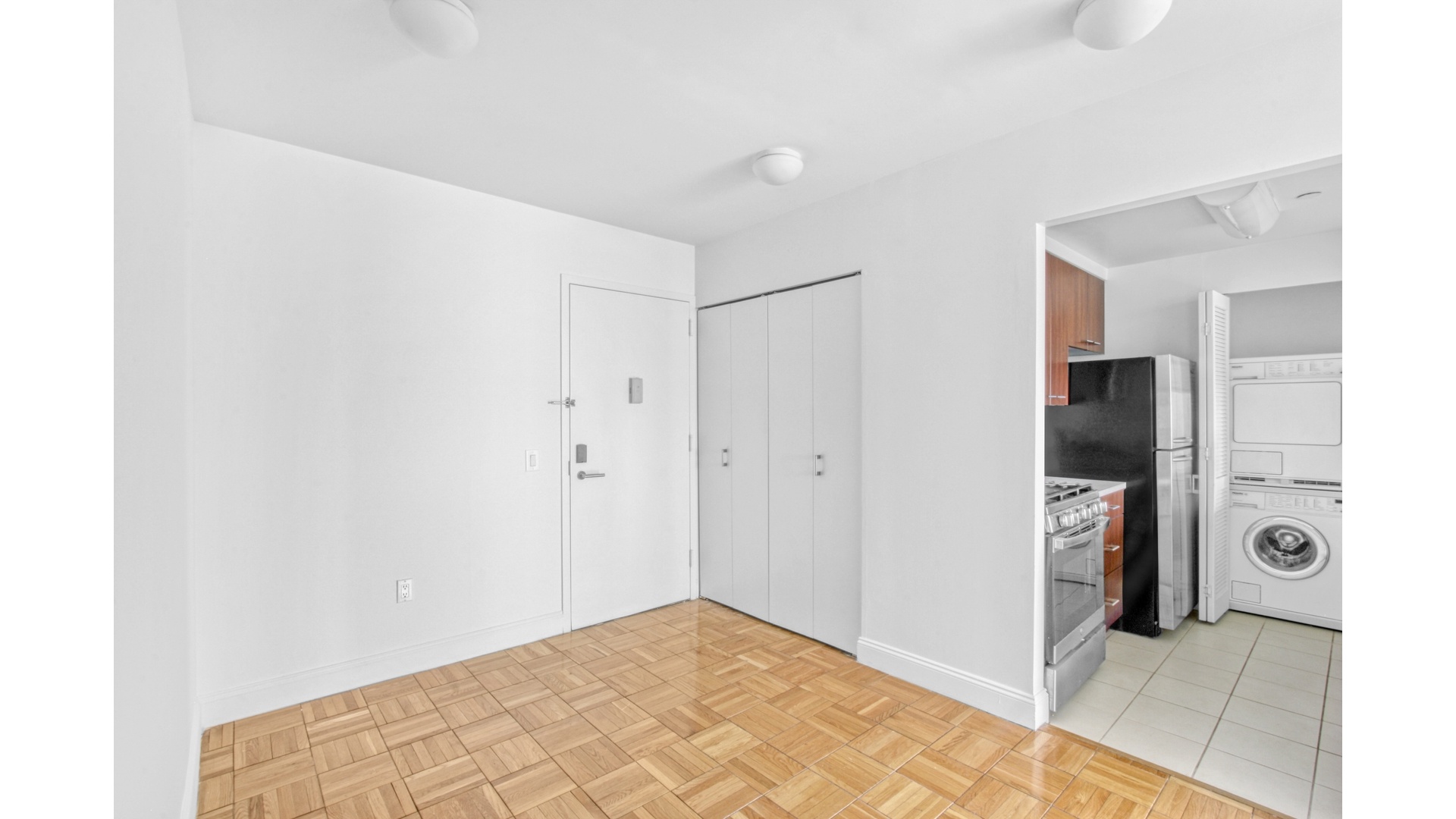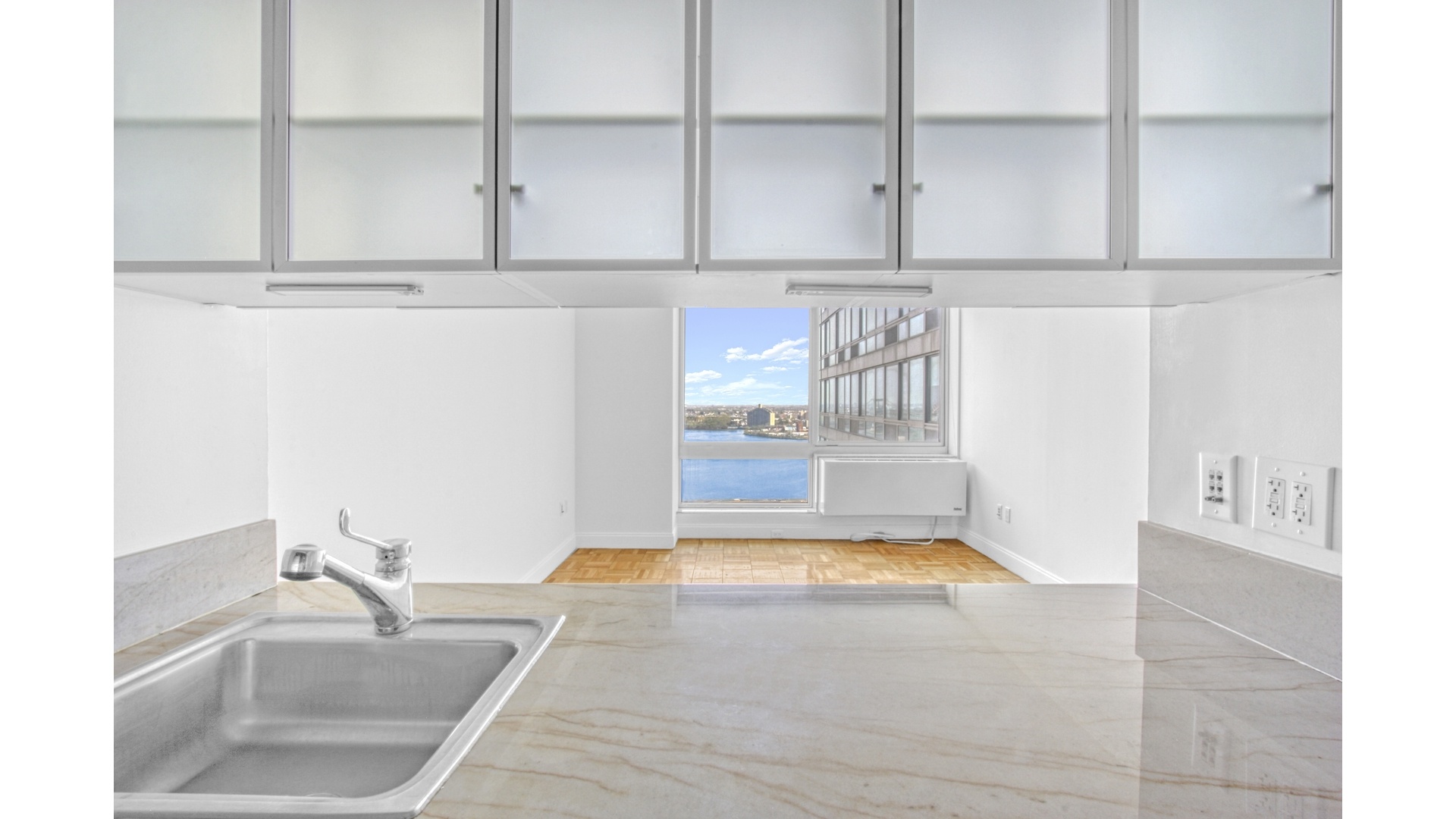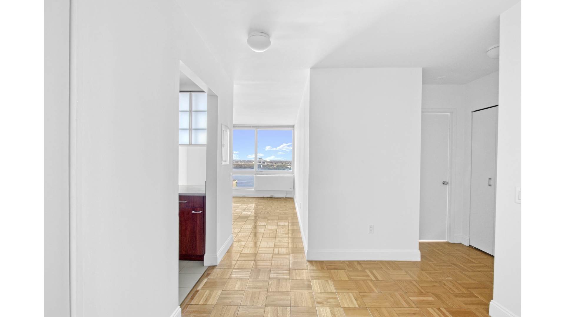 Experience elevated living in this bright and beautifully appointed one-bedroom, one-bath residence perched high above the Upper East Side at 215 East 96th Street, Unit 28N. Showcasing sweeping East River views from every window, this home is flooded with natural light and offers a seamless blend of comfort and sophistication. A gracious entry foyer leads into a spacious living and dining area, ideal for both everyday living and entertaining. The thoughtfully designed kitchen is outfitted with sleek stone countertops, custom cabinetry, and premium stainless steel appliances, including a KitchenAid suite and in-unit Miele washer and dryer. The oversized bedroom offers a peaceful retreat with generous proportions and ample closet space, while the modern bath is finished with clean, contemporary detailing. Additional highlights include rich parquet hardwood flooring throughout, multiple closets for exceptional storage, and a refined, functional layout that maximizes both space and light.