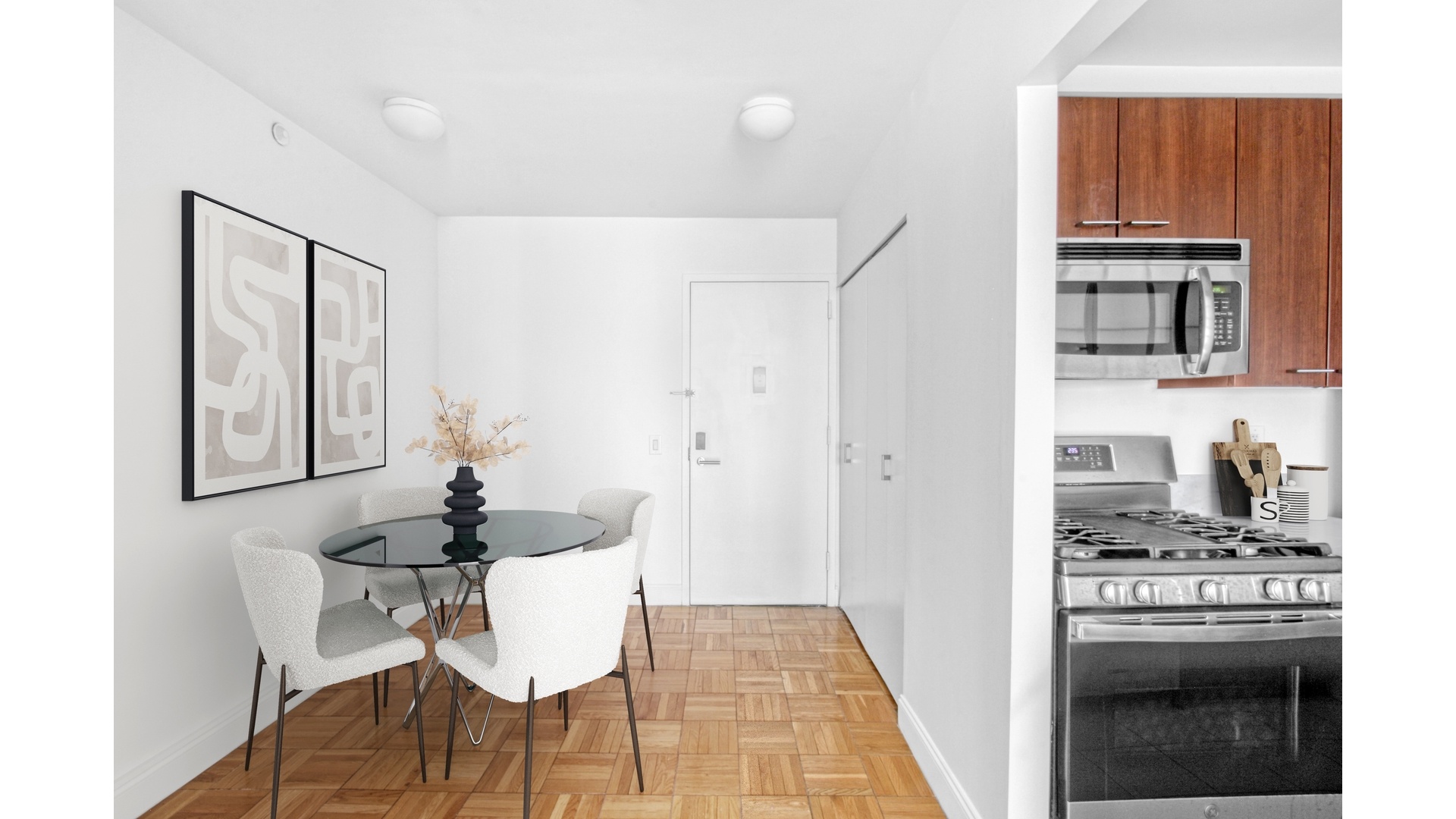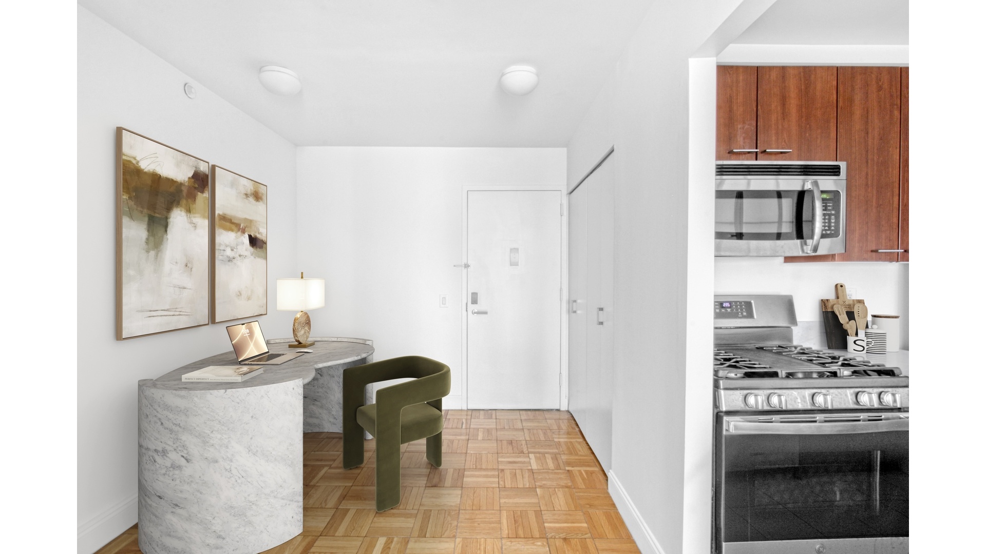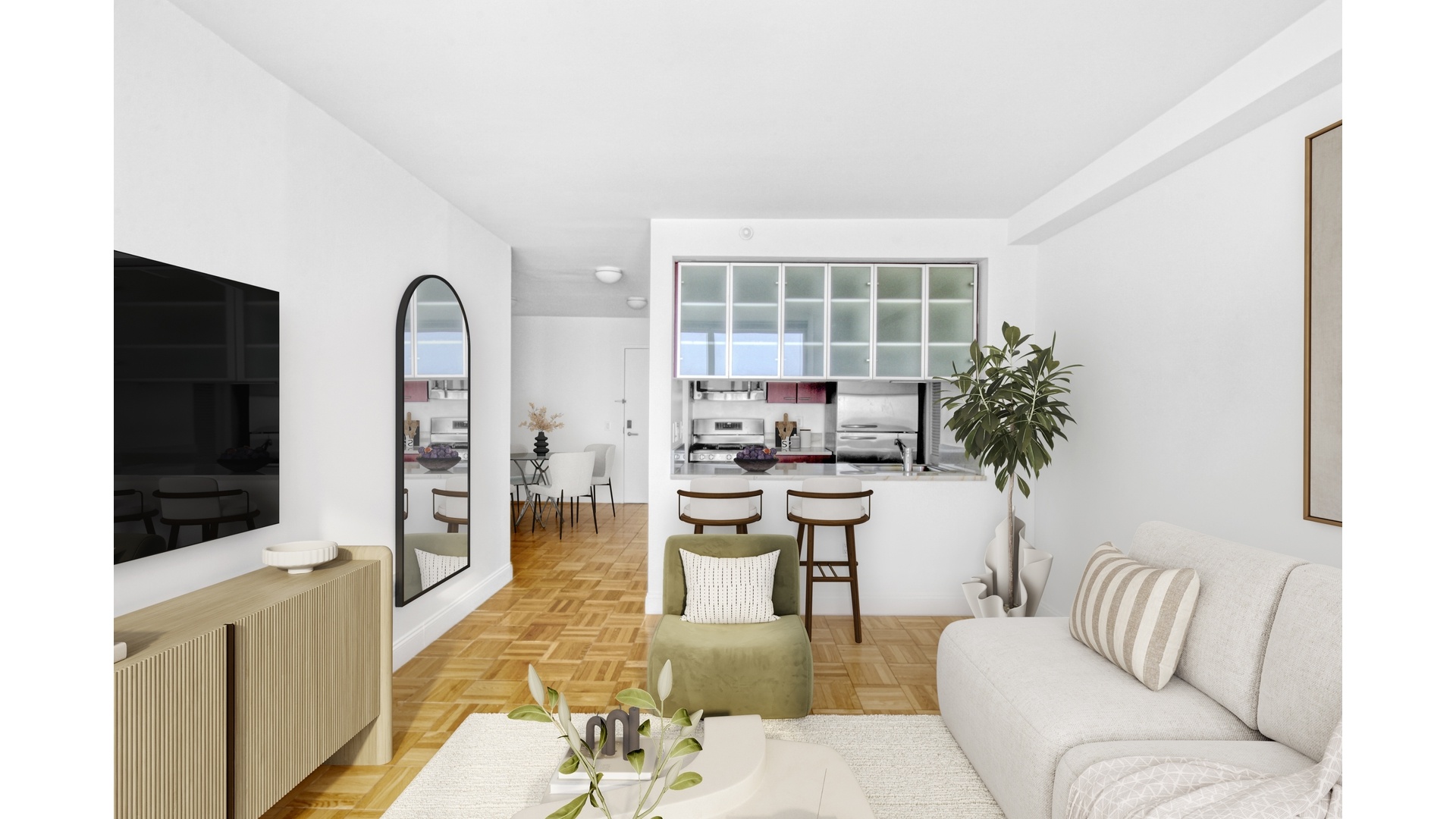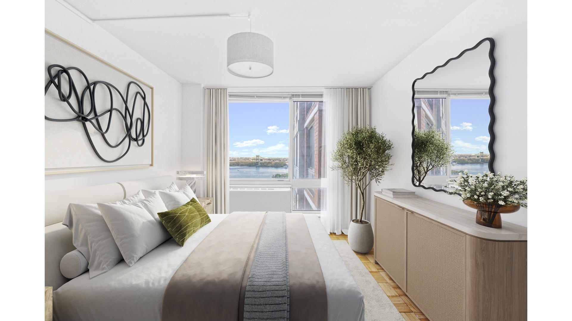 Experience elevated living in this bright and beautifully appointed one-bedroom, one-bath residence perched high above the Upper East Side at 215 East 96th Street, Unit 28N. Showcasing sweeping East River views from every window, this home is flooded with natural light and offers a seamless blend of comfort and sophistication. A gracious entry foyer leads into a spacious living and dining area, ideal for both everyday living and entertaining. The thoughtfully designed kitchen is outfitted with sleek stone countertops, custom cabinetry, and premium stainless steel appliances, including a KitchenAid suite and in-unit Miele washer and dryer. The oversized bedroom offers a peaceful retreat with generous proportions and ample closet space, while the modern bath is finished with clean, contemporary detailing. Additional highlights include rich parquet hardwood flooring throughout, multiple closets for exceptional storage, and a refined, functional layout that maximizes both space and light.