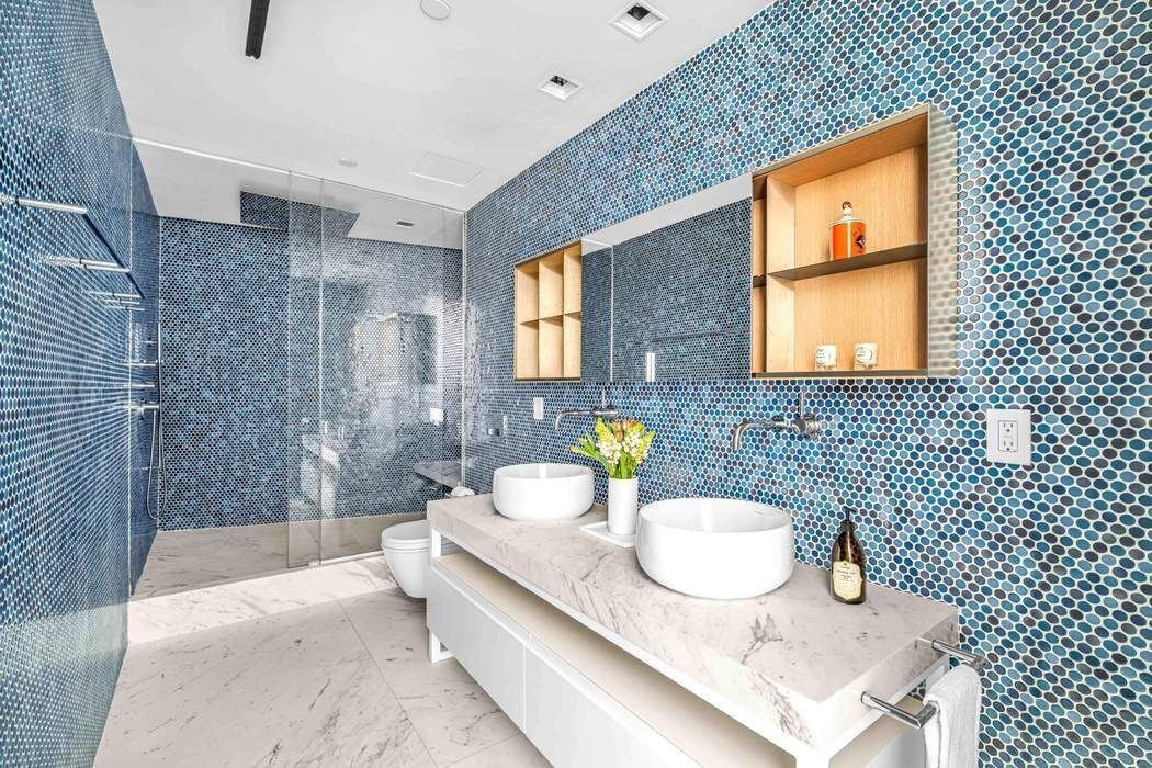 The primary bedroom is generously scaled and thoughtfully designed, featuring a quiet corner ideal for reading or a workspace. A state-of-the-art AV system is seamlessly integrated, complete with a retractable projector screen, perfect for enjoying your favorite films and shows. The en-suite bathroom is beautifully appointed with marble countertops and flooring, a double vanity, intricate mosaic tiling, and a walk-in glass-enclosed shower. A large walk-in closet is conveniently located just across the hall, providing ample storage.