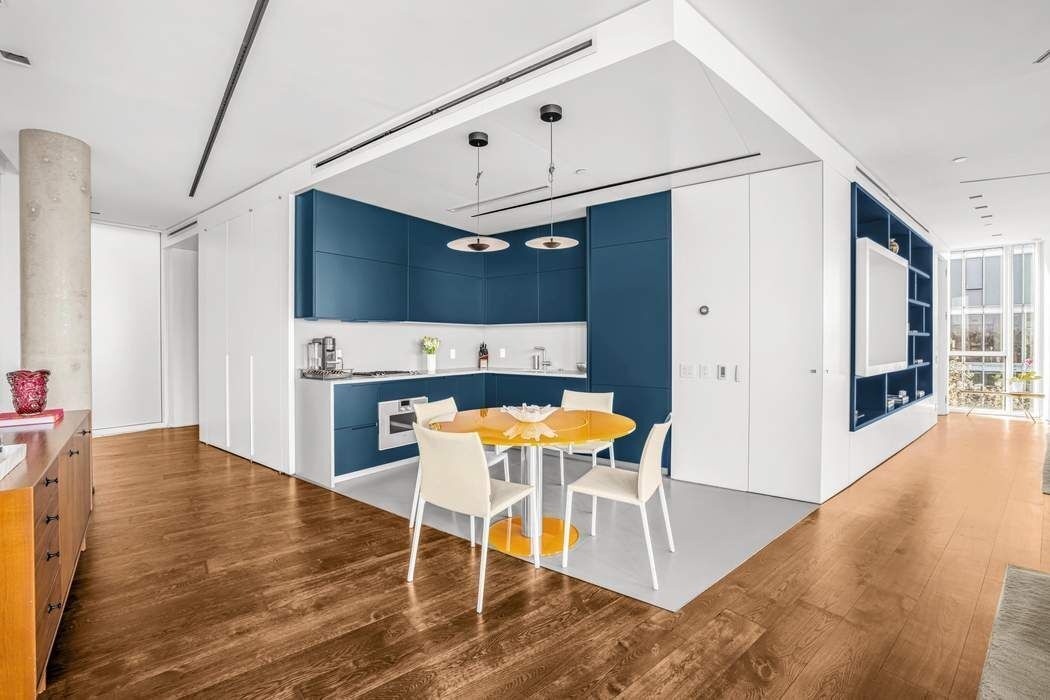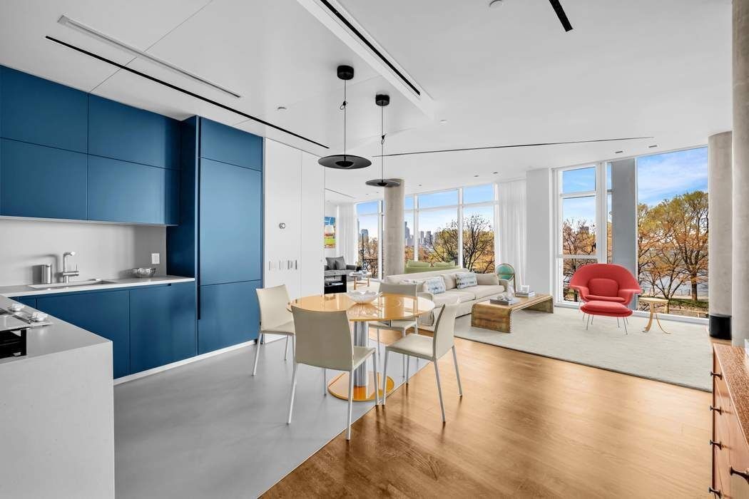 The open kitchen and dining area are centrally positioned, evoking the feel of a refined, modern “corner bistro.” Oriented toward the living space and framed by panoramic views, this area is finished with discreet, fully integrated Gaggenau appliances. Just beyond, a private balcony extends the living space outdoors, offering the perfect setting for morning coffee or evening sunsets over the river.
