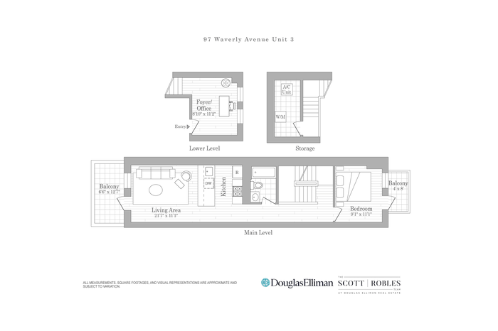 Oversized windows flood the space with natural light and offer open skyline views of Downtown Brooklyn. Entry is through a spacious home office or flex room overlooking Waverly, leading up to the main living area where both the living room and bedroom enjoy soaring ceilings and their own private balconies.