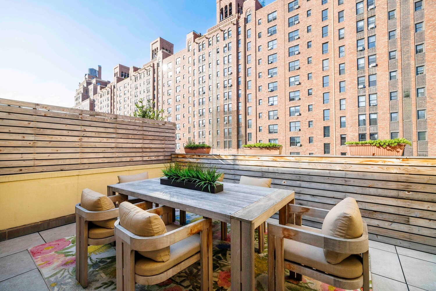 The south terrace is a well-appointed lounging space, filled with sparkling sun and open southern views. The north terrace is perfectly suited for dining, with a dramatic view of the historic London Terrace apartment complex across the street.