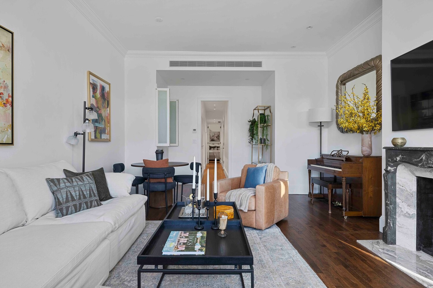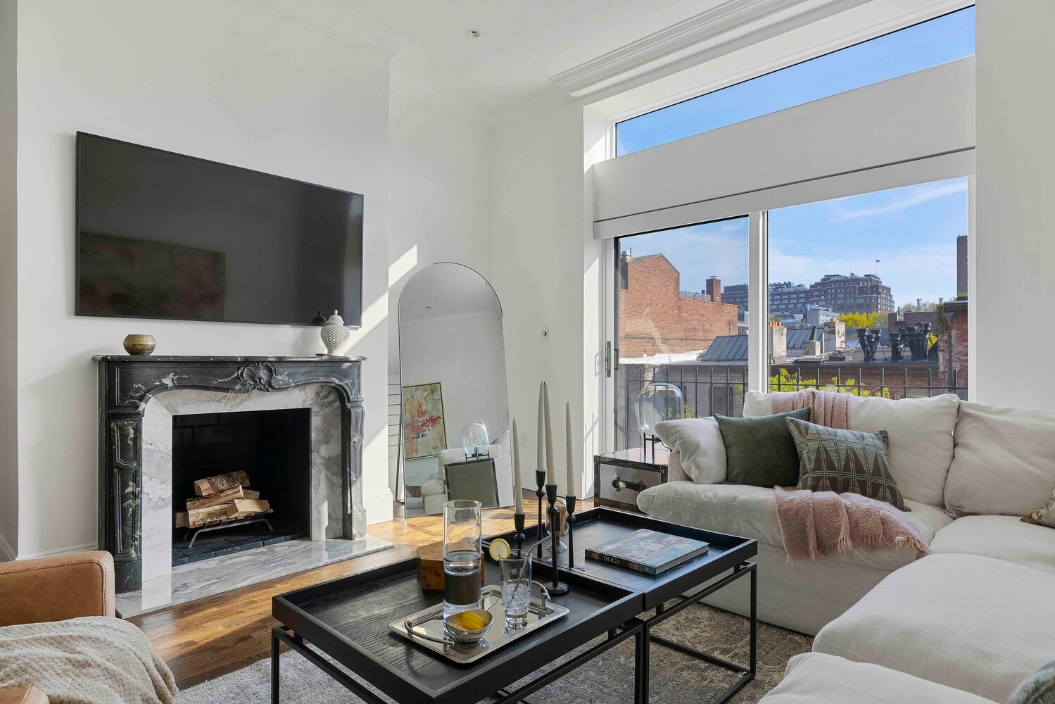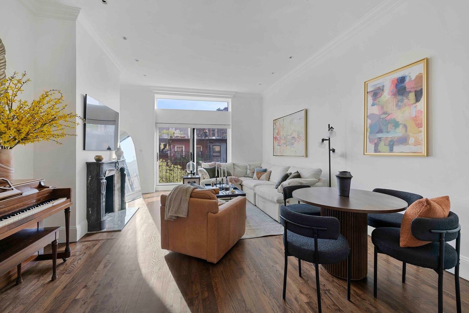 The living and dining area offers generous proportions, comfortably accommodating both seating and dining. The room is anchored by a truly gorgeous carved marble mantel. Its deep veining and classical detailing introduce a distinct sense of 19th-century grandeur into this modern, loft-like space.