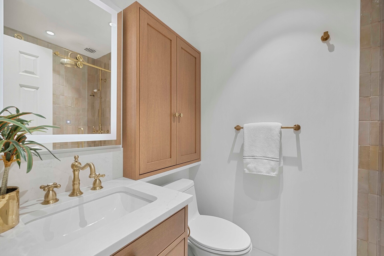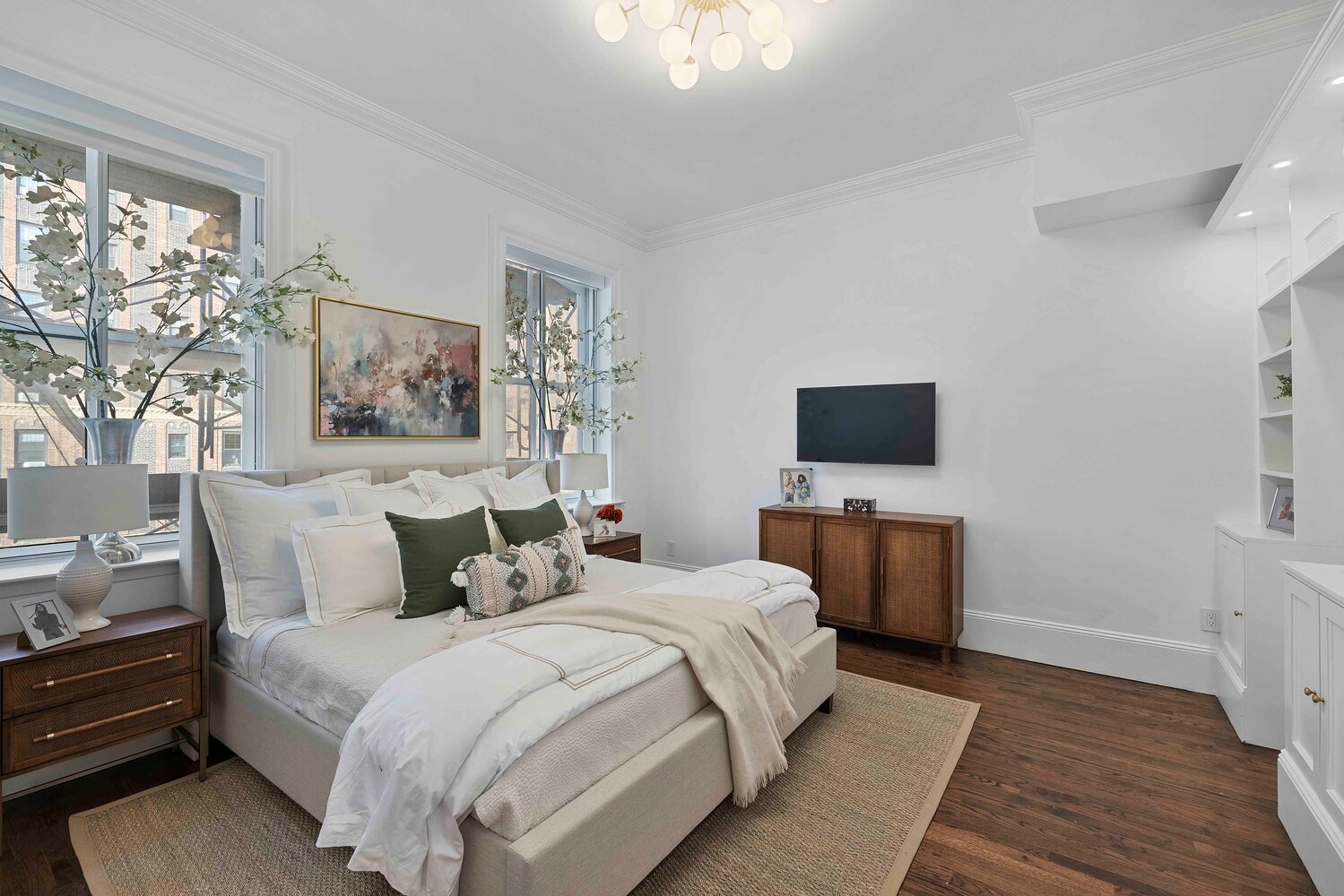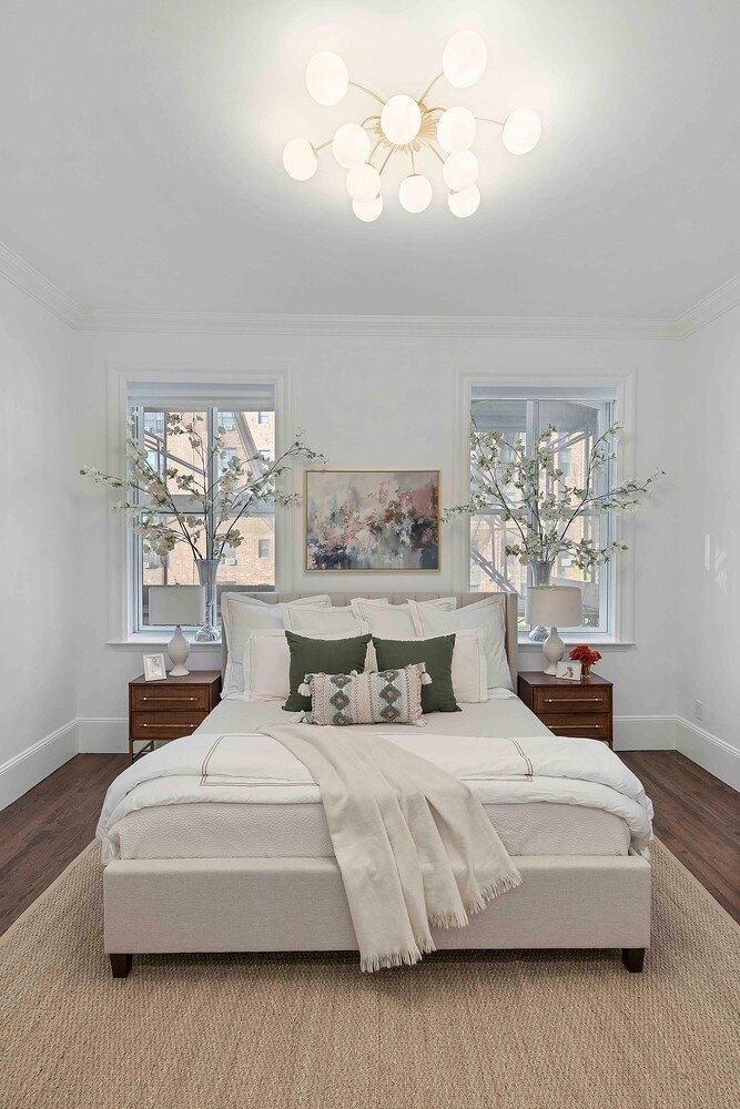 The primary bedroom is serene and beautifully scaled, with generous proportions and a sense of quiet separation from the entertaining spaces. It includes a walk-in closet along with built-in bookshelves and additional storage. A washer and dryer are discreetly integrated on this level, adding everyday convenience without compromising the design. The bathrooms have been completely reimagined with a refined material palette-softly toned tile, custom vanities, and polished brass fixtures, executed with a level of detail that feels both current and enduring.
