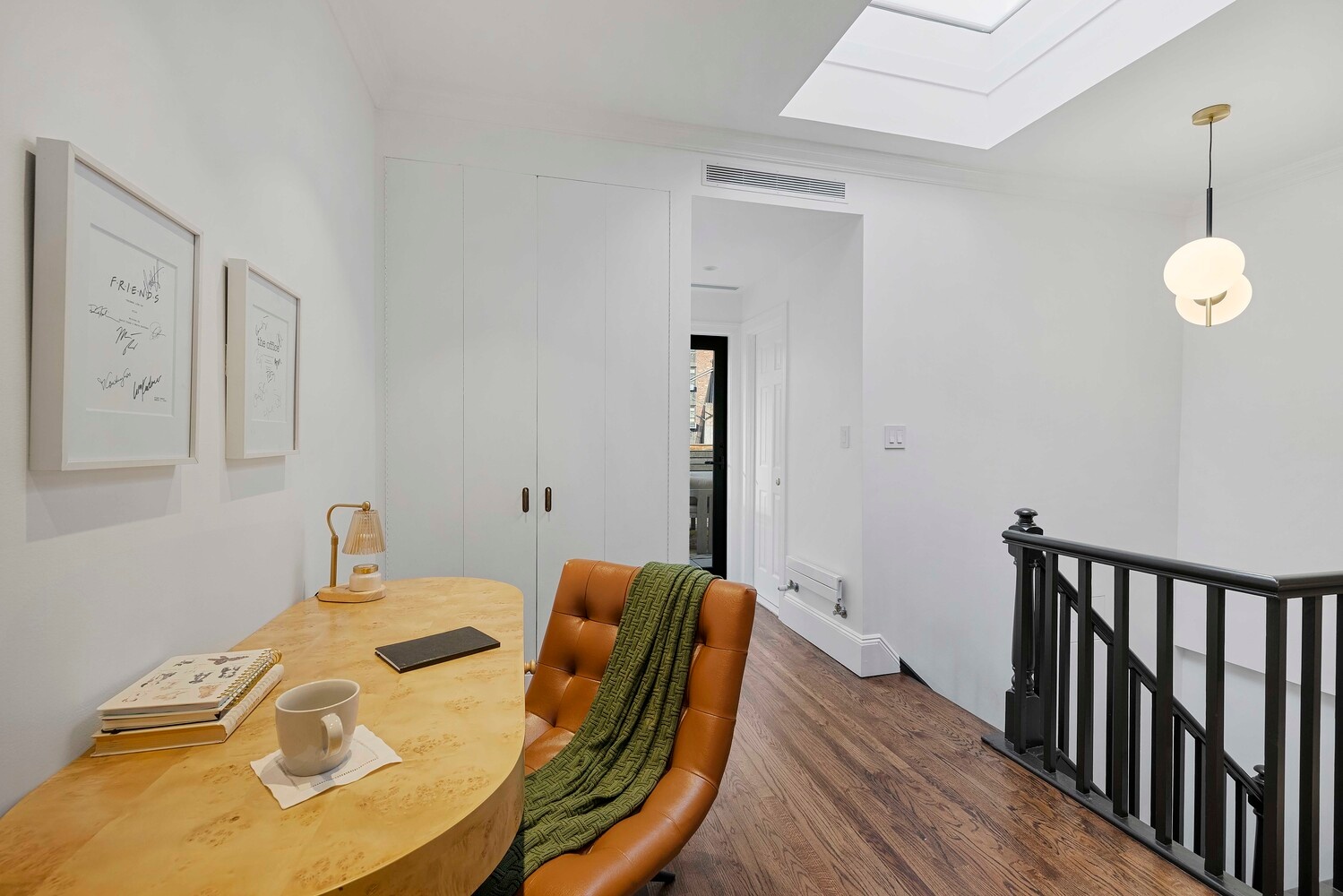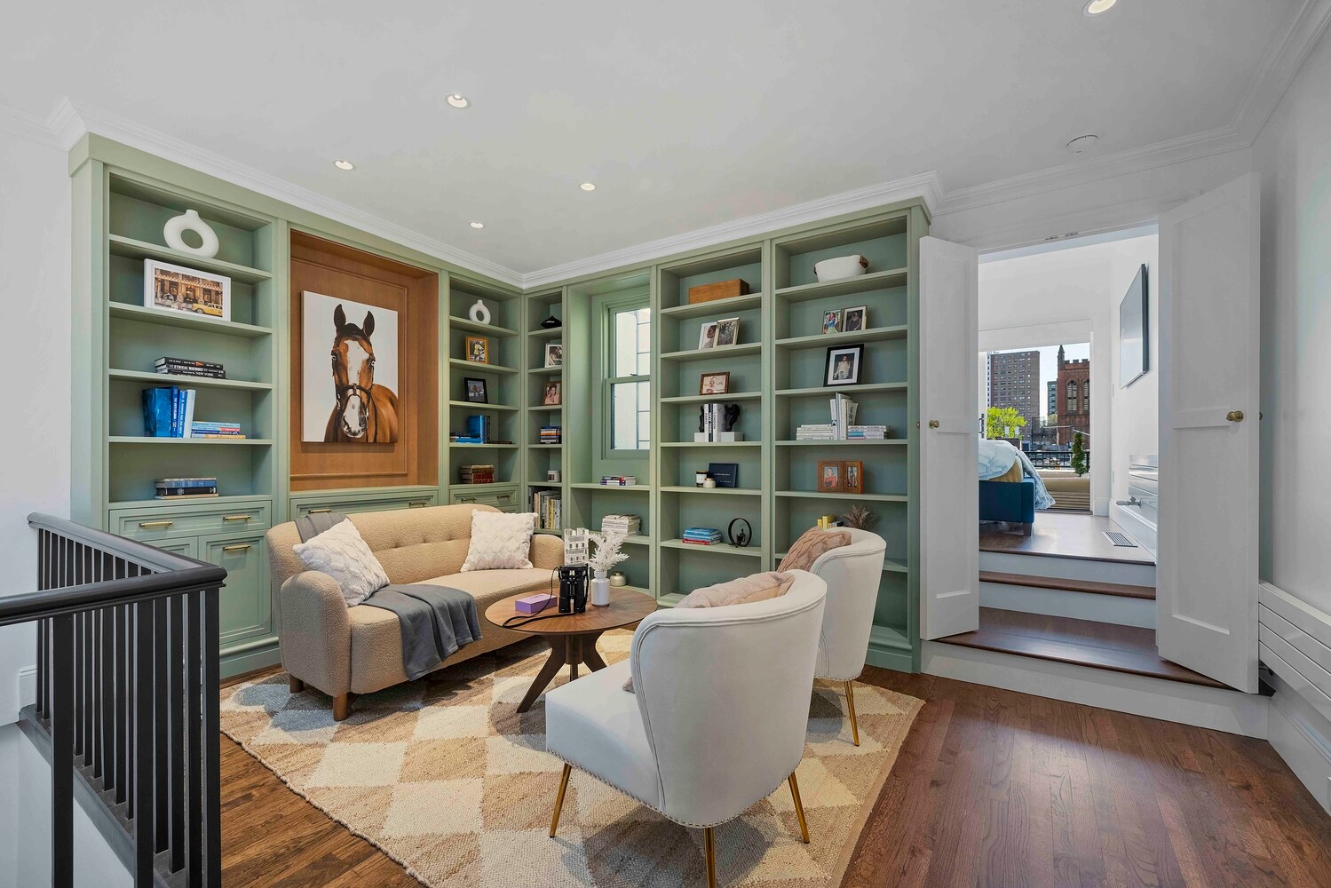 Upstairs, the home opens into a remarkable second living area where space, light, and scale are on full display. A large library, lined with custom built-ins and illuminated by a dramatic skylight above, offers room for both a sitting area and a home office. A convenient full bathroom is also located on this floor. An additional bedroom with a wall of glass opens directly to the south-facing terrace.