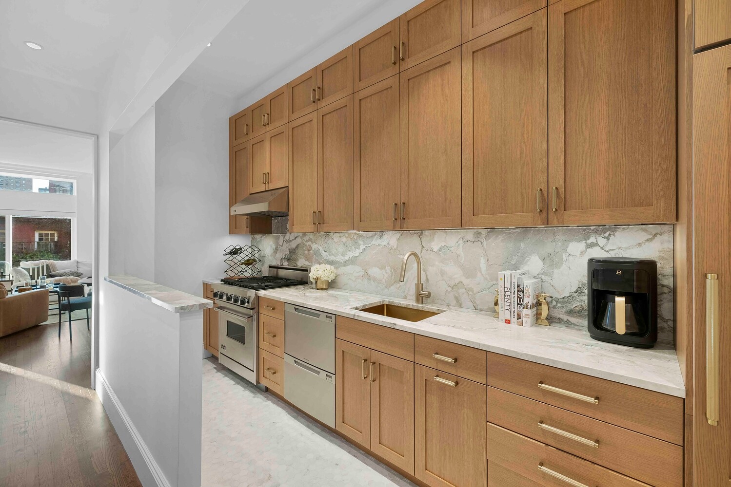 The kitchen has been beautifully renovated with luxurious finishes, including a striking quartzite countertop and matching backsplash. It features a Sub-Zero refrigerator, Viking range, and Fisher & Paykel DishDrawer dishwasher, all set within a clean, efficient layout that connects seamlessly to the main living space while remaining visually contained. The home is equipped with central air conditioning.