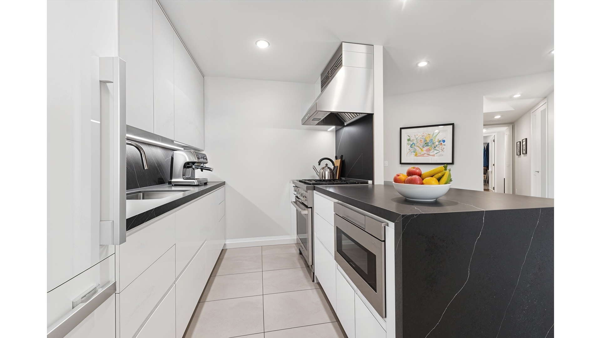 The open-concept kitchen has been meticulously redesigned for both everyday living and elegant entertaining, featuring a dining bar, a full suite of Miele appliances, striking quartzite countertops, and bespoke cabinetry of the highest quality.