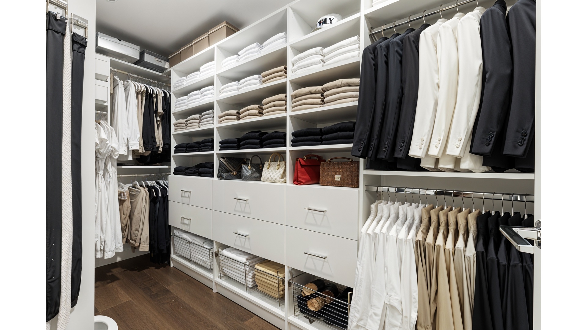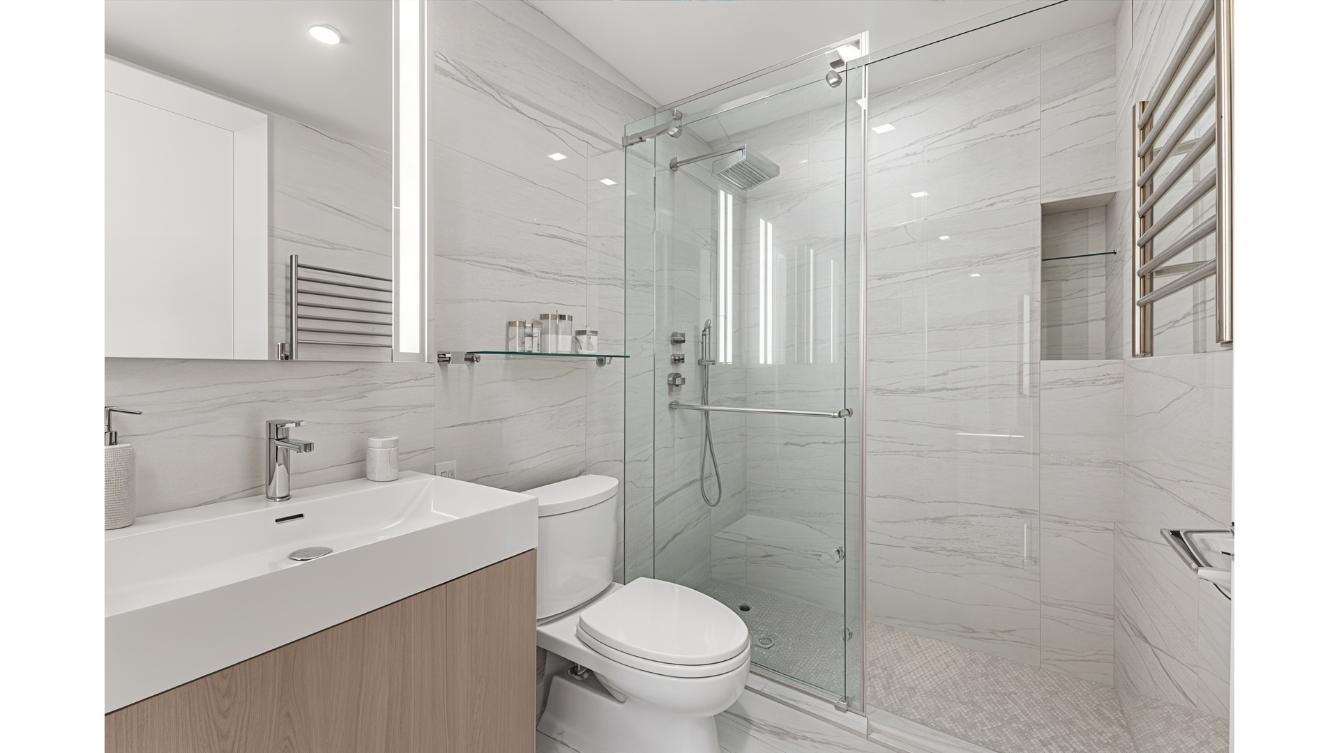 The king-sized primary suite offers a tranquil retreat, complete with a generously proportioned walk-in closet and a spa-like en-suite bath with a large glass-enclosed shower. Two additional bedrooms are equally well-scaled and appointed, each offering excellent proportions, abundant closet space, and custom built-ins with integrated lighting. All closets throughout the residence have been fully customized. A private storage unit transfers with the sale.