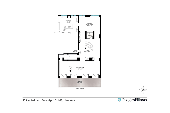 The entry sequence is defined by a sculptural curved staircase, setting a strong architectural tone from the moment you arrive. The main level is designed for both everyday living and entertaining at scale. A generously proportioned living room opens to the terrace through floor-to-ceiling French doors, bringing in natural light and framing the park as a constant backdrop. A double-sided fireplace creates separation without interrupting flow, connecting to a more intimate sitting area with built-in shelving.