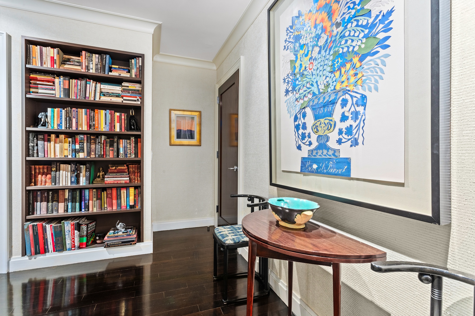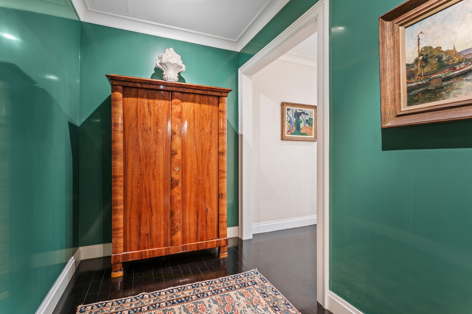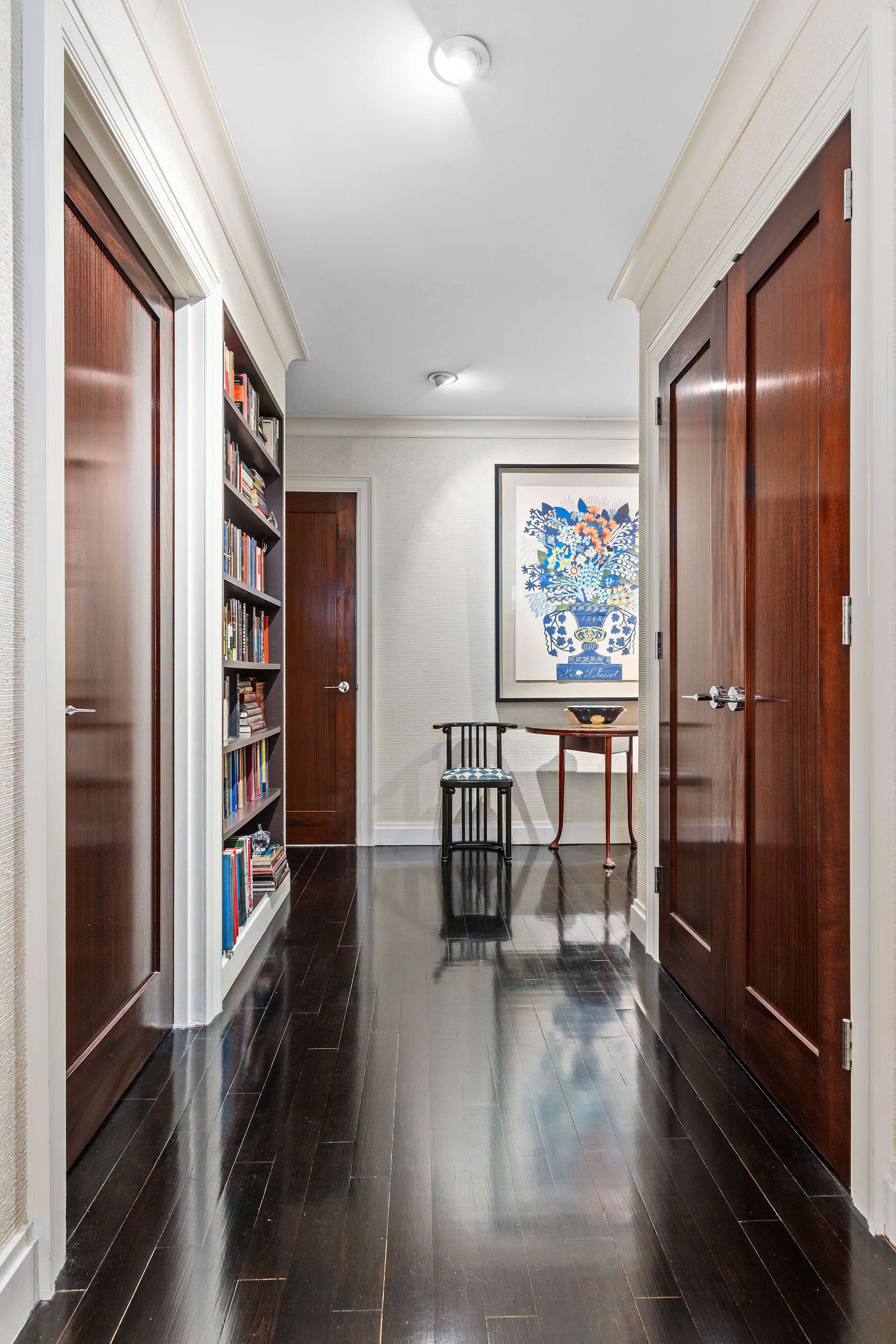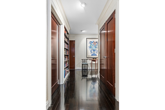 The gorgeous, wide hallway begins with a huge storage closet hidden behind bespoke horn-handled doors, followed by two recessed floor-to-ceiling bookcases, and three spacious double closets behind mahogany doors, one housing a stacked Miele washer and dryer.