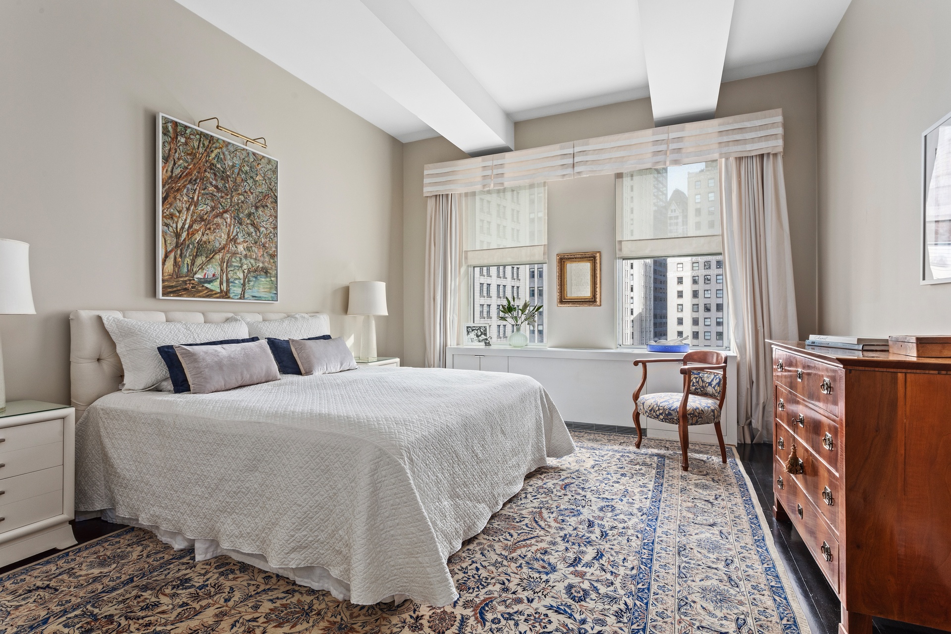Spanning 2,200 square feet, this serene 15th floor corner residence features north and west exposures, bathing the space in soft natural light throughout the day, creating a warm and inviting atmosphere.