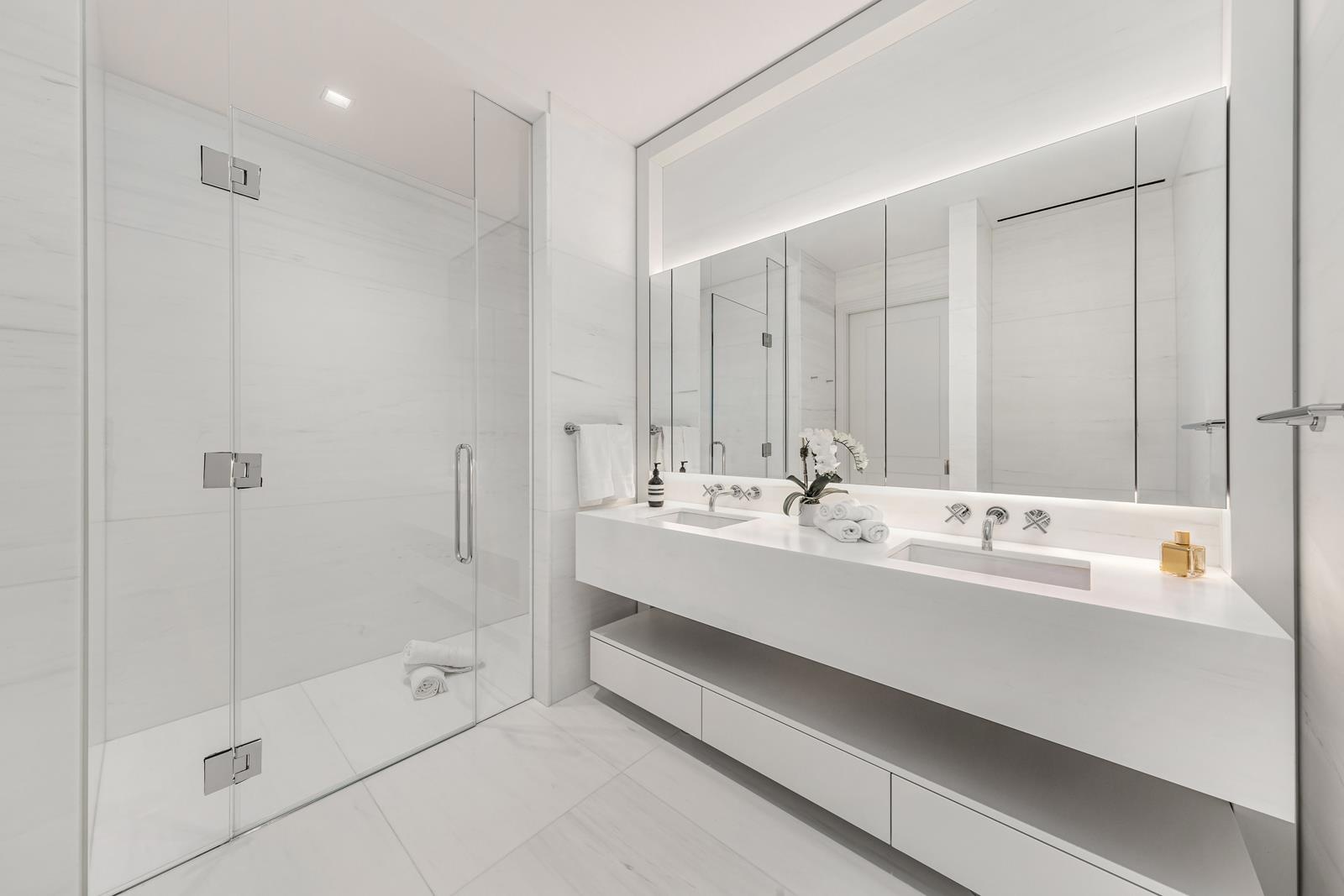 The primary bedroom features south—and east-facing views and a sitting area for reading or a small home office. The primary bath has side-by-side sinks, a notable full-stone stall shower with thermostatic controls, radiant heated floors, and mirrored medicine cabinets with integrated LED lighting and power.