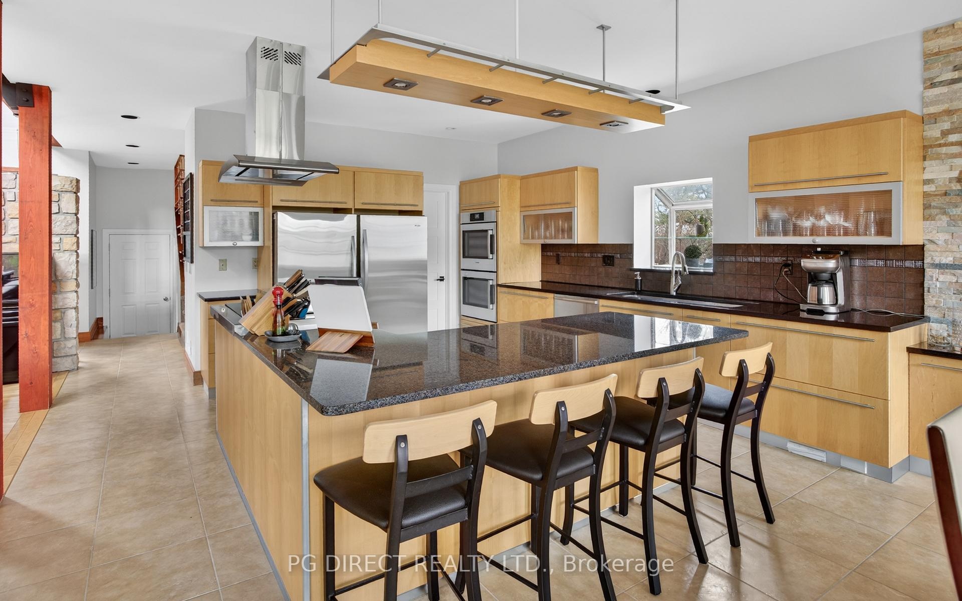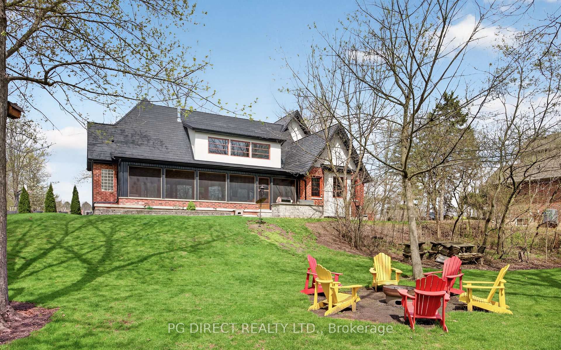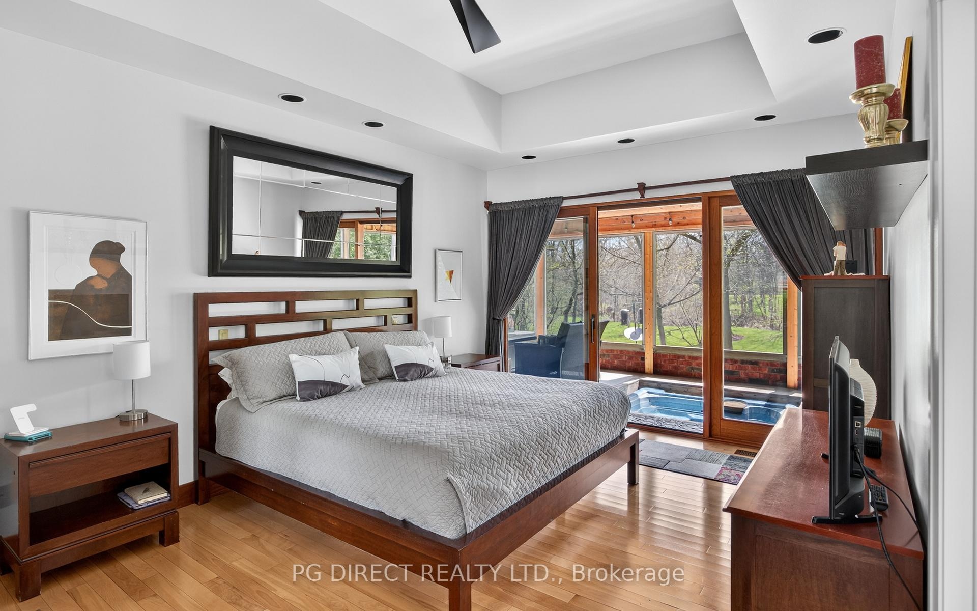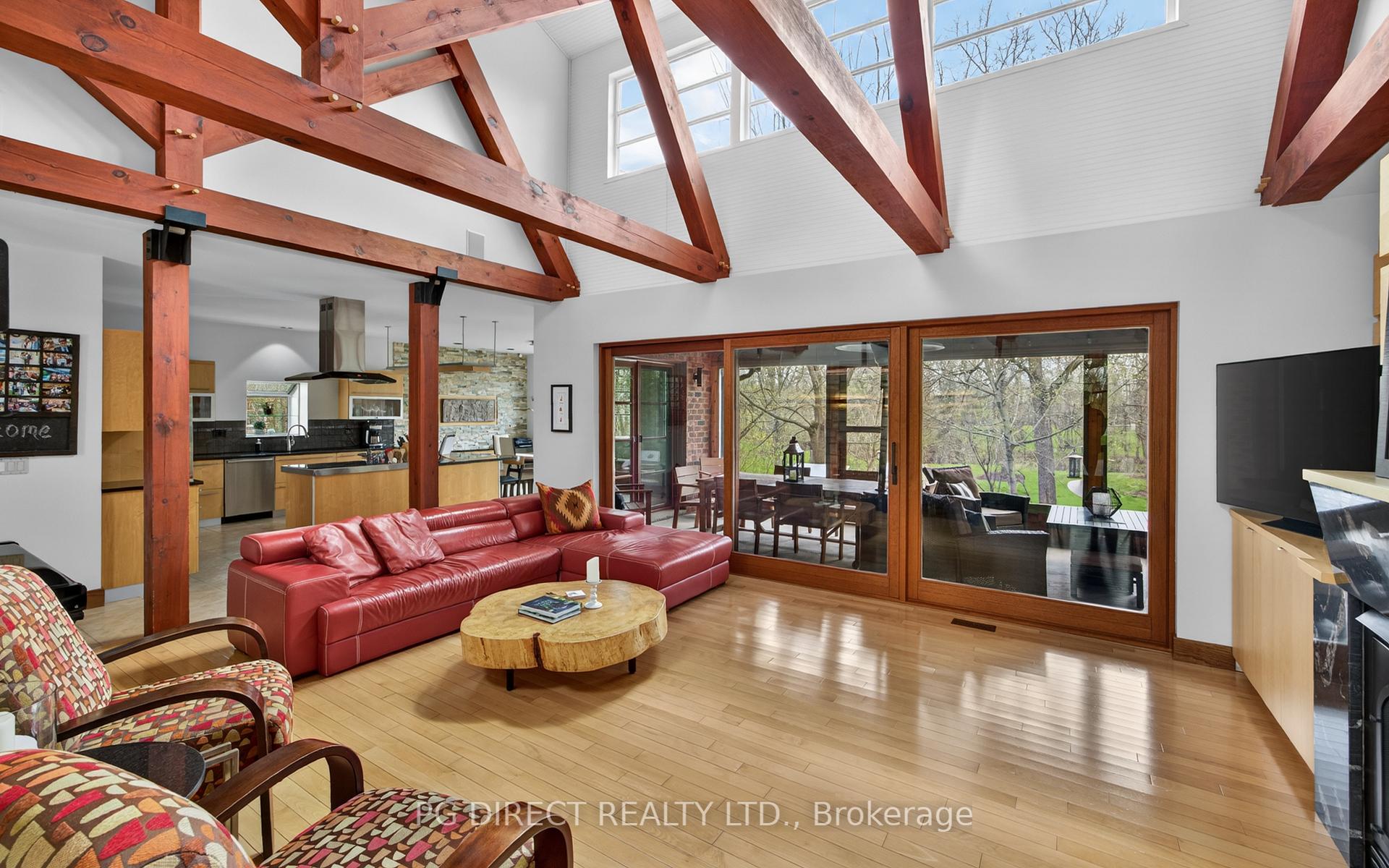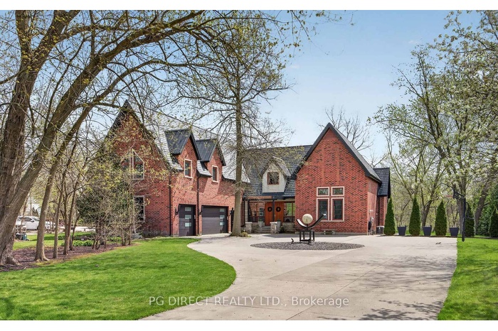 Visit REALTOR website for additional information. Luxury Country Living Discover a rare opportunity to own a custom home design & built home perfectly situated on a private, picturesque acre lot. The rear half-acre gently slopes down to a tranquil creek, offering serene views and unmatched privacy. Welcoming foyer with dramatic art wall and spacious living room ideal for entertaining. In-floor heating of all tile surfaces. Modern kitchen featuring a double oven, convection cooktop, upright fridge & freezer, lärge custom sink, bright dining area with double doors to screened porch. Pantry & laundry room conveniently located. Stylish single bathroom for guests. Private primary bedroom suite with glass wall & sliding door for direct access to screen porch with sunken hot tub. Ensuite bathroom, den with gas fireplace and soaring 16' ceiling. Outdoor Living includes a large screened porch overlooking the rolling hill, outdoor kitchen with both charcoal and gas barbecues. Peaceful natural setting with mature trees and creek views. Upper Level above garage has an expansive living area with extensive in-wall storage, 3 designer bedrooms, all with 16' ceilings, separate3-piece bathroom & dedicated storage room.