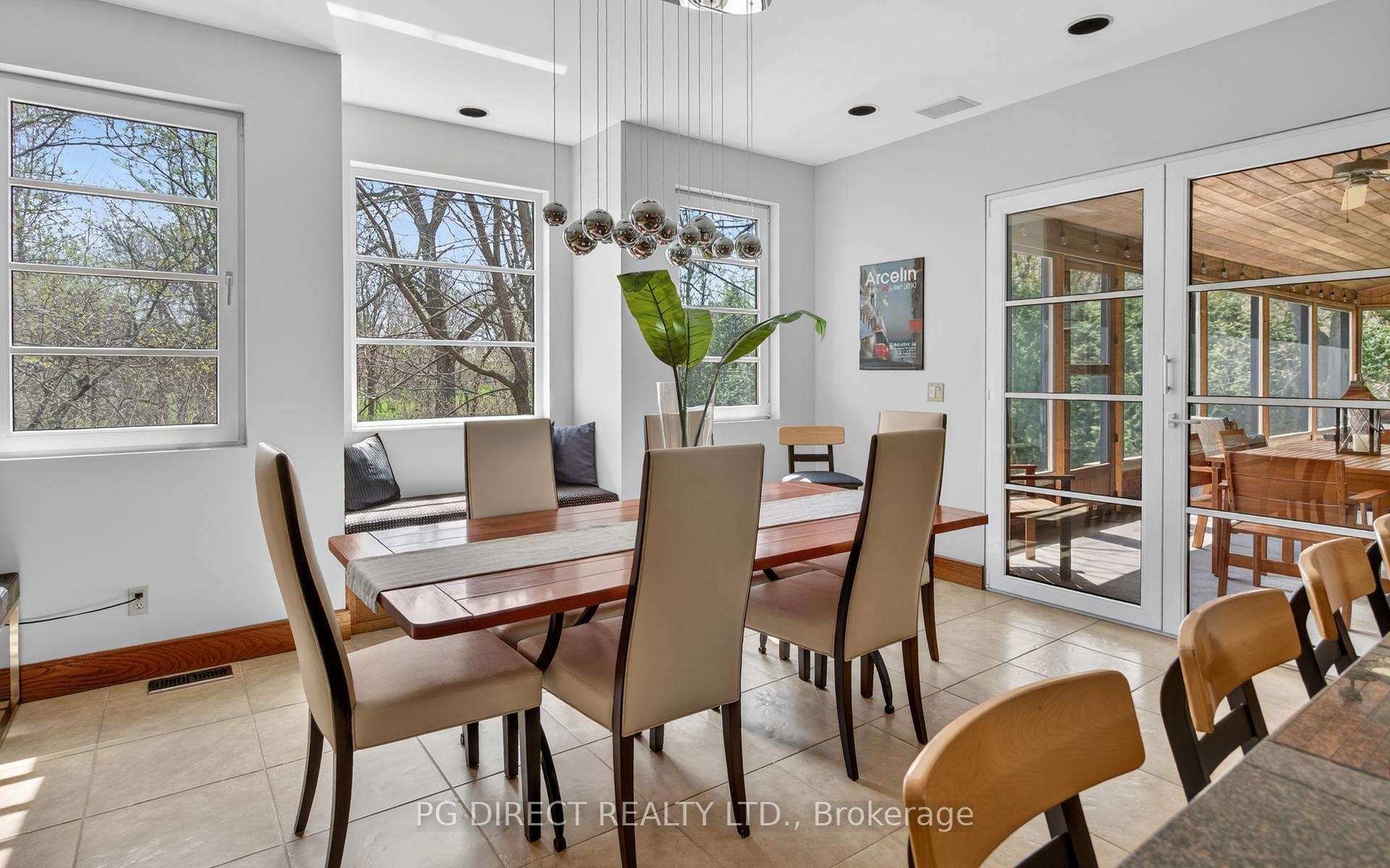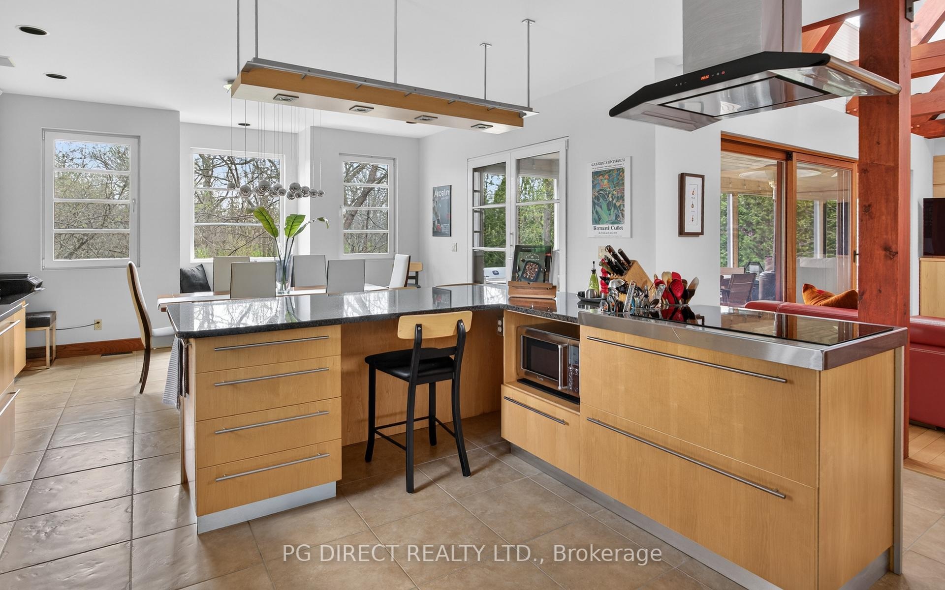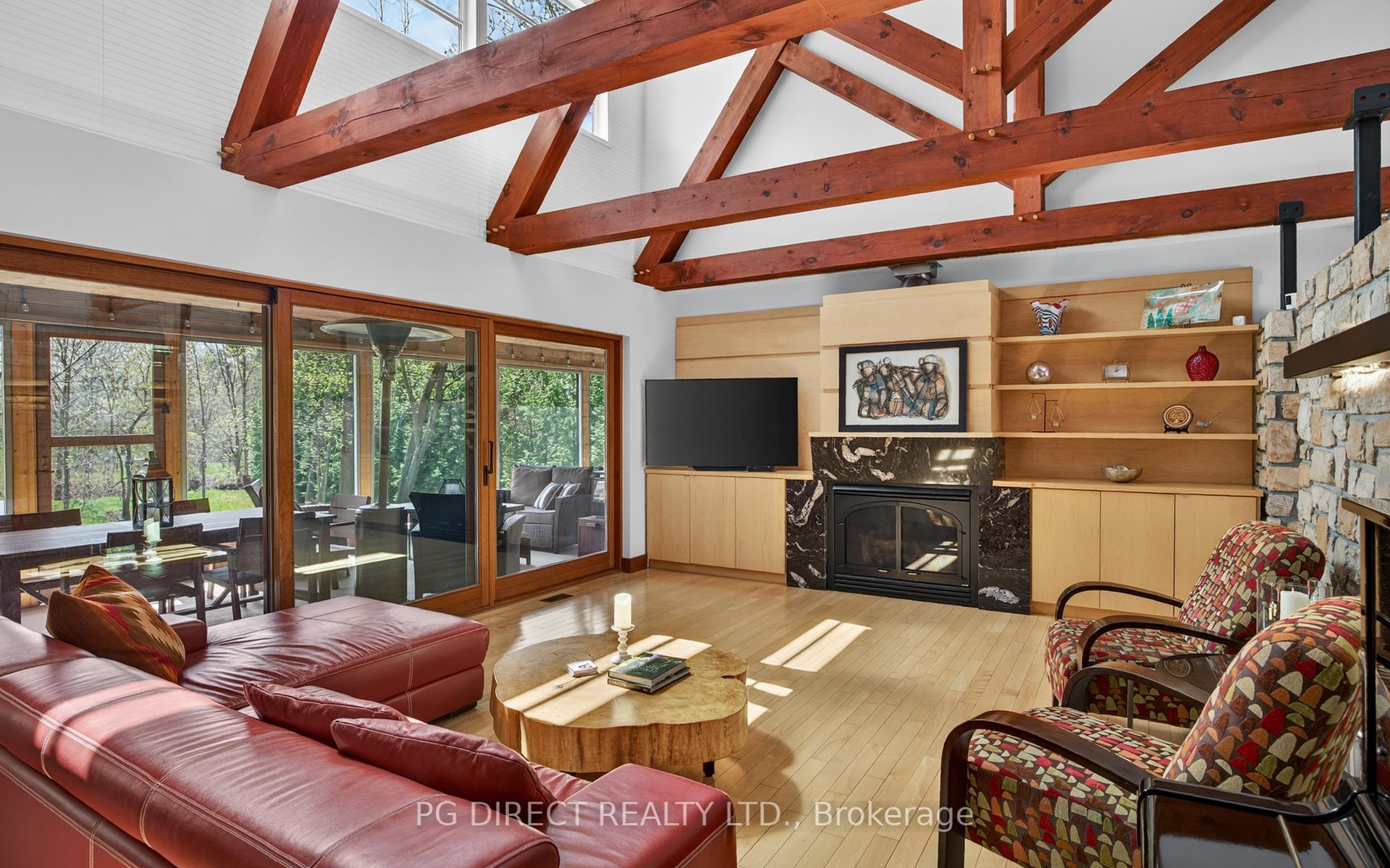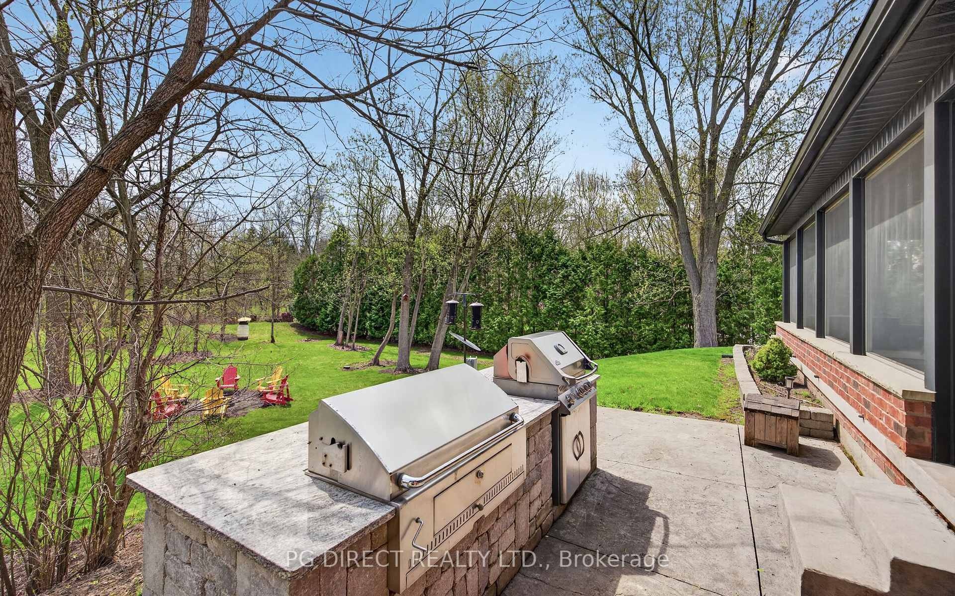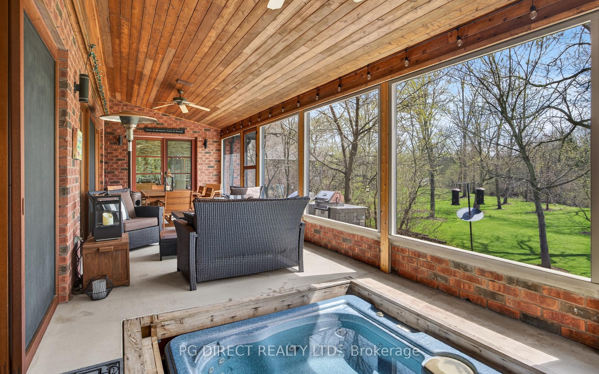 Visit REALTOR website for additional information. Luxury Country Living Discover a rare opportunity to own a custom home design & built home perfectly situated on a private, picturesque acre lot. The rear half-acre gently slopes down to a tranquil creek, offering serene views and unmatched privacy. Welcoming foyer with dramatic art wall and spacious living room ideal for entertaining. In-floor heating of all tile surfaces. Modern kitchen featuring a double oven, convection cooktop, upright fridge & freezer, lärge custom sink, bright dining area with double doors to screened porch. Pantry & laundry room conveniently located. Stylish single bathroom for guests. Private primary bedroom suite with glass wall & sliding door for direct access to screen porch with sunken hot tub. Ensuite bathroom, den with gas fireplace and soaring 16' ceiling. Outdoor Living includes a large screened porch overlooking the rolling hill, outdoor kitchen with both charcoal and gas barbecues. Peaceful natural setting with mature trees and creek views. Upper Level above garage has an expansive living area with extensive in-wall storage, 3 designer bedrooms, all with 16' ceilings, separate3-piece bathroom & dedicated storage room.