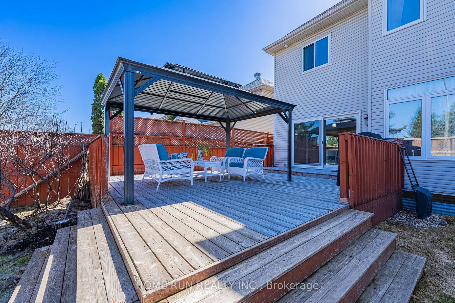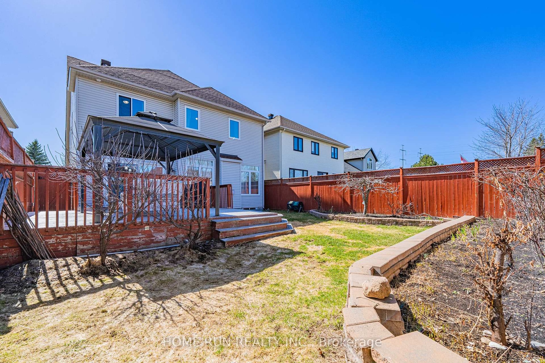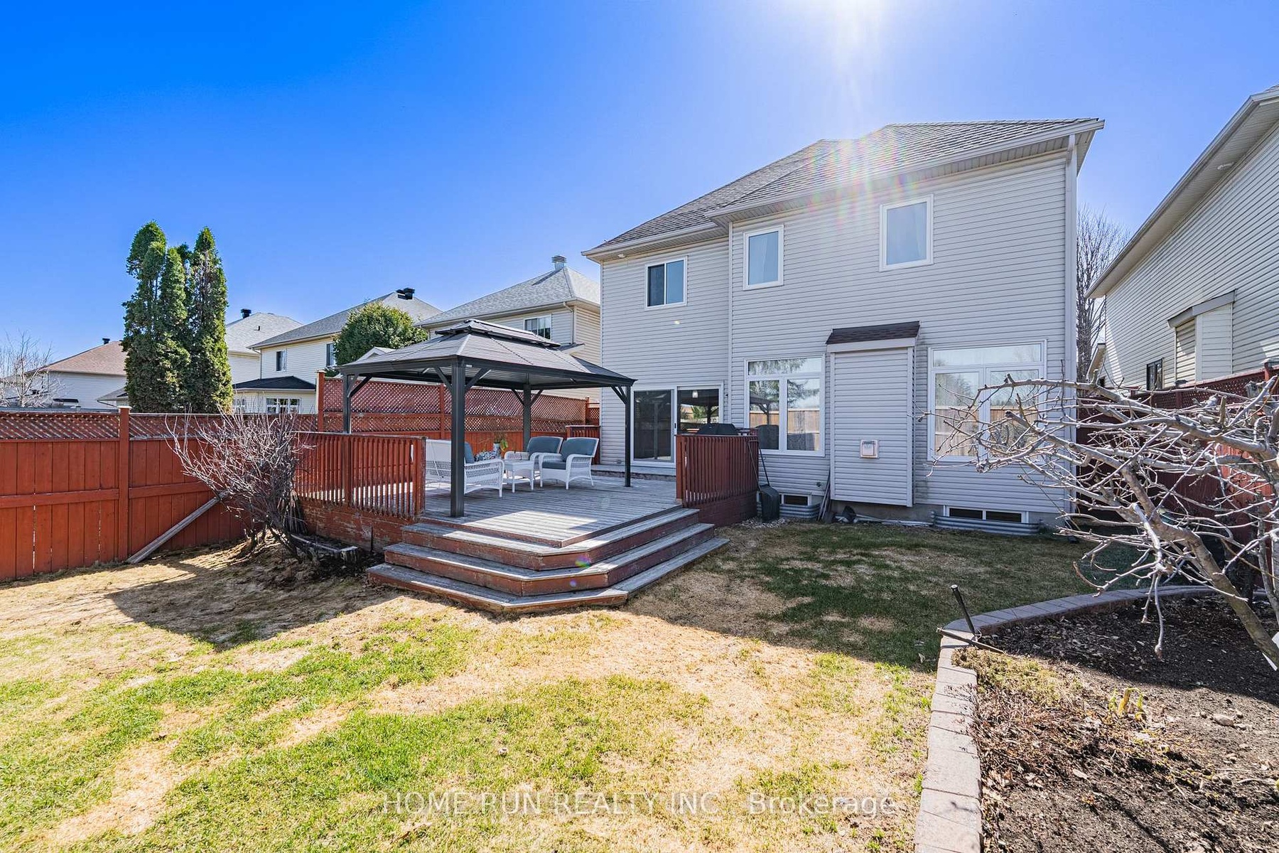 This is a rare find - a true 5-bedroom, 3.5-bath home on a quiet street in Bridlewood, one of Kanata South's most established and sought-after neighbourhoods. Built by Tamarack Homes in 1999 and once selected as a CHEO Dream Home, the property sits on an oversized lot with no rear neighbours and mature trees framing the home front to back. Inside, new hardwood floors run throughout both levels, and the staircase - with its wood treads and wrought iron spindles - makes a strong first impression. The kitchen is the heart of the home: white cabinetry to the ceiling, granite counters, a large curved island with breakfast bar, mosaic tile backsplash, and stainless steel appliances. A custom extra-wide patio door opens directly to the deck, gazebo, and fully fenced backyard - perfect for summer evenings. Upstairs, the primary bedroom features a vaulted ceiling and a beautiful arched window, and two of the five bedrooms have their own ensuite baths. The basement was freshly finished in fall 2025, with new flooring and pot lights offering plenty of room for a rec room, home gym, or play space. Major updates have been taken care of: all windows replaced in fall 2024 with triple glazing and a transferable 25-year warranty, new hardwood upstairs in spring 2025, added attic insulation, and a full roof inspection completed. Steps to NCC trails, great schools, and all the shopping and dining Kanata South has to offer.