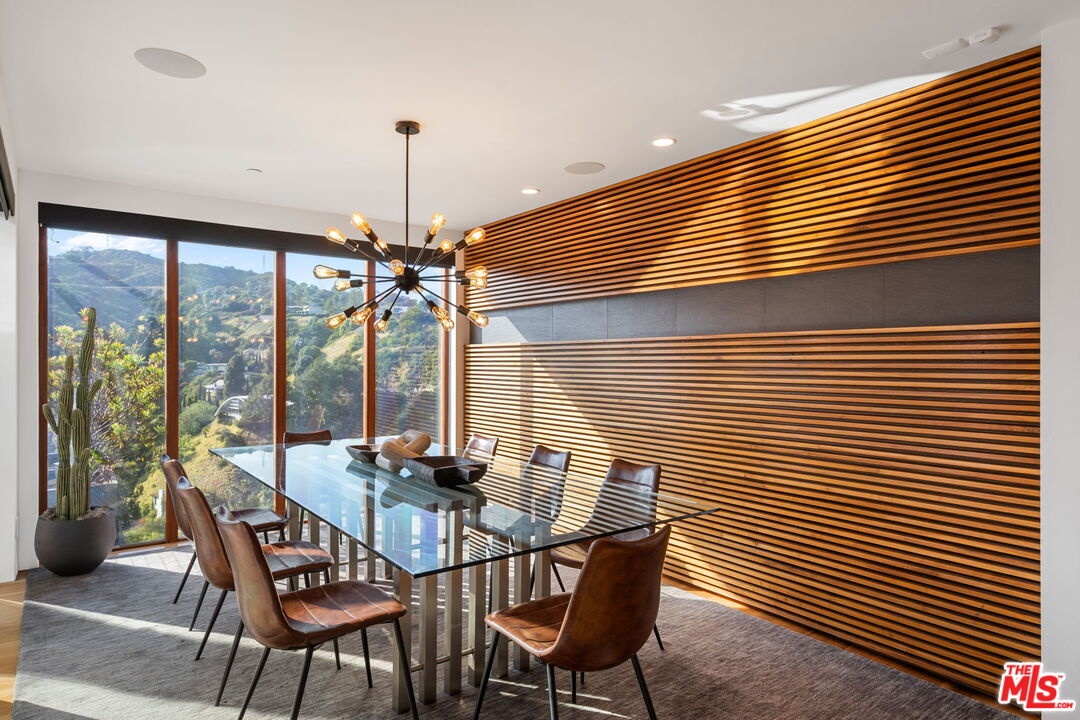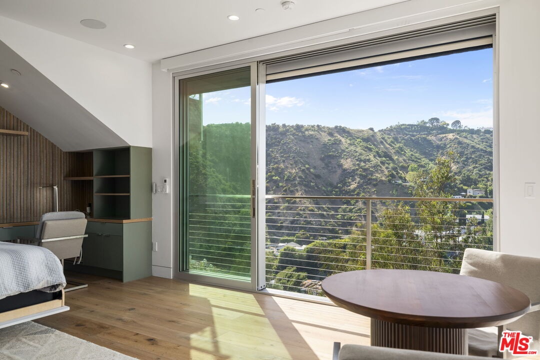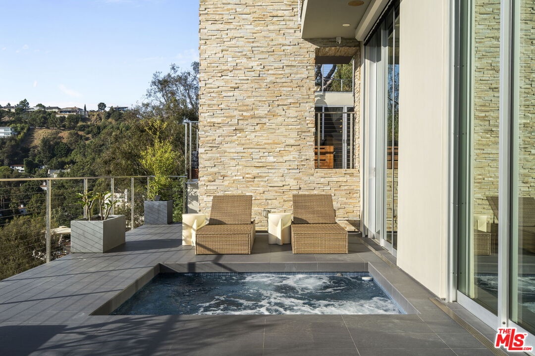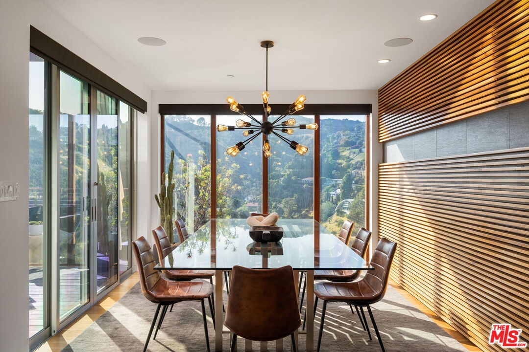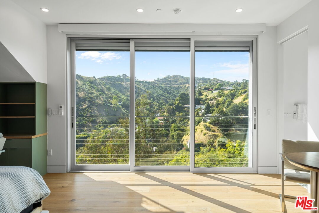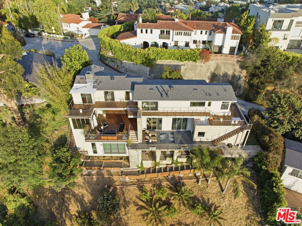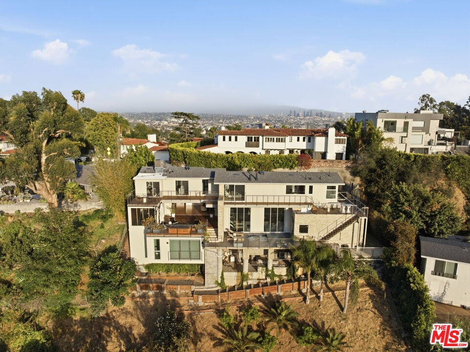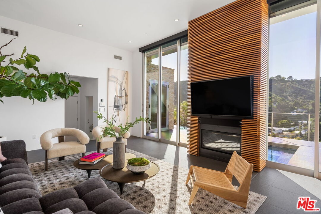 Positioned high above the canyon in the Hollywood Hills, this striking contemporary residence delivers the scale, presence, and seamless indoor-outdoor lifestyle expected at the upper tier of the market. Architecturally intentional in its design and further elevated by the current owners through targeted enhancements, the home offers a level of livability and entertaining capacity that meaningfully distinguishes it from its peers. Walls of Fleetwood stacking and pocketing glass sliders define the experience, dissolving boundaries between interior living spaces and expansive terraces that capture sweeping canyon views from every room. A six-panel Fleetwood system at the main level disappears entirely, transforming the home into a true extension of its surroundings and creating a resort-like environment equally suited for intimate evenings or large-scale gatherings. The dining room, anchored by a custom inlaid wood panel wall, sits at the edge of home featuring floor-to-ceiling windows that create the sensation of floating above the canyon while you dine. Across the home in the media room, complete with a built-in bar and dramatic high ceilings, this same custom woodwork, paired with integrated slate finishes that extend from inside to out, introduces warmth and permanence grounding the modern architecture in a refined, timeless material palette. The media room, complete with a built-in bar and dramatic openings, serves as a central entertaining hub with direct access to the sunken plunge pool and spa, as well as the surrounding decks. A newly added steam room introduces a spa-caliber experience, positioned with direct access to the main deck and oversized hot tub designed to function as both a rapid-heat spa and a cold plunge. The transition between these elements creates a cohesive indoor-outdoor wellness environment. From the spa level, an exterior staircase leads directly to the primary suite, where a Japanese-inspired soaking tub and expansive walk-in rain shower complete the experience. Outdoor living has been executed with precision and intention. Multiple terraces, a high-output fire pit, and ceiling mounted heating elements allow for year-round usability of the outdoor spaces. A professionally installed motorized retractable screen system encloses the large Fleetwood openings at the touch of a button, preserving the open-air experience while enhancing comfort, climate control, and functionality for the days you prefer to stay inside while still taking in the fresh breeze. Smart home integration implemented by the current owners includes Lutron lighting, distributed audio, MyQ garage control, AquaLink spa management, ADT security hardware, closed circuit security cameras, DoorBird, Shade Store motorized shades, and four-zone climate control (two gas + two electric systems). Additional upgrades include tankless water heaters, a new roof (2025), Toto heated bidet toilets on both levels, custom garage cabinetry, and multiple 220V charging outlets. The new ADU (2023) expands the property's functionality with a separate entrance, full kitchen, laundry, and a 120-inch 4K projection system. A three-panel Fleetwood slider system with a motorized retractable screen connects the space to the outdoors seamlessly, creating a flexible, design-forward environment ideal for guests, extended stays, or income potential. Both the main kitchen and the ADU feature Wolf and other luxury appliances and Fisher & Paykel dual-drawer dishwashers, reflecting a consistent level of finish throughout. The ADU further includes its own washer and dryer along with a full-size EuroCave wine refrigerator. The hybrid foundation is comprised of a concrete slab over 22 solid caissons down to bedrock. With its combination of architectural scale, premium materials, and thoughtfully executed enhancements, this residence offers a level of presence, functionality, and experiential living that firmly supports its position within the upper echelon of the market.