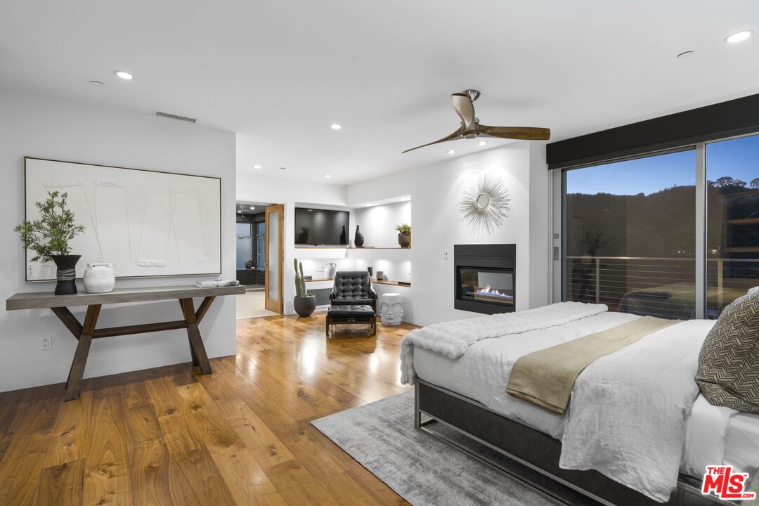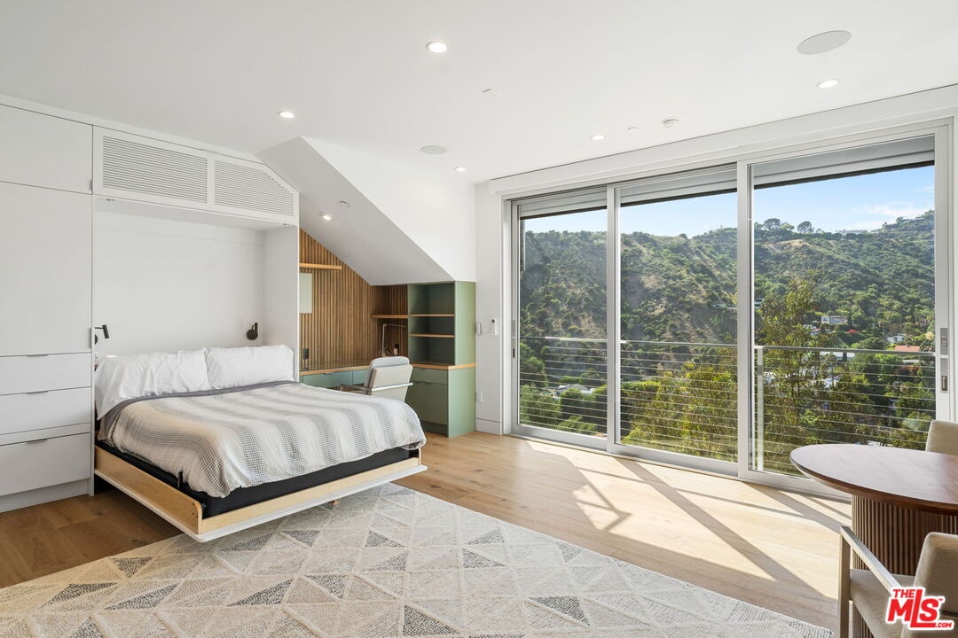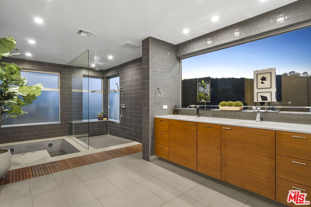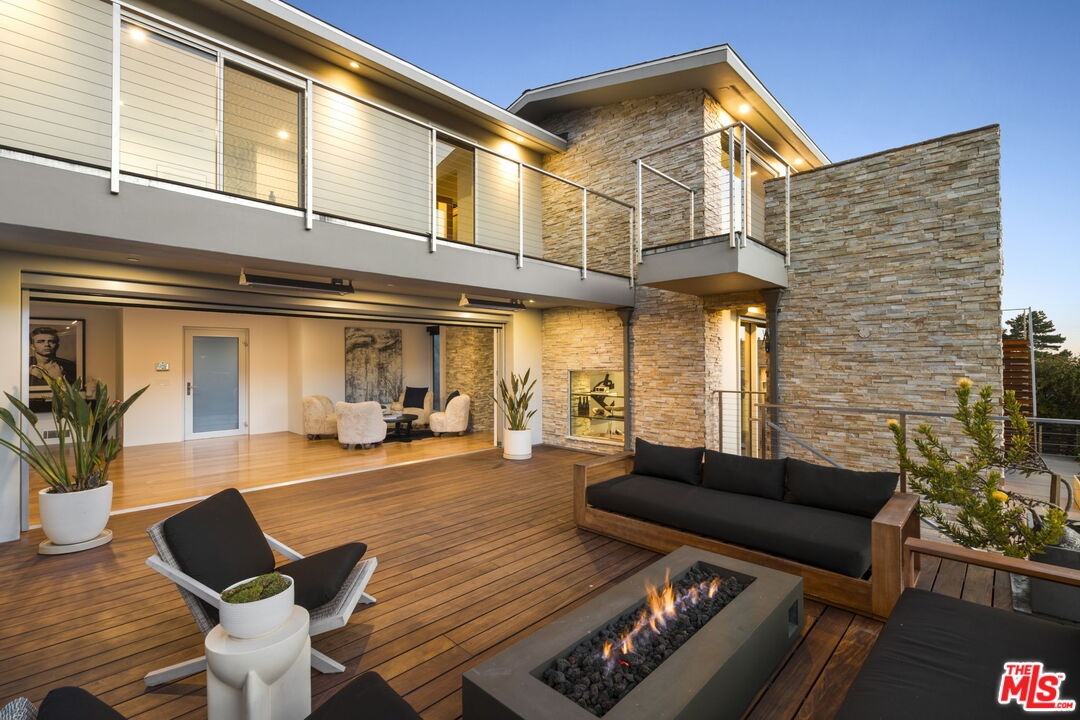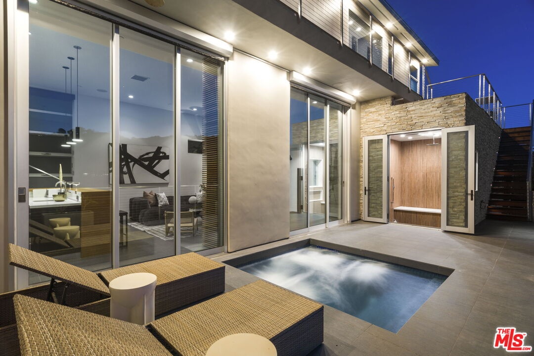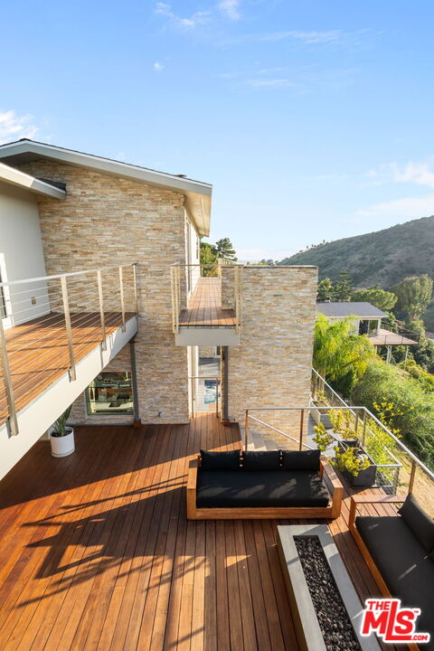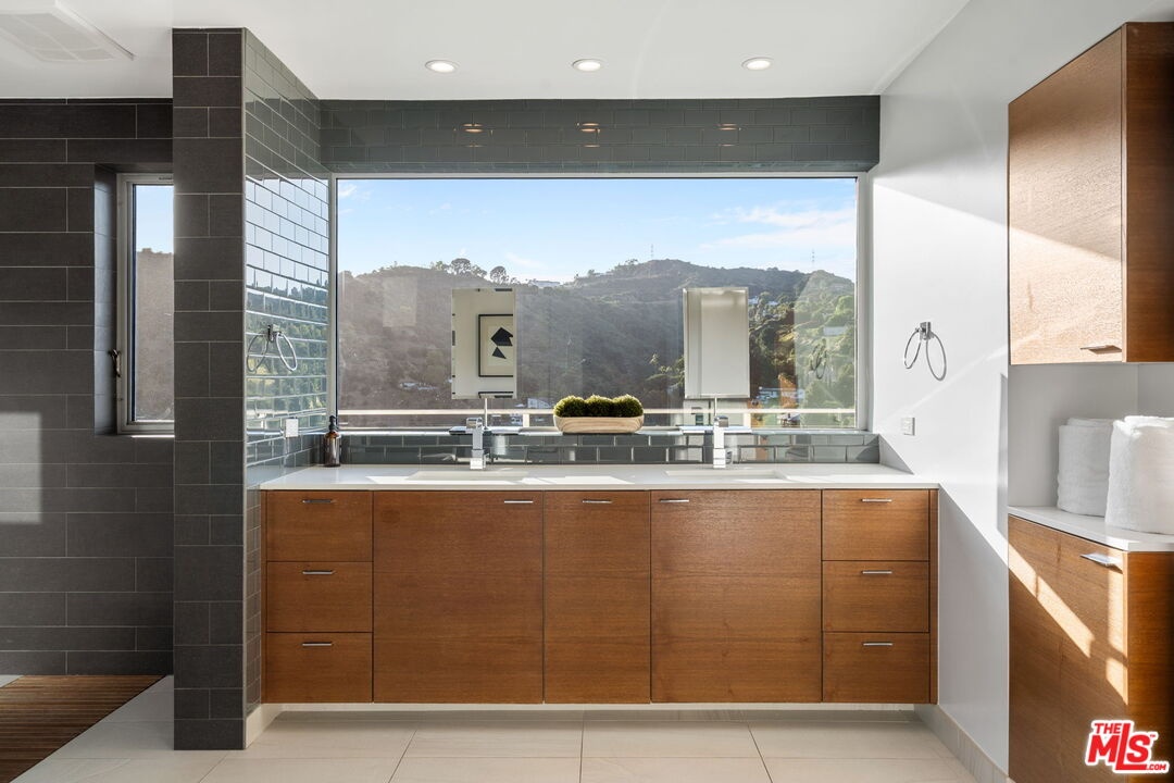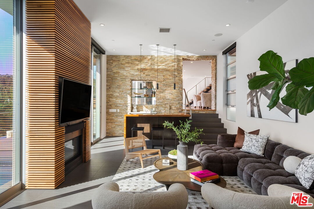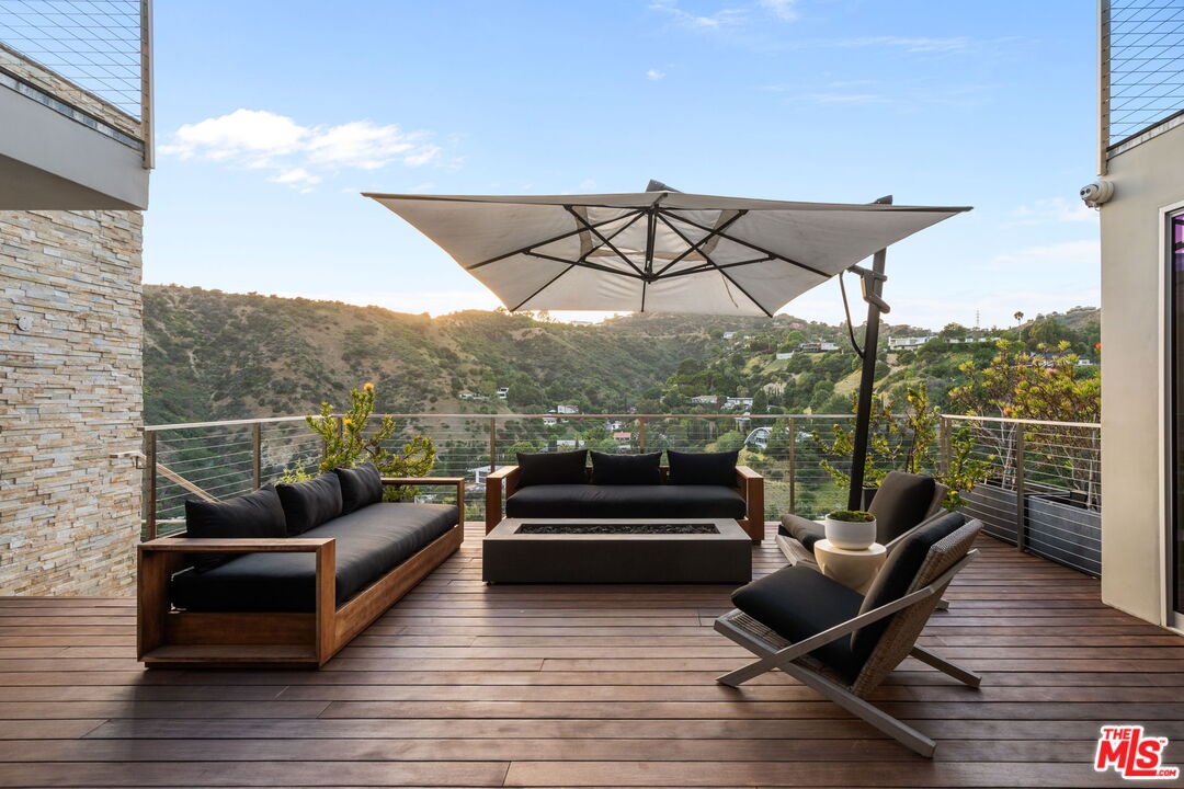 Positioned high above the canyon in the Hollywood Hills, this striking contemporary residence delivers the scale, presence, and seamless indoor-outdoor lifestyle expected at the upper tier of the market. Architecturally intentional in its design and further elevated by the current owners through targeted enhancements, the home offers a level of livability and entertaining capacity that meaningfully distinguishes it from its peers. Walls of Fleetwood stacking and pocketing glass sliders define the experience, dissolving boundaries between interior living spaces and expansive terraces that capture sweeping canyon views from every room. A six-panel Fleetwood system at the main level disappears entirely, transforming the home into a true extension of its surroundings and creating a resort-like environment equally suited for intimate evenings or large-scale gatherings. The dining room, anchored by a custom inlaid wood panel wall, sits at the edge of home featuring floor-to-ceiling windows that create the sensation of floating above the canyon while you dine. Across the home in the media room, complete with a built-in bar and dramatic high ceilings, this same custom woodwork, paired with integrated slate finishes that extend from inside to out, introduces warmth and permanence grounding the modern architecture in a refined, timeless material palette. The media room, complete with a built-in bar and dramatic openings, serves as a central entertaining hub with direct access to the sunken plunge pool and spa, as well as the surrounding decks. A newly added steam room introduces a spa-caliber experience, positioned with direct access to the main deck and oversized hot tub designed to function as both a rapid-heat spa and a cold plunge. The transition between these elements creates a cohesive indoor-outdoor wellness environment. From the spa level, an exterior staircase leads directly to the primary suite, where a Japanese-inspired soaking tub and expansive walk-in rain shower complete the experience. Outdoor living has been executed with precision and intention. Multiple terraces, a high-output fire pit, and ceiling mounted heating elements allow for year-round usability of the outdoor spaces. A professionally installed motorized retractable screen system encloses the large Fleetwood openings at the touch of a button, preserving the open-air experience while enhancing comfort, climate control, and functionality for the days you prefer to stay inside while still taking in the fresh breeze. Smart home integration implemented by the current owners includes Lutron lighting, distributed audio, MyQ garage control, AquaLink spa management, ADT security hardware, closed circuit security cameras, DoorBird, Shade Store motorized shades, and four-zone climate control (two gas + two electric systems). Additional upgrades include tankless water heaters, a new roof (2025), Toto heated bidet toilets on both levels, custom garage cabinetry, and multiple 220V charging outlets. The new ADU (2023) expands the property's functionality with a separate entrance, full kitchen, laundry, and a 120-inch 4K projection system. A three-panel Fleetwood slider system with a motorized retractable screen connects the space to the outdoors seamlessly, creating a flexible, design-forward environment ideal for guests, extended stays, or income potential. Both the main kitchen and the ADU feature Wolf and other luxury appliances and Fisher & Paykel dual-drawer dishwashers, reflecting a consistent level of finish throughout. The ADU further includes its own washer and dryer along with a full-size EuroCave wine refrigerator. The hybrid foundation is comprised of a concrete slab over 22 solid caissons down to bedrock. With its combination of architectural scale, premium materials, and thoughtfully executed enhancements, this residence offers a level of presence, functionality, and experiential living that firmly supports its position within the upper echelon of the market.