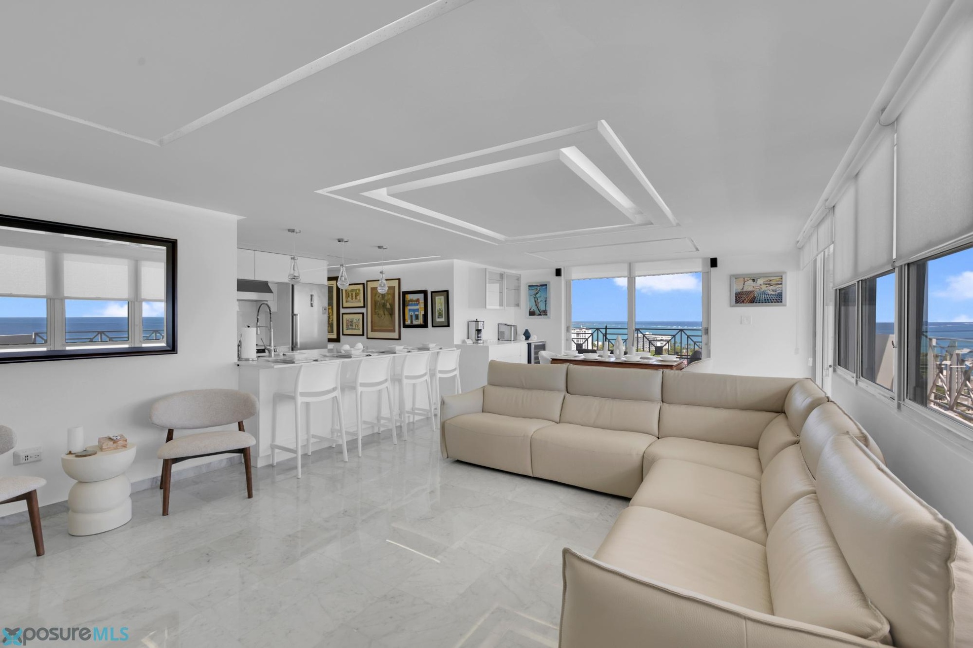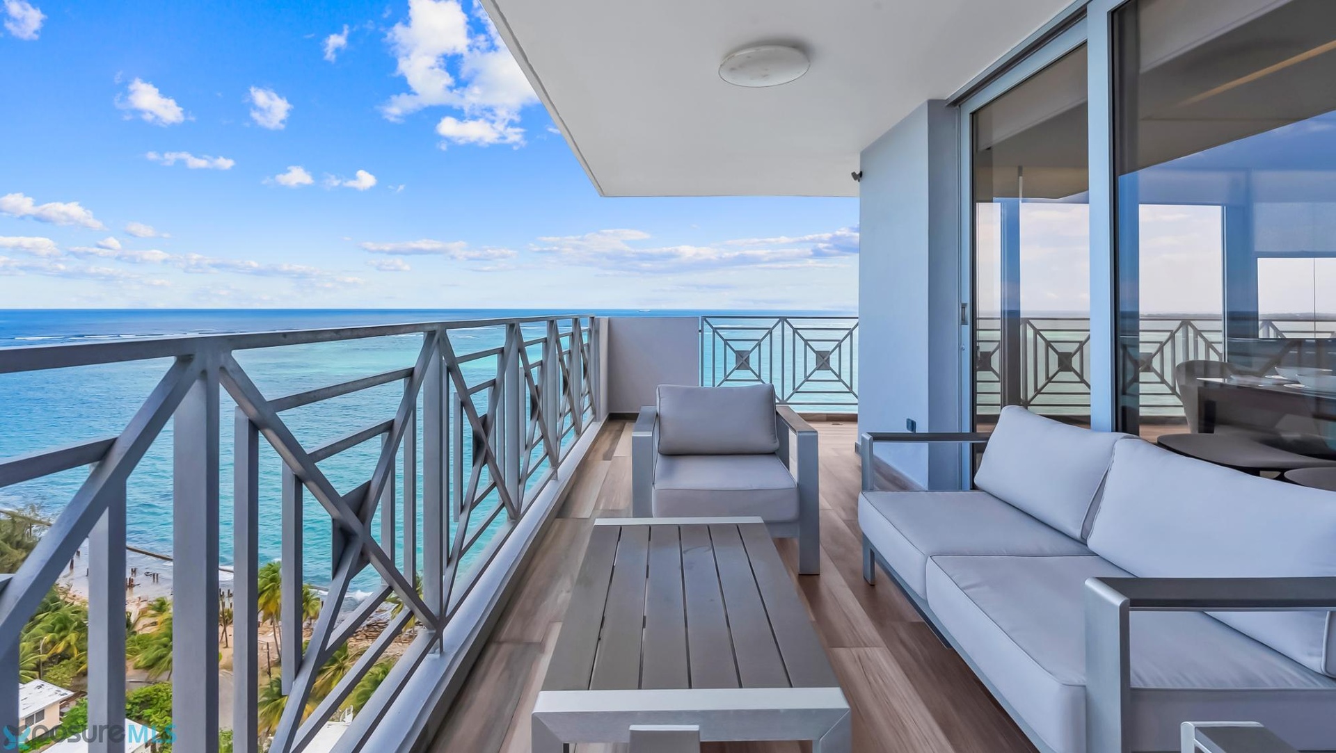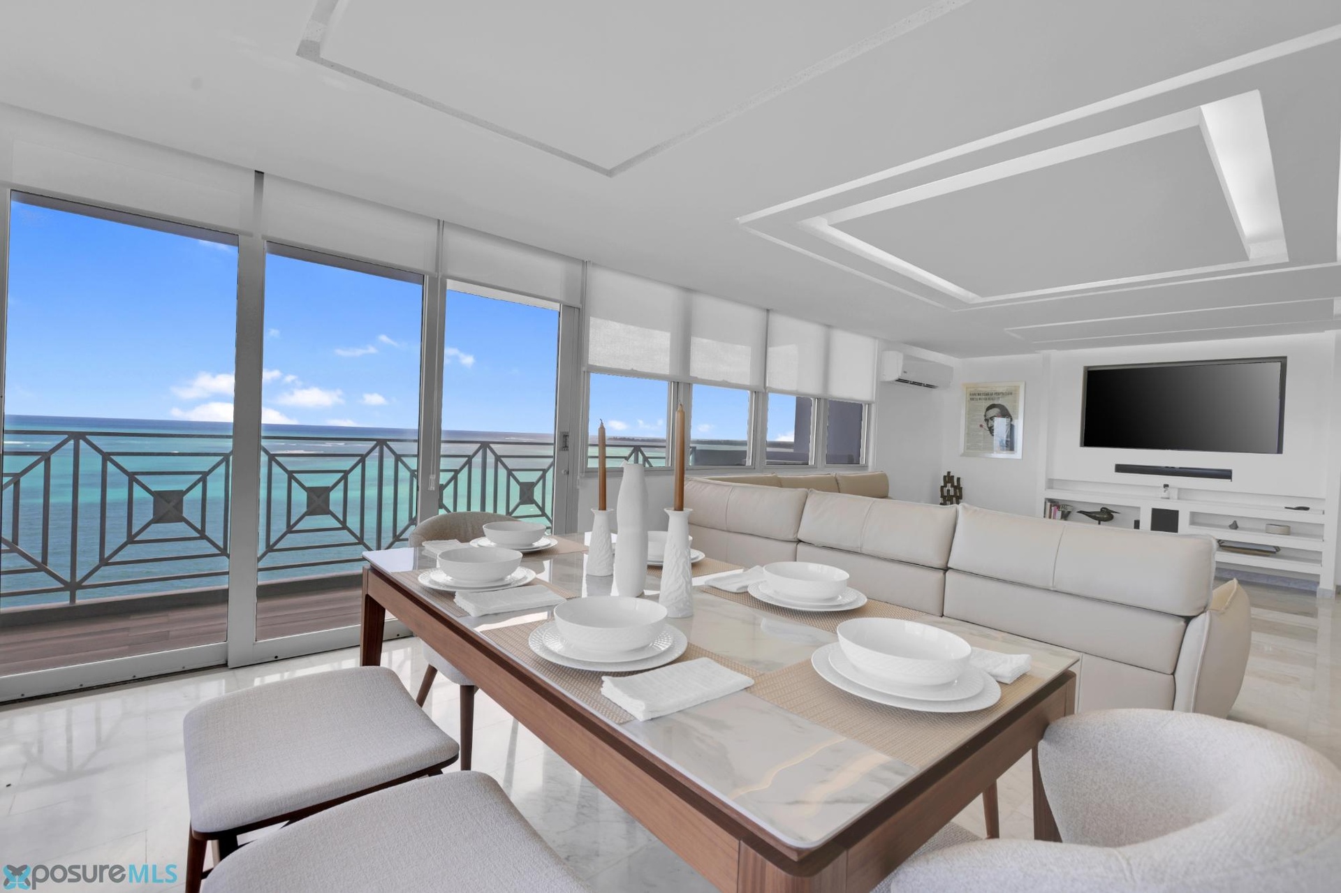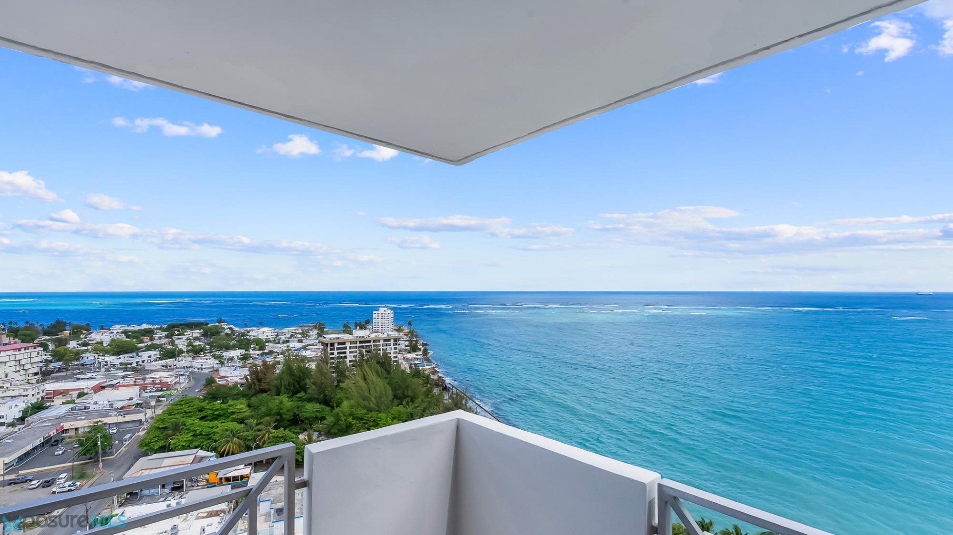 Welcome to a turnkey beachfront residence in the heart of Isla Verde with direct beach access, one of Puerto Rico's premier coastal addresses. A fully serviced residence built around convenience, privacy, and uninterrupted panoramic views. This furnished high-floor unit spans approximately 1,900 sf, with an ensuite main bedroom, two additional bedrooms with abundant natural light, three full bathrooms, two assigned parking spaces, and two private balconies framing the island from north to south. Enjoy beautiful views to the north sweeping across the Atlantic Ocean toward Condado and Old San Juan, plus a different vantage to the south reaching across Isla Verde Avenue, the San José Lagoon, and Puerto Rico's central mountain range with dual panoramic water views rarely available in a single residence. The home has been completely renovated to a contemporary luxury style with porcelain and marble flooring throughout the apartment, framed by modern ceilings with integrated LED ambiance lighting. The open-space layout anchors on a waterfall quartz island kitchen equipped with a full suite of professional-grade stainless-steel appliances, complemented by an integrated wine refrigerator, ice maker, and a dedicated coffee station. What distinguishes this residence, beyond its marvelous design, from a standard furnished rental is its full concierge service structure, all coordinated and paid by the owner: weekly professional housekeeping, monthly pest control treatment, bi-annual A/C maintenance, and high-speed fiber-optic internet included for seamless remote work from day one. This is a concierge residence, not a rental. Plaza del Mar delivers resort-style living with its own backup power generator ensuring uninterrupted service, biometric access, 24/7 on-site security, a fitness center, sauna, three elevators including a dedicated service elevator, and a complimentary hotel-style ice machine for residents. Shared amenities with the neighboring building include a resort-size swimming pool, a tennis and pickleball court, an electric vehicle charger, and a gated vehicle entrance, delivering the amenity footprint of a much larger complex while preserving the privacy of just six residences per floor. It's Prime location with direct access to the popular destination of Isla Verde Avenue, approximately five minutes to the International Airport, five minutes to Condado, ten minutes to Old San Juan, and walking distance to the neighborhood's restaurants, cafés, and entertainment. Short-term rental not allowed. Schedule a private showing..