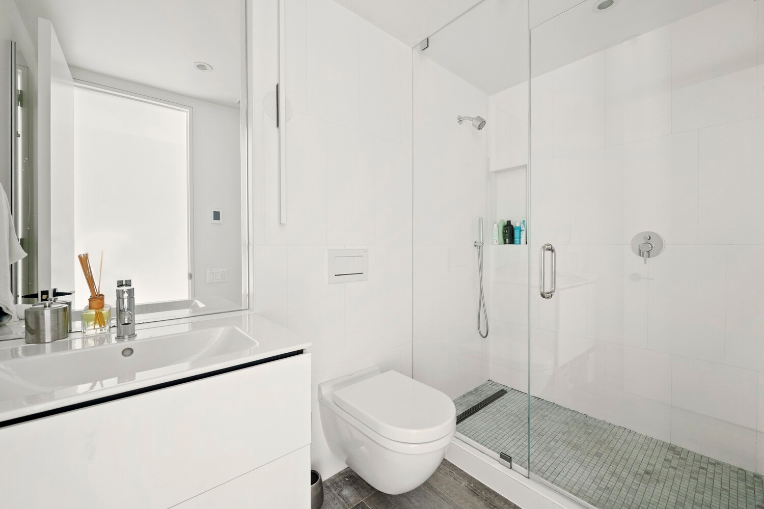 On the third floor, two generously proportioned bedrooms each feature en-suite bathrooms, complemented by a spacious secondary living area and a dedicated laundry room. The top floor is devoted to a serene primary suite, complete with a five-piece bath, walk-in closet, and a tranquil bedroom overlooking the leafy treetops of Clinton Street. This level also includes a home office and access to a large private terrace.