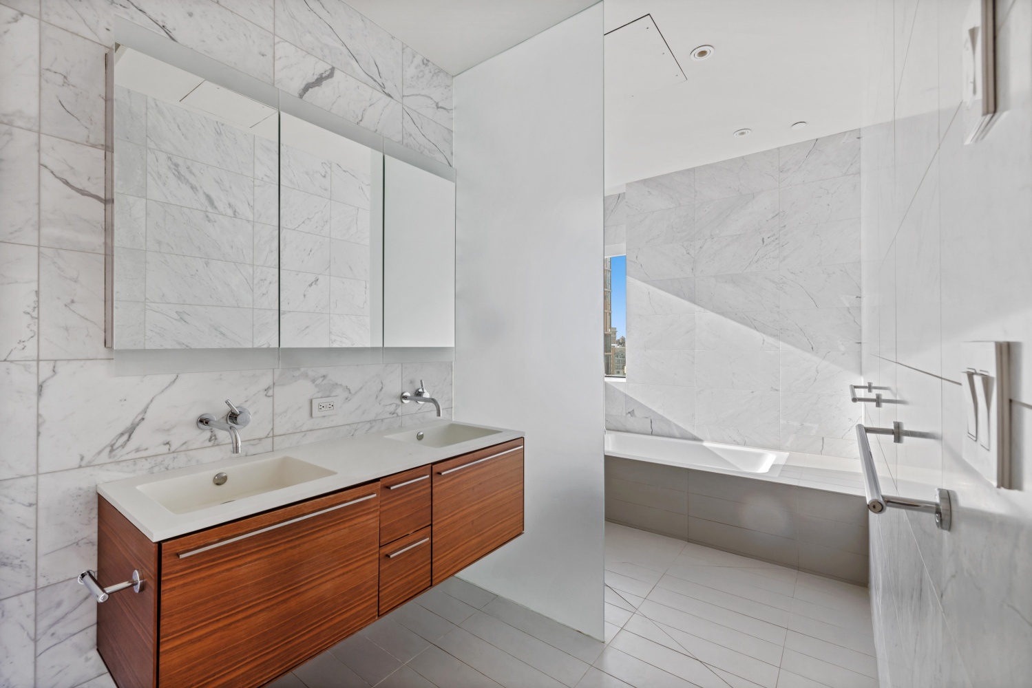 Ascending the dramatic windowed staircase with glass railings, the upper level reveals two luxurious en-suite bedrooms. The primary suite offers wall to wall and floor to ceiling views of Manhattan that would make anyone feel like they are waking up fully immersed in a dream. The peaceful retreat featuring a private balcony, custom blackout shades, and a windowed walk-in closet are completed by the spa-inspired primary bath showcases a floating double vanity, wall-mounted fixtures, exquisite marble tilework, and a wet room combining a rainfall shower and deep soaking tub all washed in sunlight.