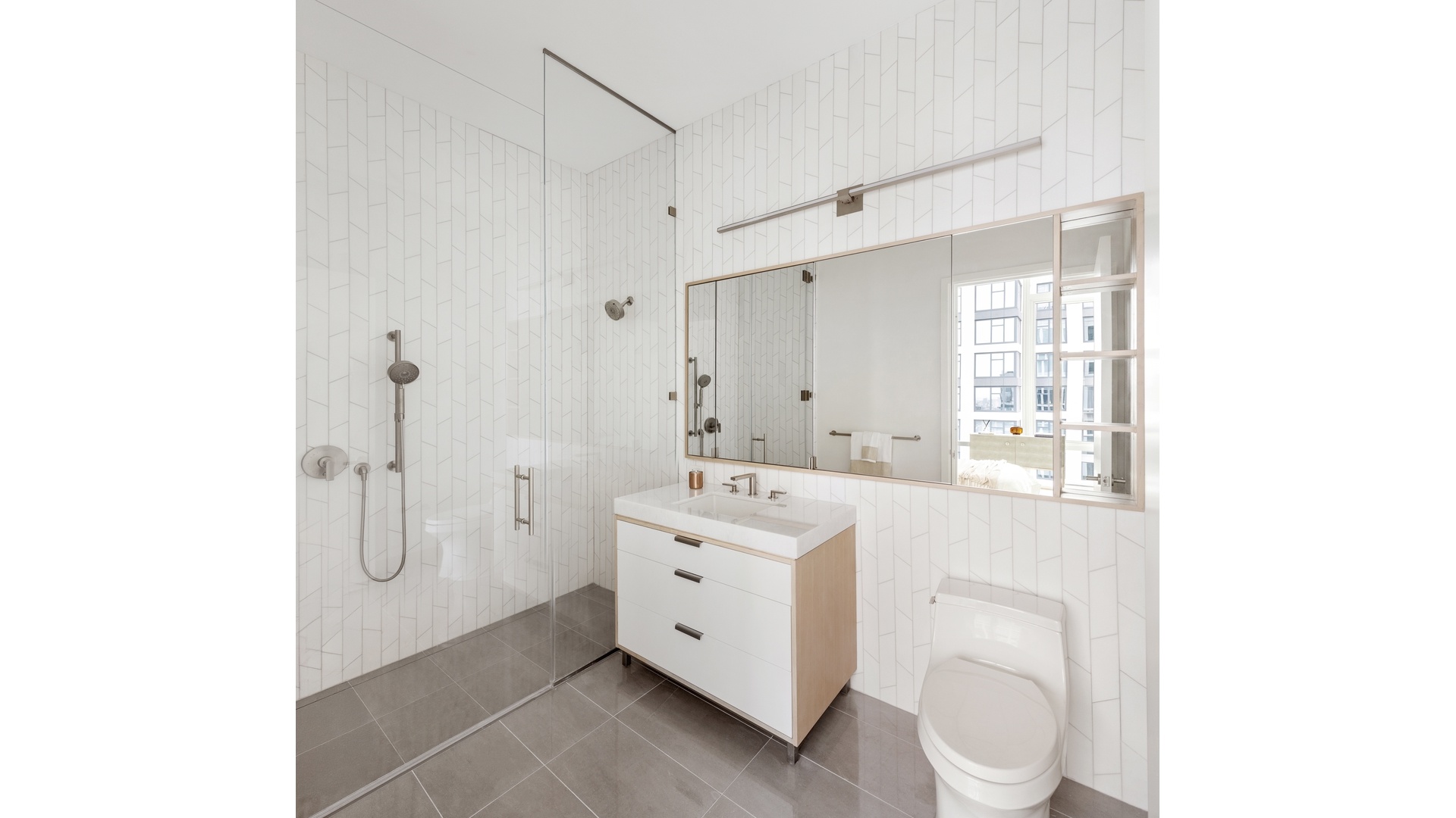 -Custom white oak vanity with brushed nickel pulls and accents