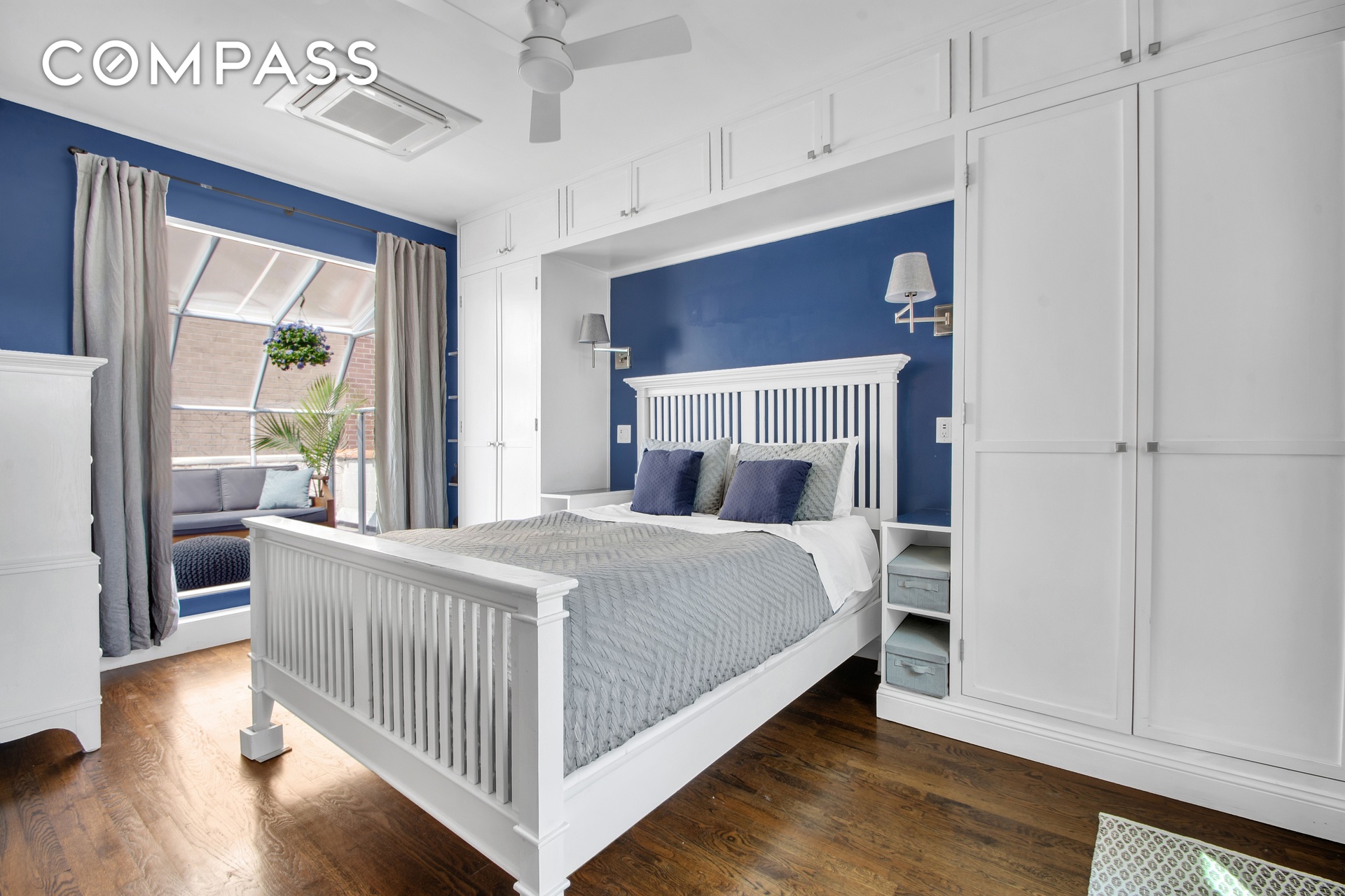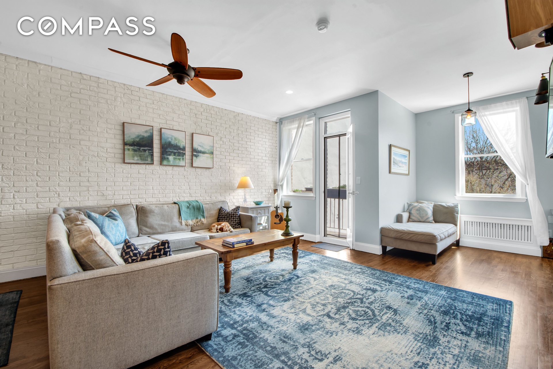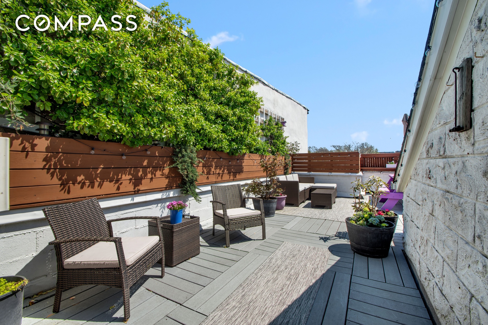 The unit has been fully renovated with mini-split ACs, garbage disposal, a new boiler and hot water heater, new decking and drainage, and a new roof. All of your storage needs are met with smart built-ins, abundant kitchen cabinetry, and a 247 sf attic. If you need more, there’s additional shared storage in the common hallway and basement.