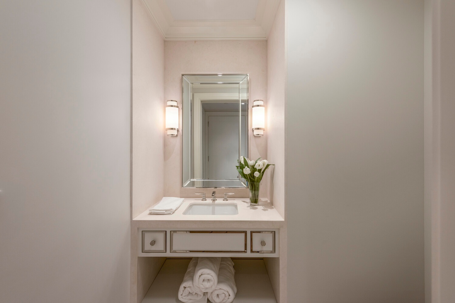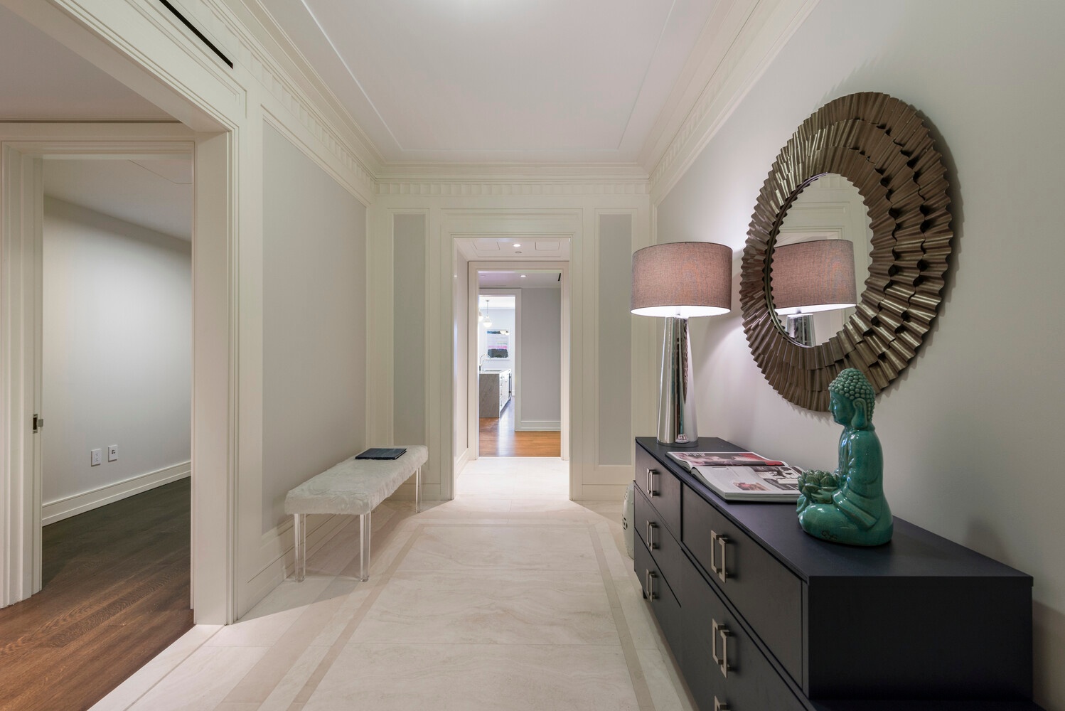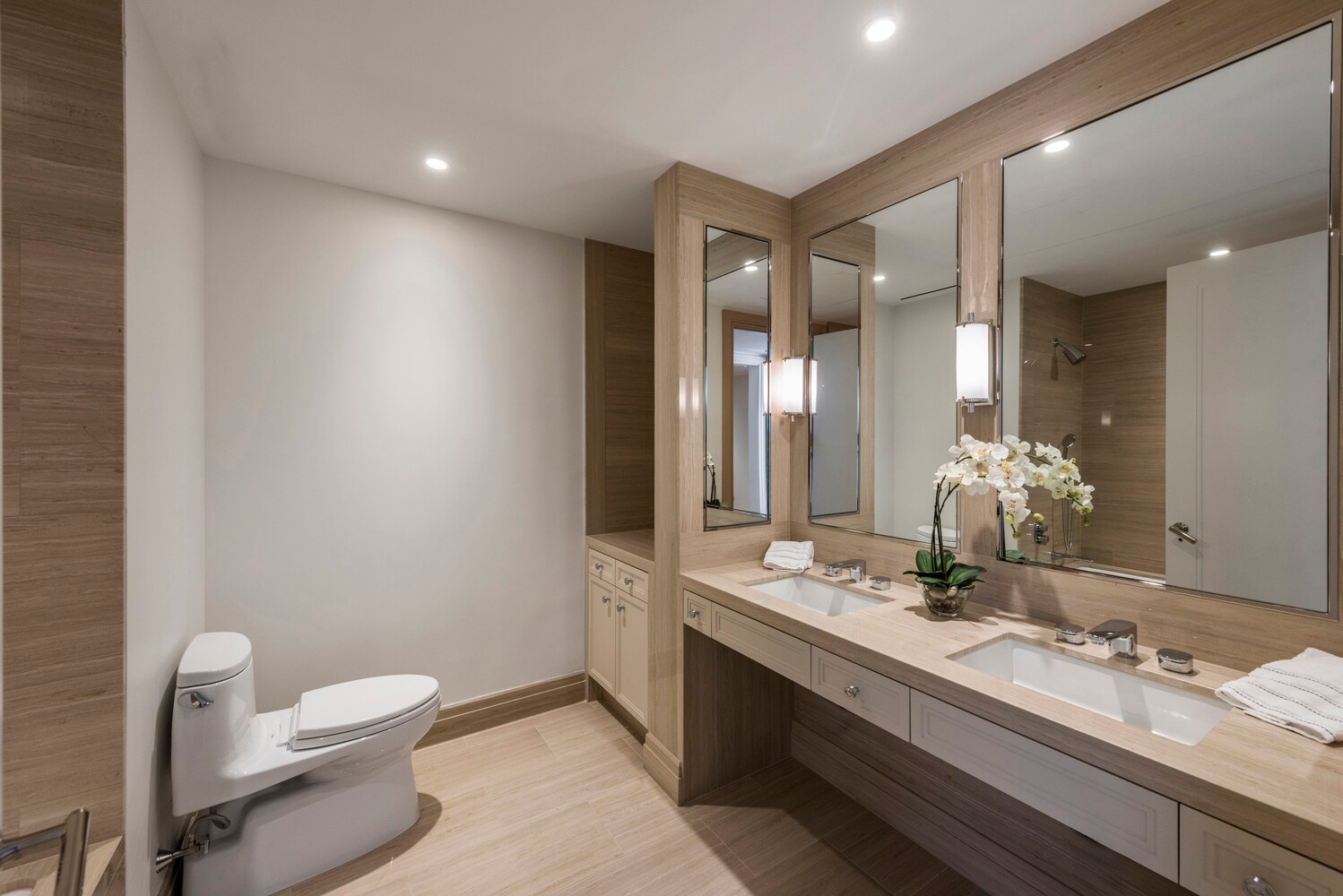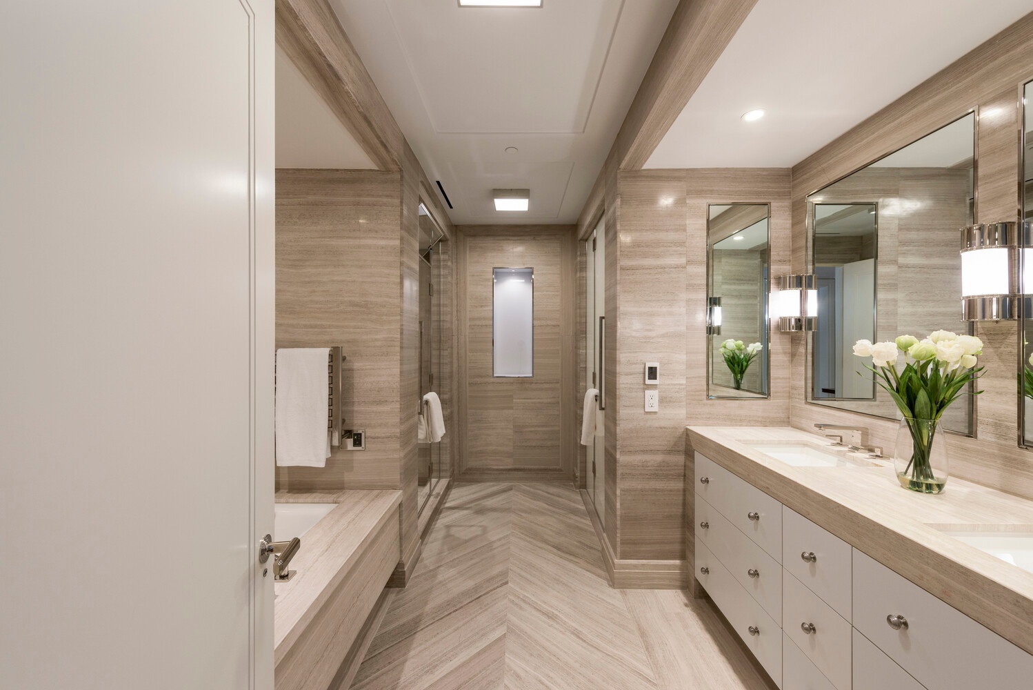 Privately situated, the primary suite is a true retreat, offering dual walk-in closets and a spa-quality five-fixture bathroom clad in elegant marble, with a soaking tub, glass-enclosed shower, and double vanity. Three additional bedrooms are generously proportioned, all enjoying beautiful light and thoughtfully designed storage, with luxurious marble bathrooms to match.