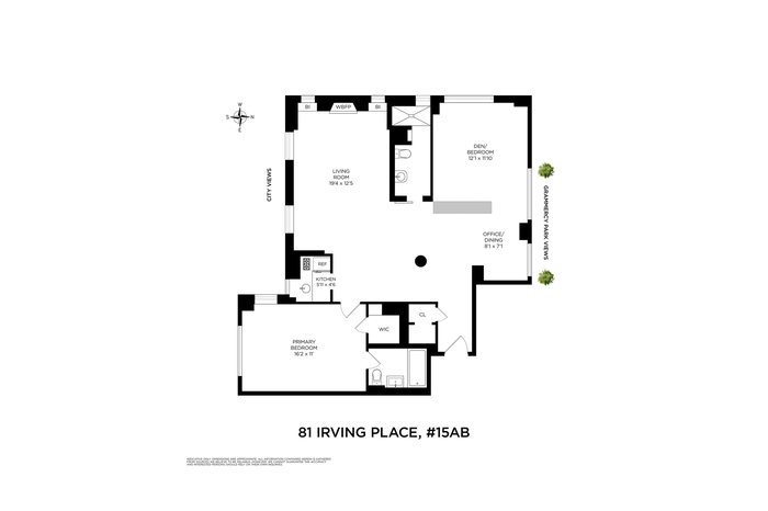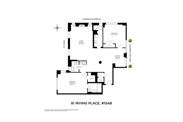 Sophisticated, sun-filled and serene 2 Bedroom / 2Bath prewar apartment features a superb modernist open-plan with exceptional flow and usage options, LR w/ wood burning fireplace, two gorgeously renovated bathrooms (one w/ walk-in shower and one w/ bathtub), and stunning finishes and design details throughout, including beautiful steel casement windows w/ captivating, high-floor, gargoyle/skyline/direct Gramercy Park views. Alternate plan shows Park facing room (currently divided via wall unit furniture) with an easily constructed wall w/ closets and entrance door, plus an expanded kitchen, plus a washer dryer; all of which is easily added if the new owner wishes to undertake an easy project.