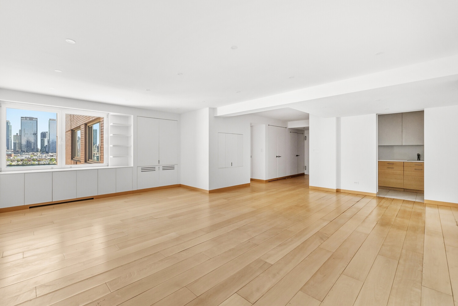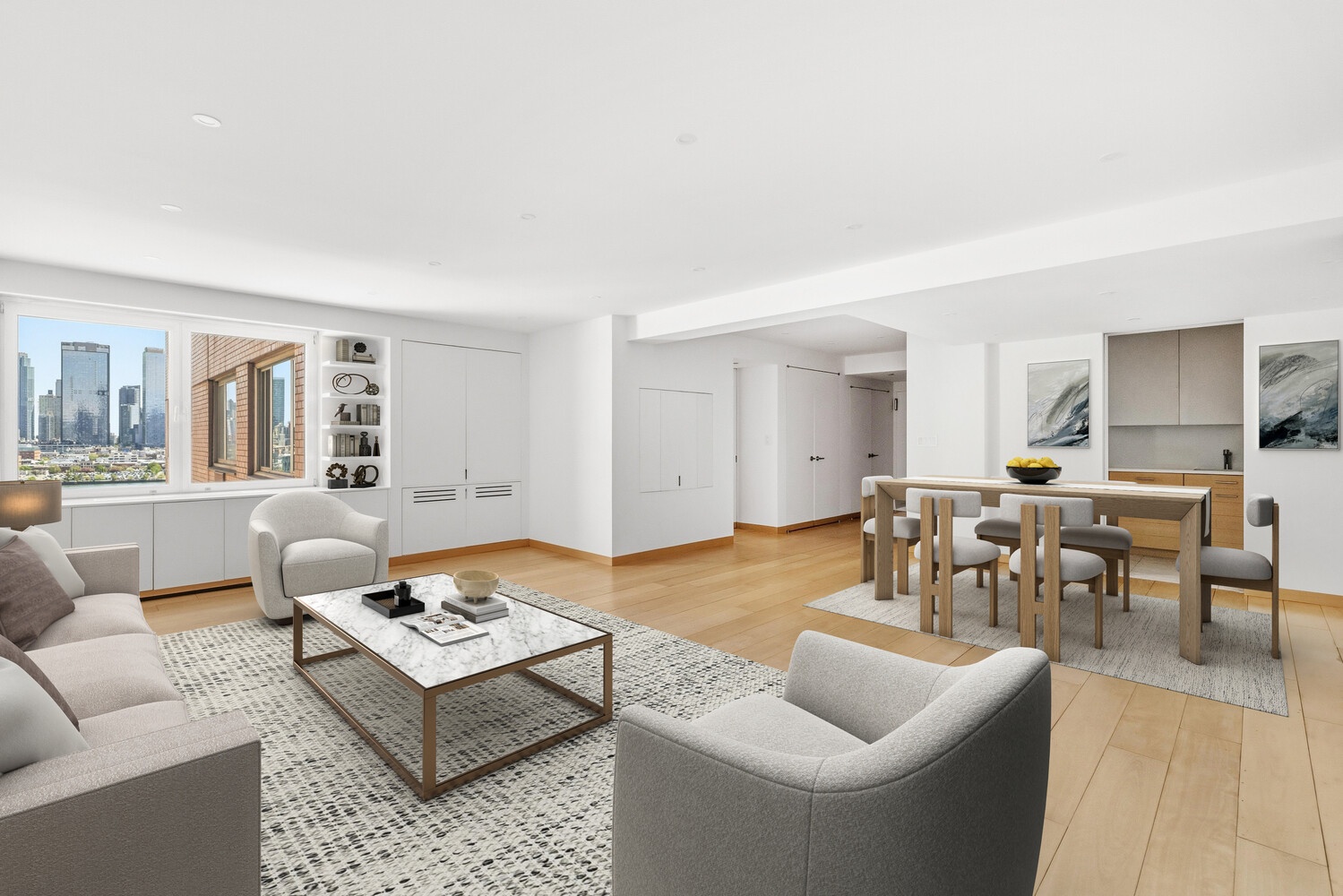 A gracious entry gallery welcomes you with three oversized closets, setting the tone for the home's exceptional storage throughout. The sun-filled living room showcases unobstructed river views, creating a serene and inviting atmosphere. Adjacent to the gallery, a dedicated dining alcove is perfect for both intimate meals and larger gatherings.