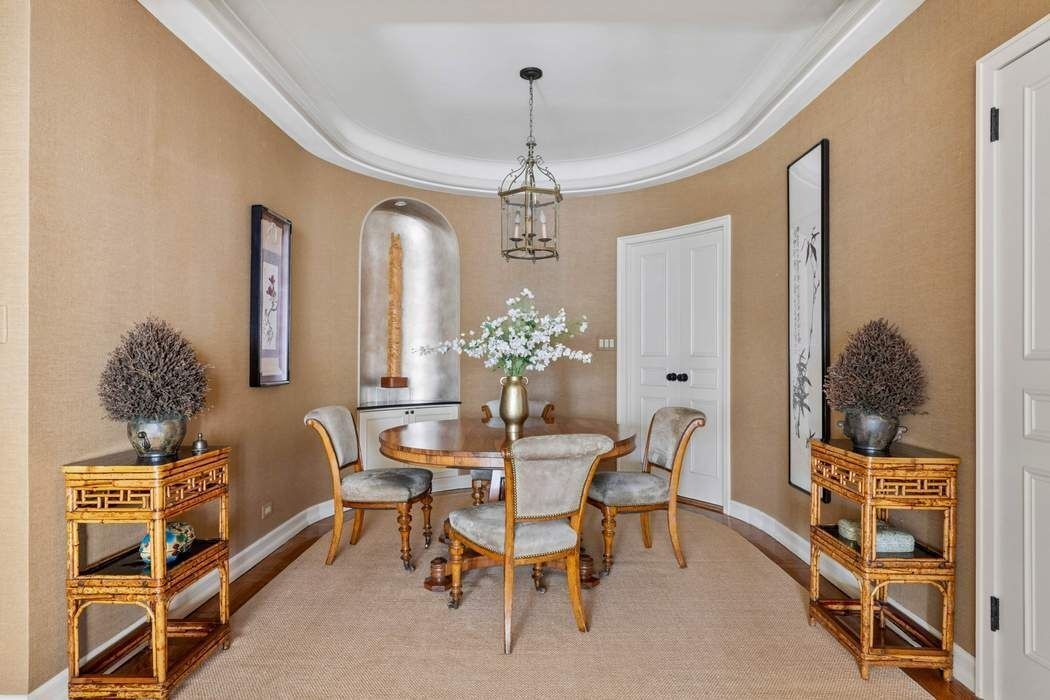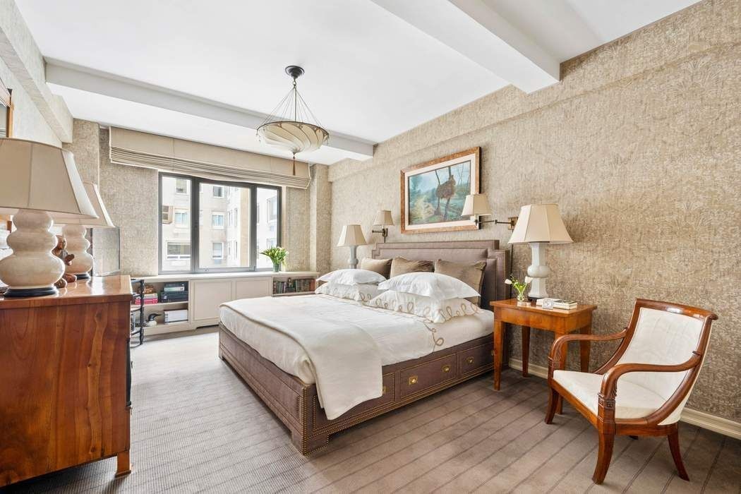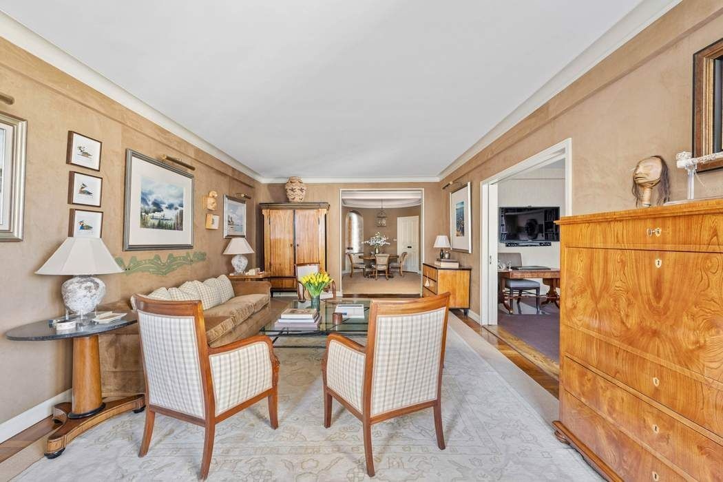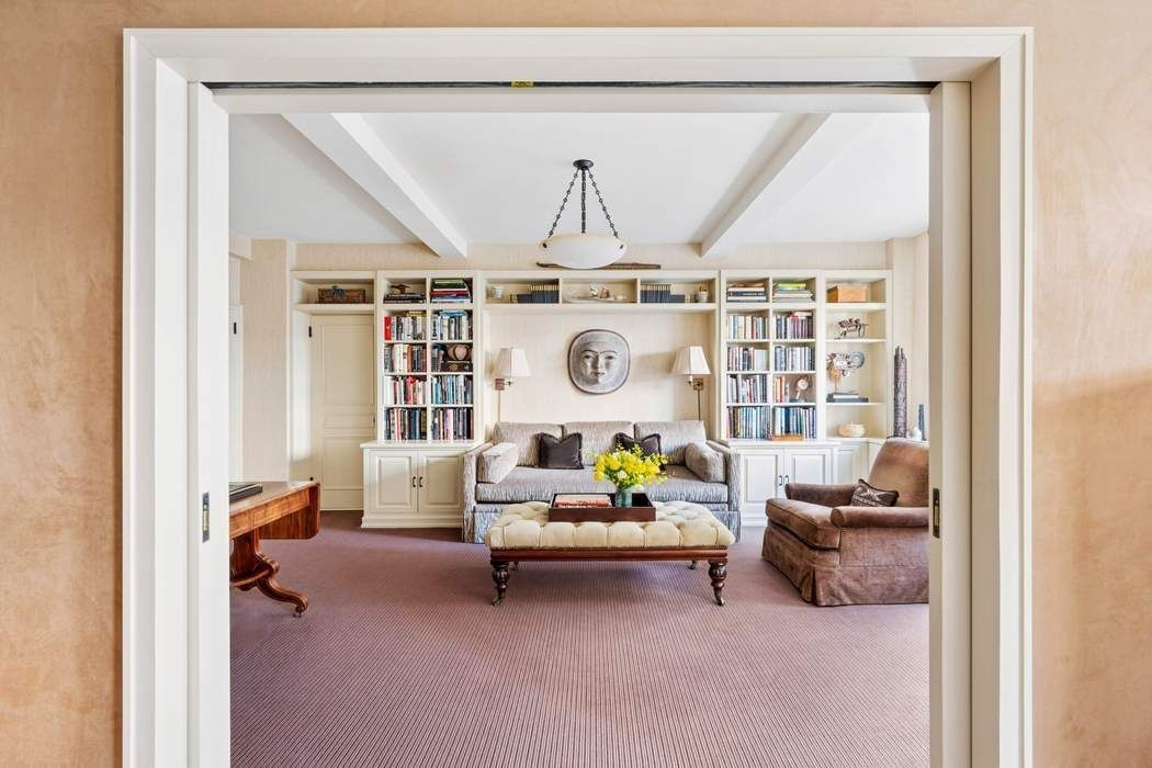 Move right into this rarely available, high-floor E-line residence, perfectly positioned in one of Fifth Avenue’s most distinguished white-glove cooperatives, designed in 1939 by acclaimed American architect Emery Roth. This gracious two-bedroom home is distinguished by its beautiful proportions, thoughtful layout, and high-quality finishes. Designed for versatile entertaining, the expansive living room showcases high beamed ceilings and gorgeous hardwood floors, seamlessly flowing into Emery Roth’s signature curved dining oval. The living room overlooks 69th Street to the north and is highlighted by a stunning west-facing bay window, capturing framed Central Park views and glowing late-afternoon and evening light. Separated by well-crafted pocket doors, one of the original bedrooms has been transformed into a stunning library, also facing onto 69th Street, with artfully designed custom millwork. A lovely ensuite bathroom with floor-to-ceiling tile and a large glass shower completes the space, which can easily be restored to its former use as a bedroom. A butler’s pantry leads to the windowed kitchen, which showcases custom cabinetry, granite countertops, abundant storage, a breakfast counter, and high-end appliances including Thermador, Sub-Zero, and Asko. The primary bedroom is a private retreat, featuring ample closet space and a beautifully designed bathroom with marble and mosaic tile, a deep soaking tub, and a separate glass-enclosed shower. The residence is equipped with through-wall A/C throughout, and a private storage bin transfers with the sale. In-unit washer/dryer is permitted with board approval.