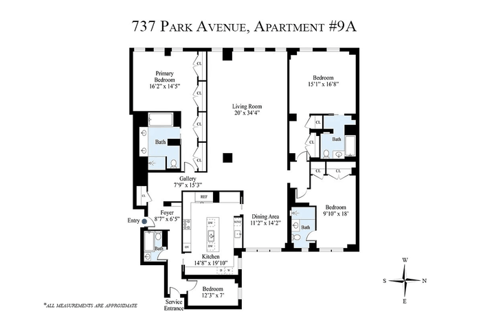 This Classic 7 Room, spacious Three-Bedroom plus Staff Room and Bath is a unique apt boasting higher ceilings than the other Apartments in the Building with open and sunny exposures West, East and North. The very spacious 34-foot Living Room, the Primary Bedroom and one additional Bedroom all have wonderful, West facing, Park Avenue exposures. At approximately 3,164 square feet, the residence is flooded with sunlight from Park Avenue and from the East.