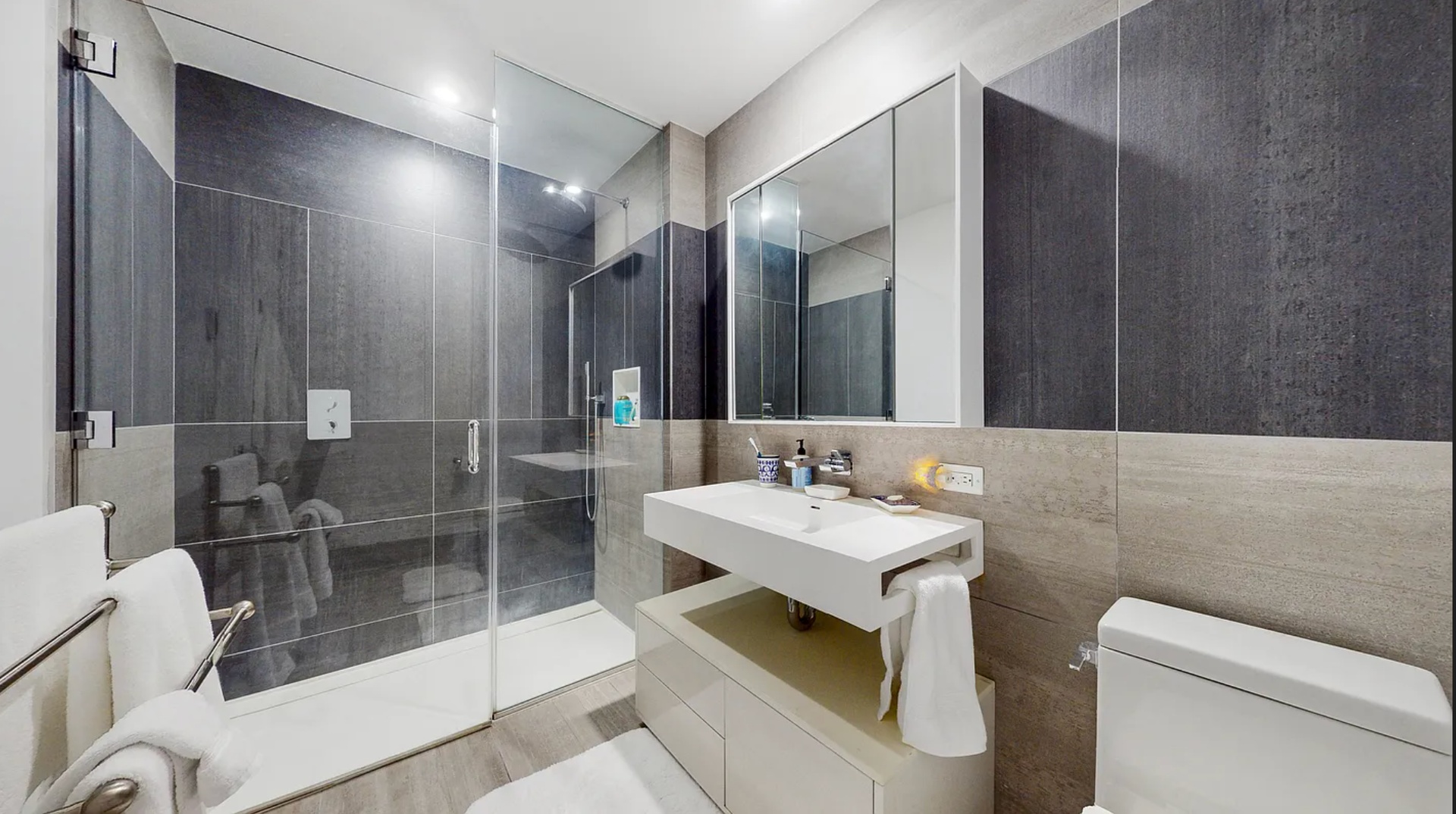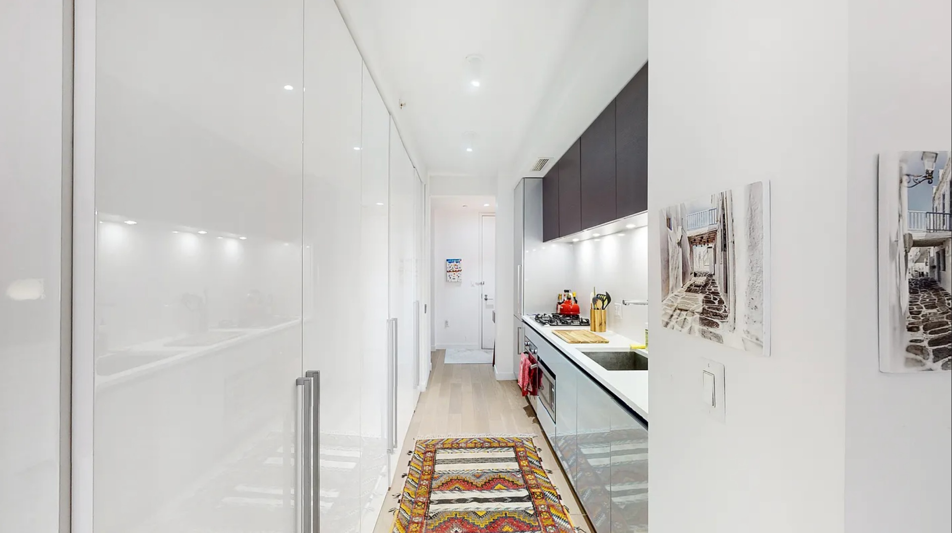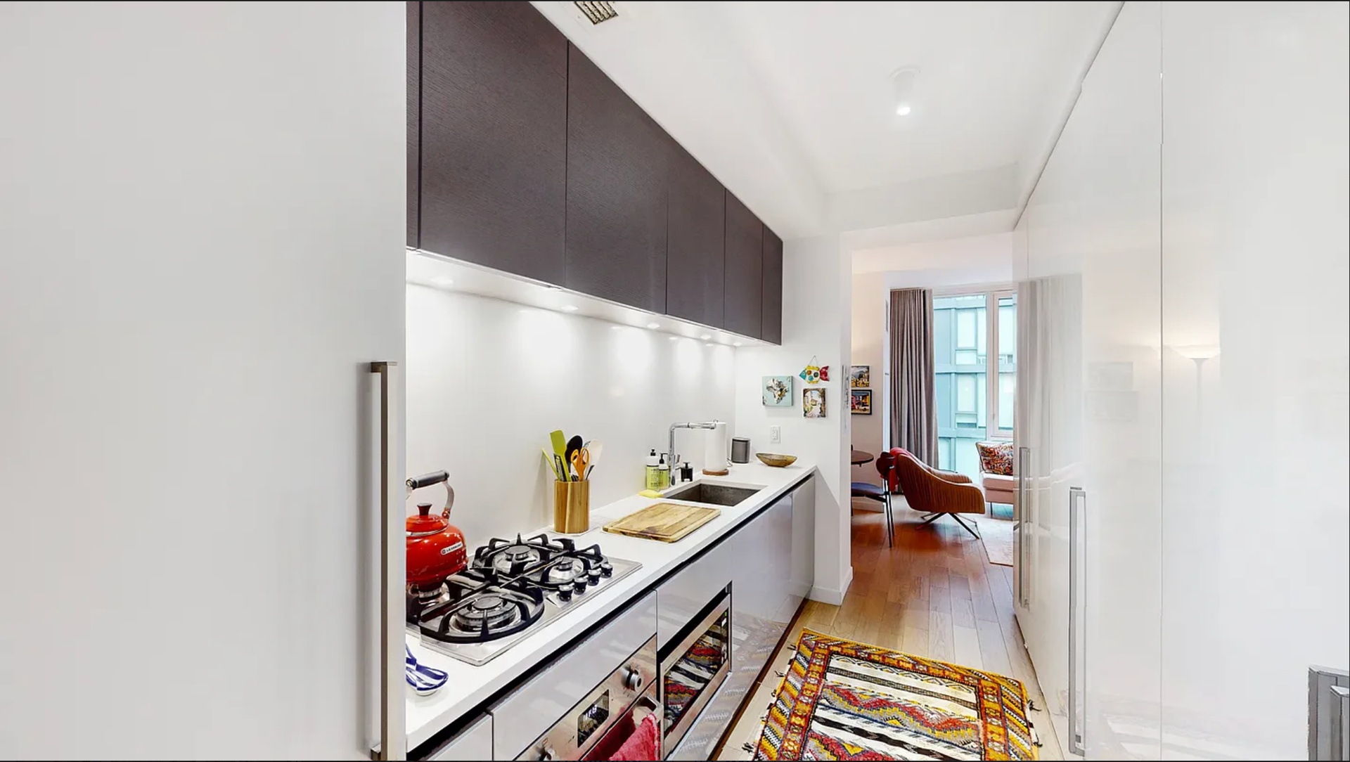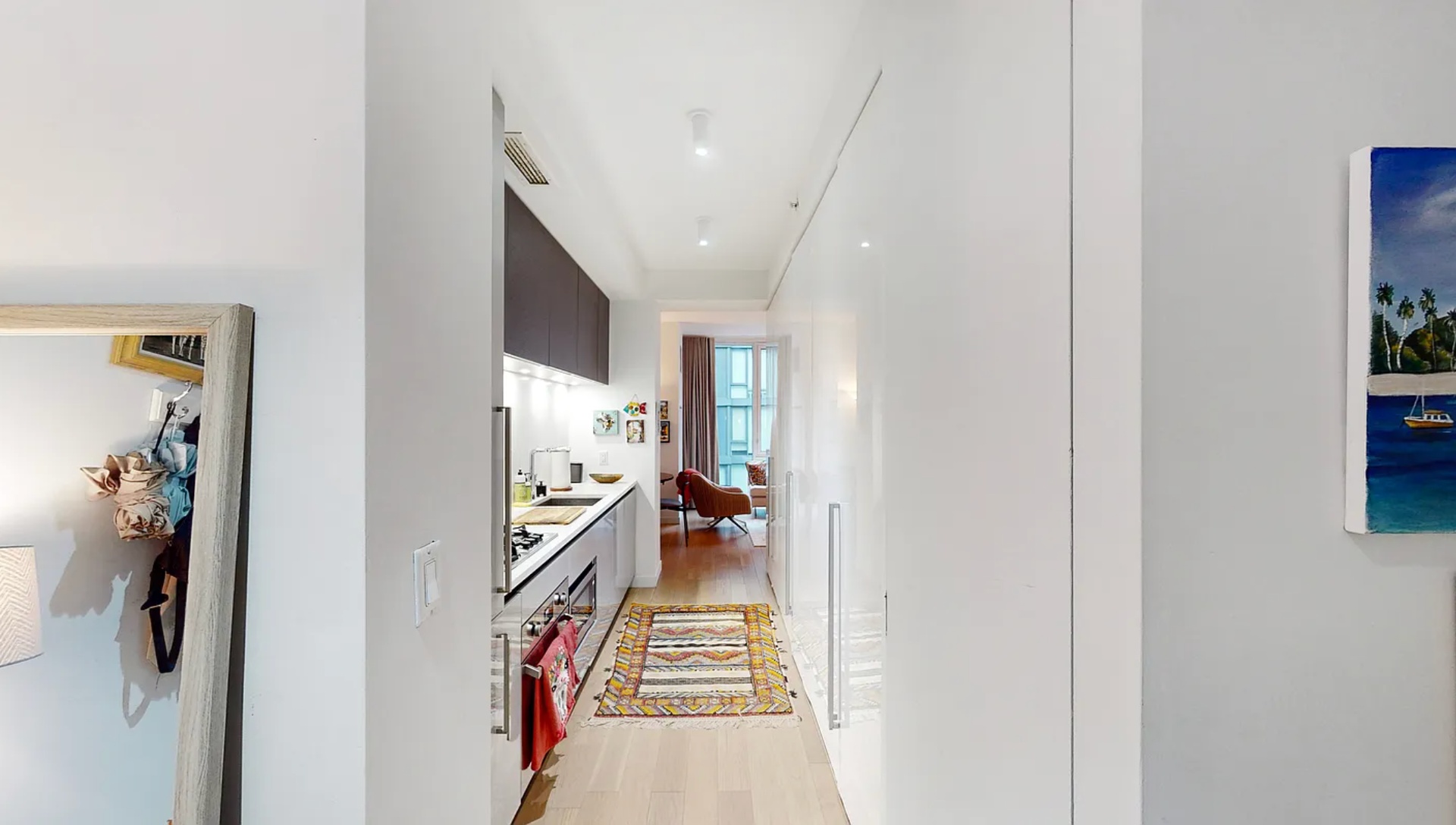 Inside, you’ll find white oak hardwood flooring throughout, sleek Italian kitchen cabinetry, and generous closet space rarely found in a studio. The spa-like bathroom features a floor-to-ceiling glass walk-in shower and modern finishes. Individually controlled central heating and cooling ensure year-round comfort, and the in-unit washer/dryer adds everyday convenience.