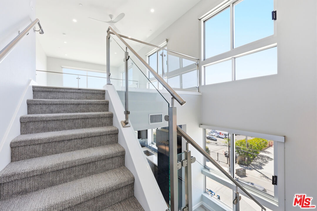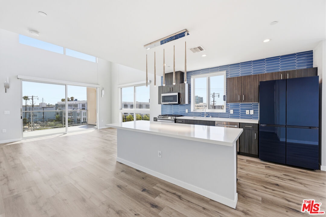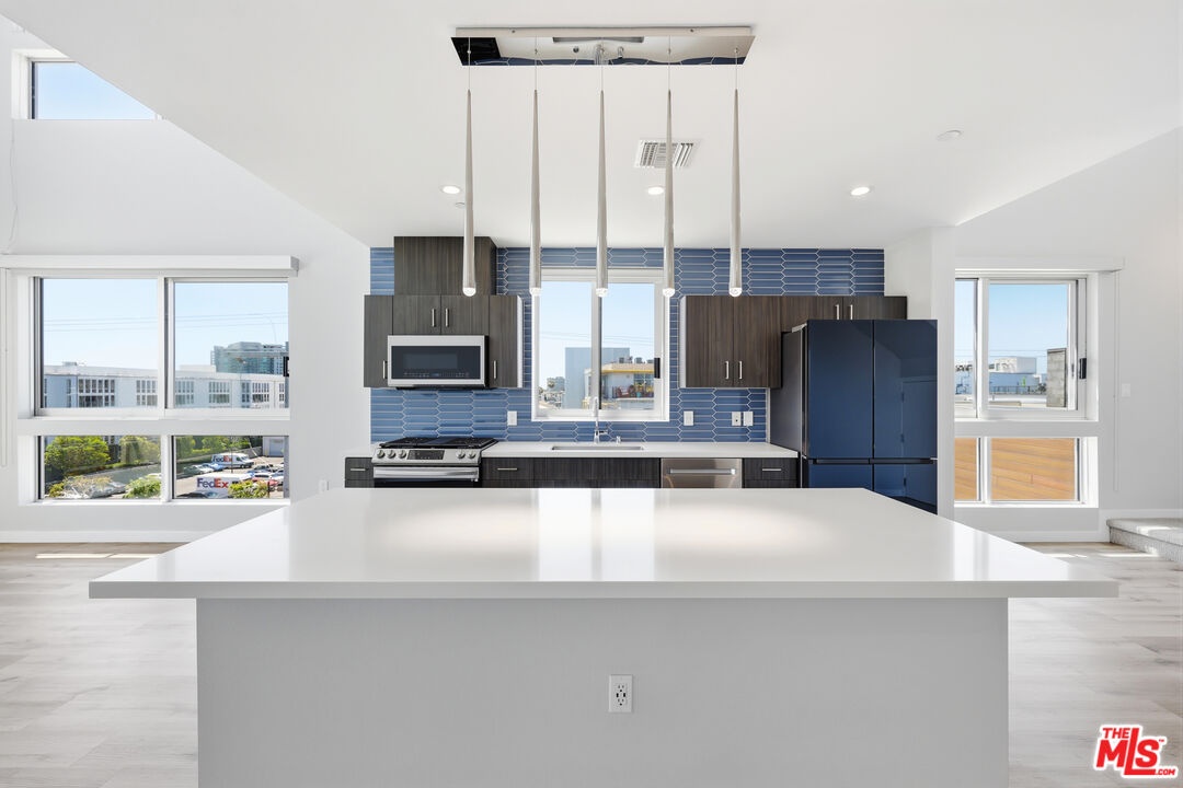 Penthouse Living Elevated. Discover a rare 1,930 sq. ft. two-level penthouse in an intimate 67-unit boutique building, ideally positioned in one of the Westside's most coveted enclaves. Designed for both comfort and impact, this light-filled residence features walls of glass and sweeping views from nearly every room. Perched on the top floor with only one shared wall, the home offers exceptional privacy along with 2 primary suites and 3 bathrooms. The open-concept living and dining areas flow seamlessly to a private balcony, creating effortless indoor-outdoor living. At the heart of the home, the chef's kitchen showcases quartz countertops, new appliances, custom cabinetry, and designer finishes. The main level includes a spacious ensuite bedroom with a beautifully appointed bath and custom walk-in closet, along with a powder room, washer/dryer closet, and abundant storage; ideal for guests or flexible living. Upstairs, the primary suite serves as a true retreat, complemented by a private loft or office with stunning sunset views over the Santa Monica Mountains. The spa-inspired bath features a soaking tub, separate shower, dual quartz vanities, refined finishes, and a custom walk-in closet. Additional highlights include a split HVAC system with independent climate control on each level, automatic window shades, and premium fixtures throughout. Residents enjoy a full suite of amenities, including weekday concierge service, a furnished lobby, bike storage, coffee bar, fitness center, clubhouse, pool, courtyard with modern lounge seating and BBQs, plus complimentary high-speed internet and DirectTV. Located in the heart of Marina del Rey, just moments from Venice Beach, Abbot Kinney, top dining, shopping, Alla Park, and LAX, this home captures the essence of sophisticated coastal living.