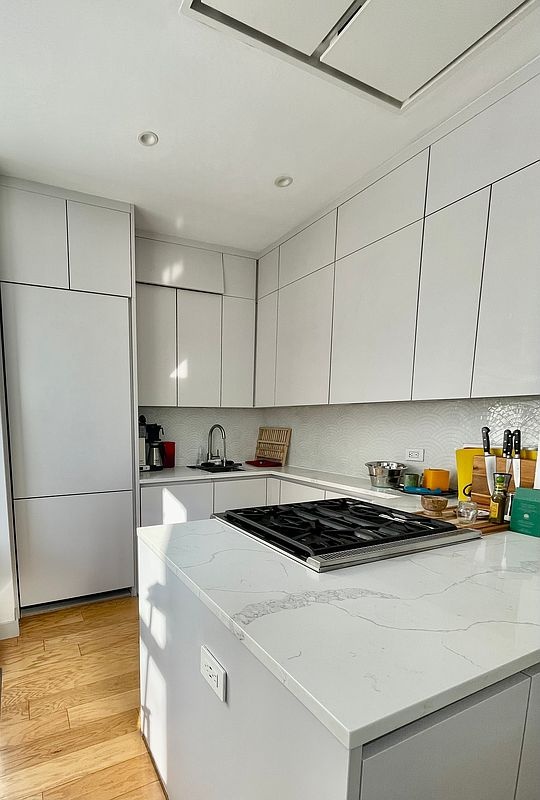 This Super Sunny 683sf Luxury loft Apartment Plus a 330sf Furnished Private Terrace is Perched high on the 23rd floor with views of the WTC, Seaport, East River and Brooklyn. There are five huge six ft Southwestern facing windows leaving the apartment flooded with natural / Direct Sunlight all day long. The living room has a custom built dining nook and the open chef's kitchen has been meticulously designed by the German Kitchen Center featuring Nobilia custom cabinetry with Thermador touch-to-open paneled refrigerator, Thermador range and dishwasher. Waterfall Calcutta quartz countertops and tastefully tiled backsplash . There are 10 1/2 foot vaulted ceilings, 5-inch wide plank Oak floors throughout the apartment, Hunter Douglas Powerview motorized shades, and Haiku Voice-controlled fans. This home boasts ample storage space, including Italian Flou custom outfitted closets.