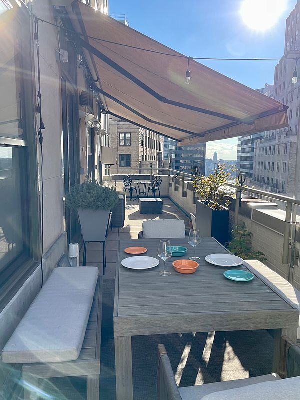 The oversized private terrace comes furnished and runs the length of the apartment. It has two seating areas perfect for dining; sunbathing and entertaining. This four-season space features an electric awning that shades you from the hot summer days and two wall-mounted heaters that warm you during the winter months.