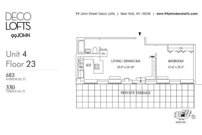99 John is a full service condo with a landscaped roof deck with awesome city and river views, Garden with four grills, fitness center, and tenants lounge, valet service, 24 hour doorman and additional laundry facilities. Onsite Jubilee Supermarket.
